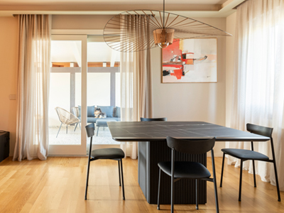 Gli arredi sono praticamente tutti su misura e su mio disegno, dalla cucina, al mobile tv, alla tavola da pranzo con top uguale al top della cucina.