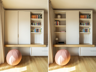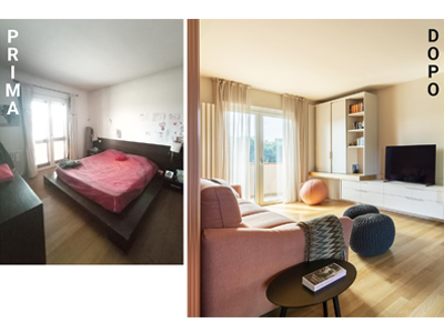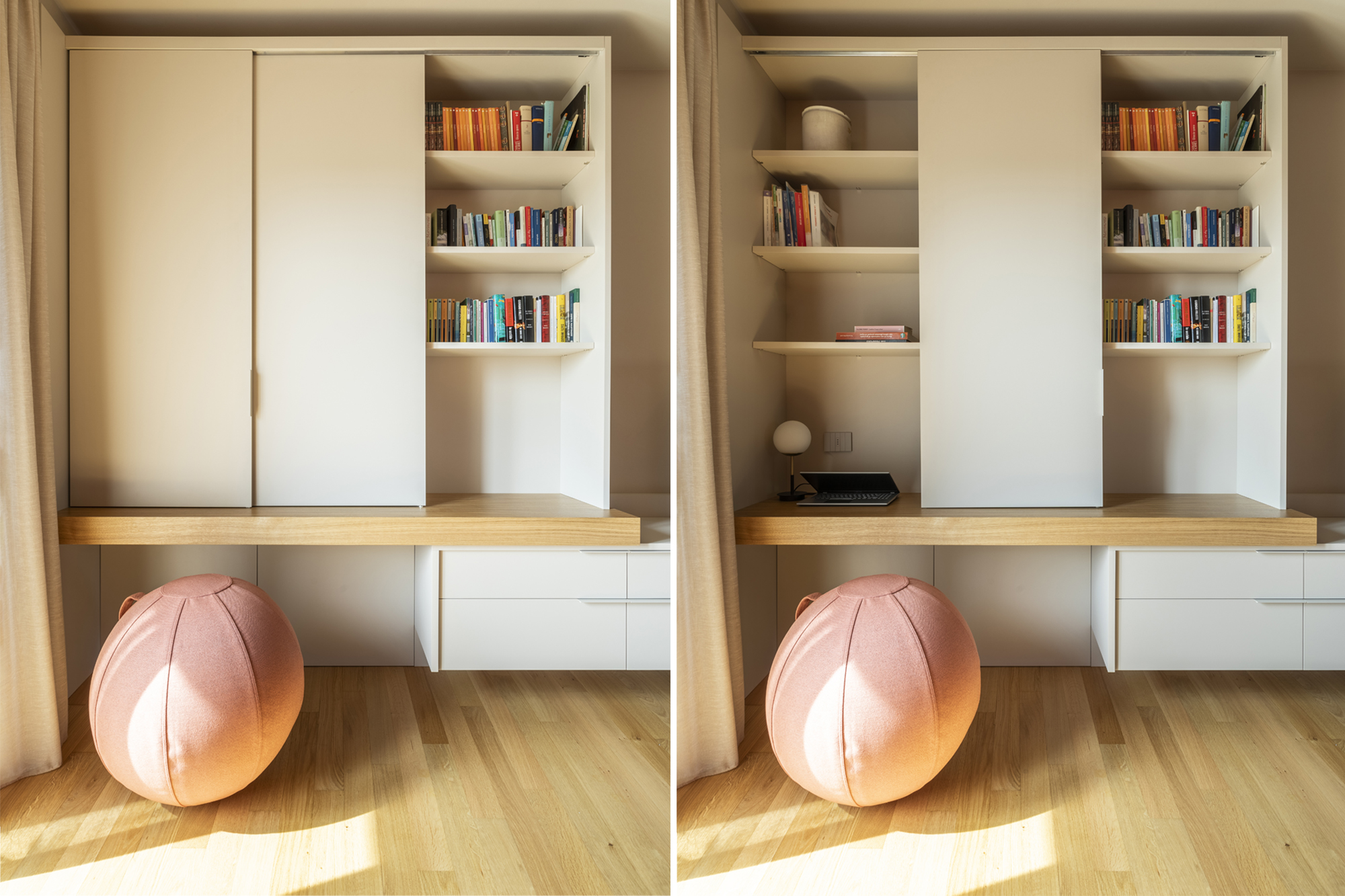 - L’angolo “home office” integrato e nascosto nella parete attrezzata della TV