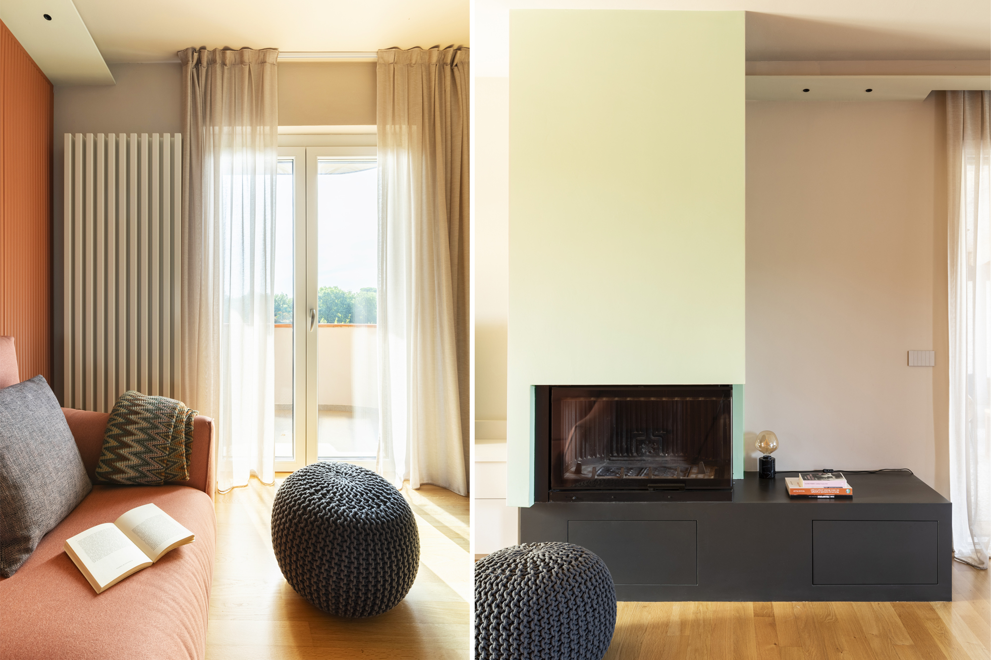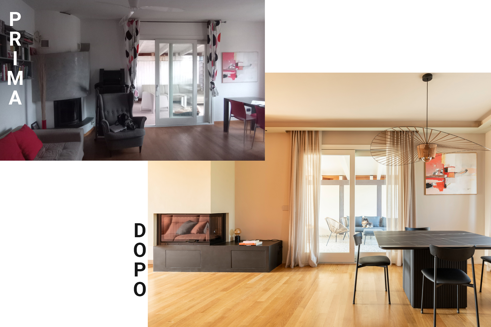 Rinunciare ad una camera da letto non è da tutti, ma i miei clienti che avevano già ristrutturato in precedenza il piano seminterrato, di camere ne avevano già tre e per loro erano più che sufficienti, per questo motivo mi hanno chiesto di eliminare la quarta camera a favore di una zona living più ampia e studiare il modo di ampliare la cucina senza spostarla. Eliminando un solo tramezzo non portante abbiamo potuto così usufruire della luce e della vista sulla campagna e il bosco circostante, che ci ha fornito immediatamente la palette colori perfetta: i colori caldi della campagna toscana e del bosco in autunno!