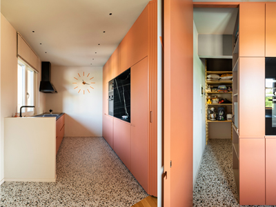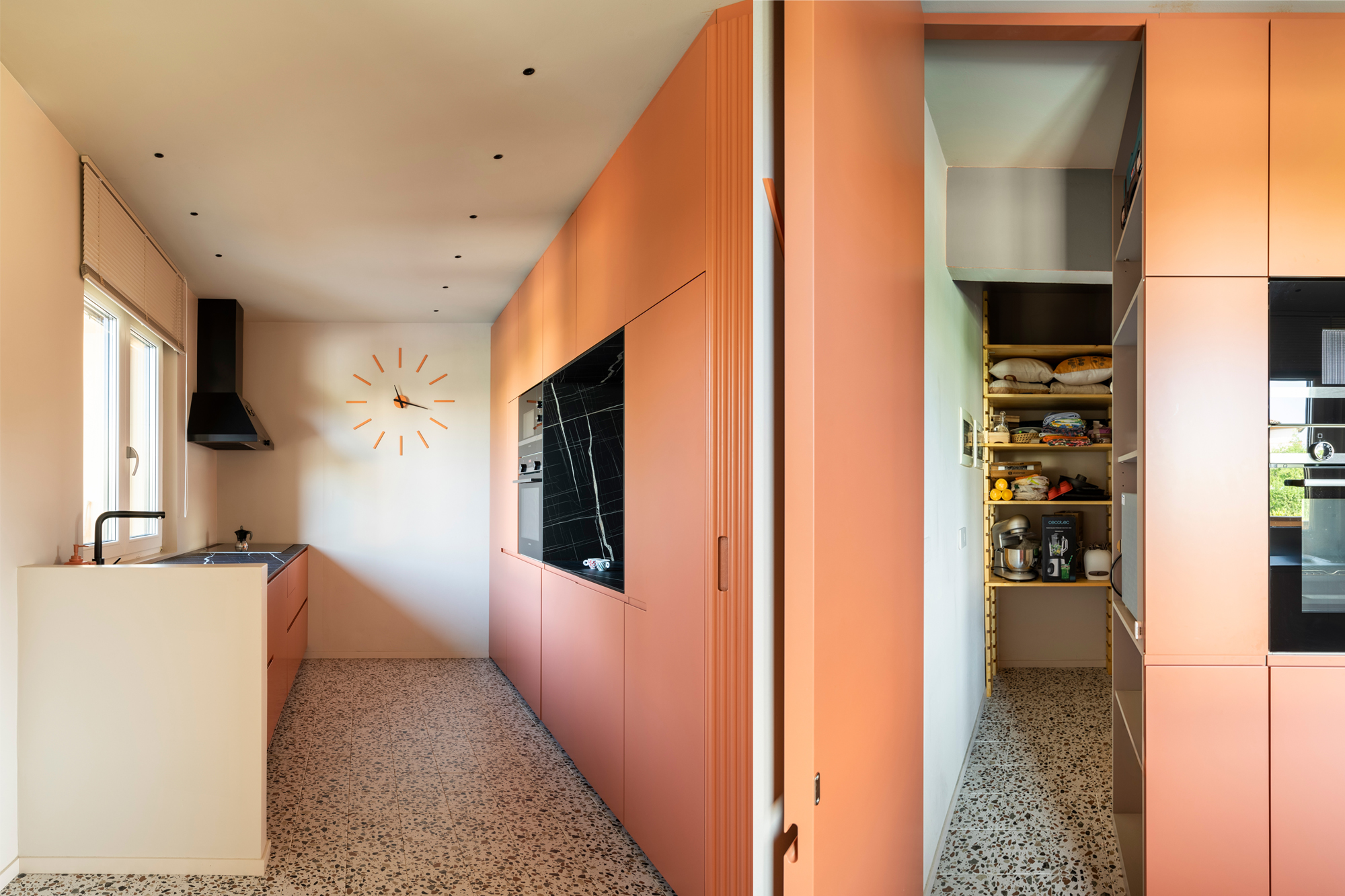 - La dispensa nascosta dalle ante delle colonne in cucina: il ripostiglio esistente è stato inglobato dagli arredi