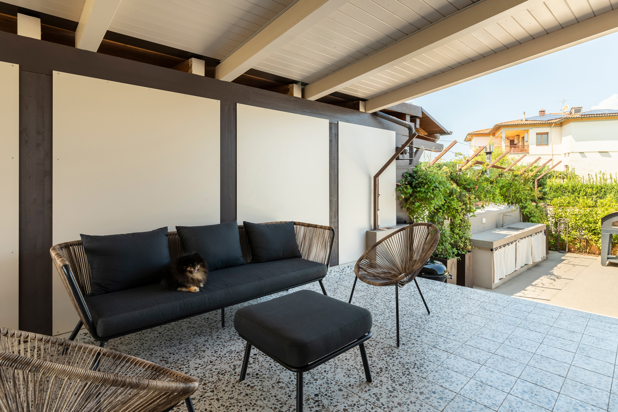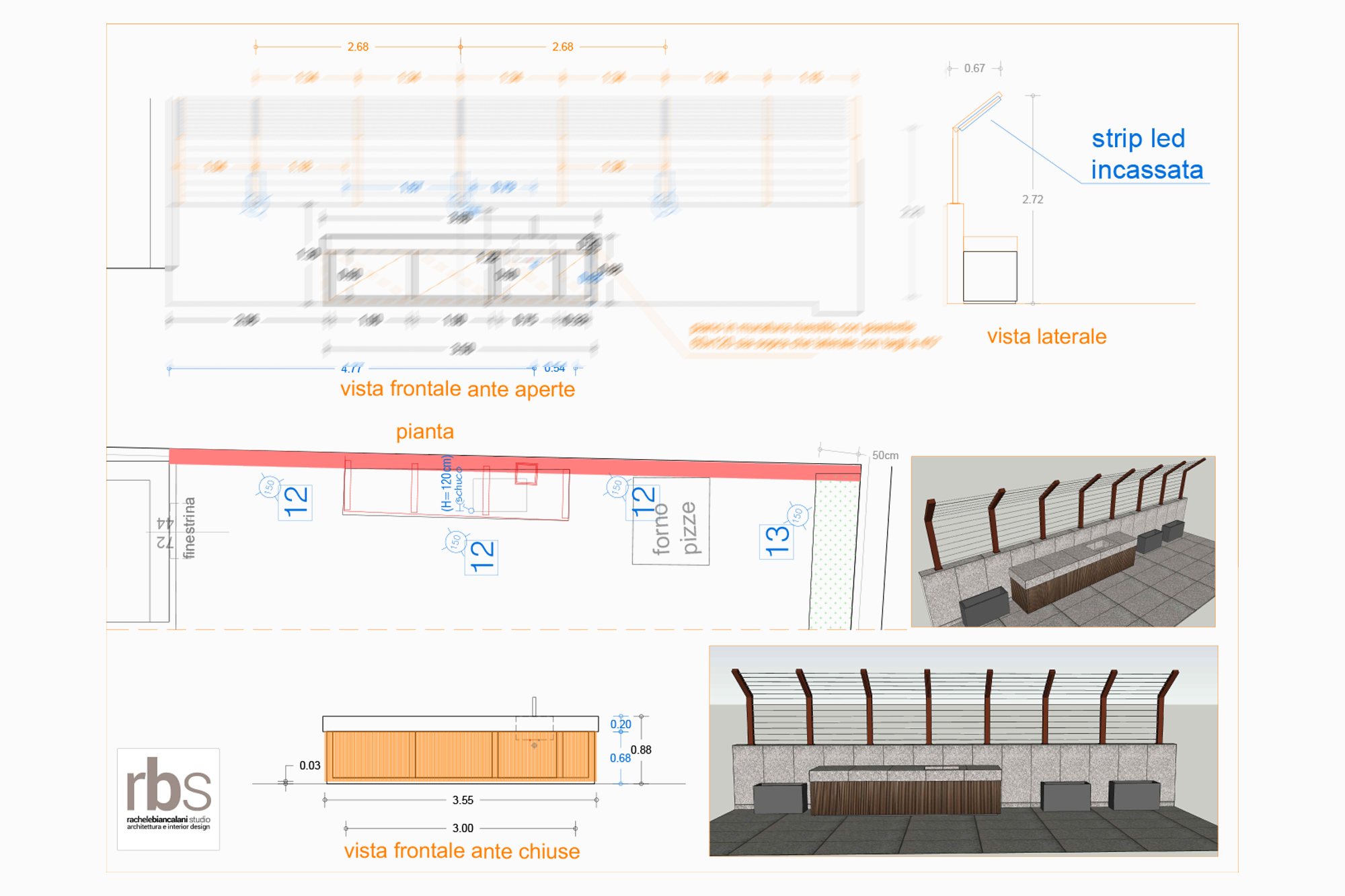 - La ringhiera sulla cucina outdoor studiata ad hoc per far arrampicare il gelsomino e le strip led integrate che illuminano la zona operativa