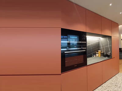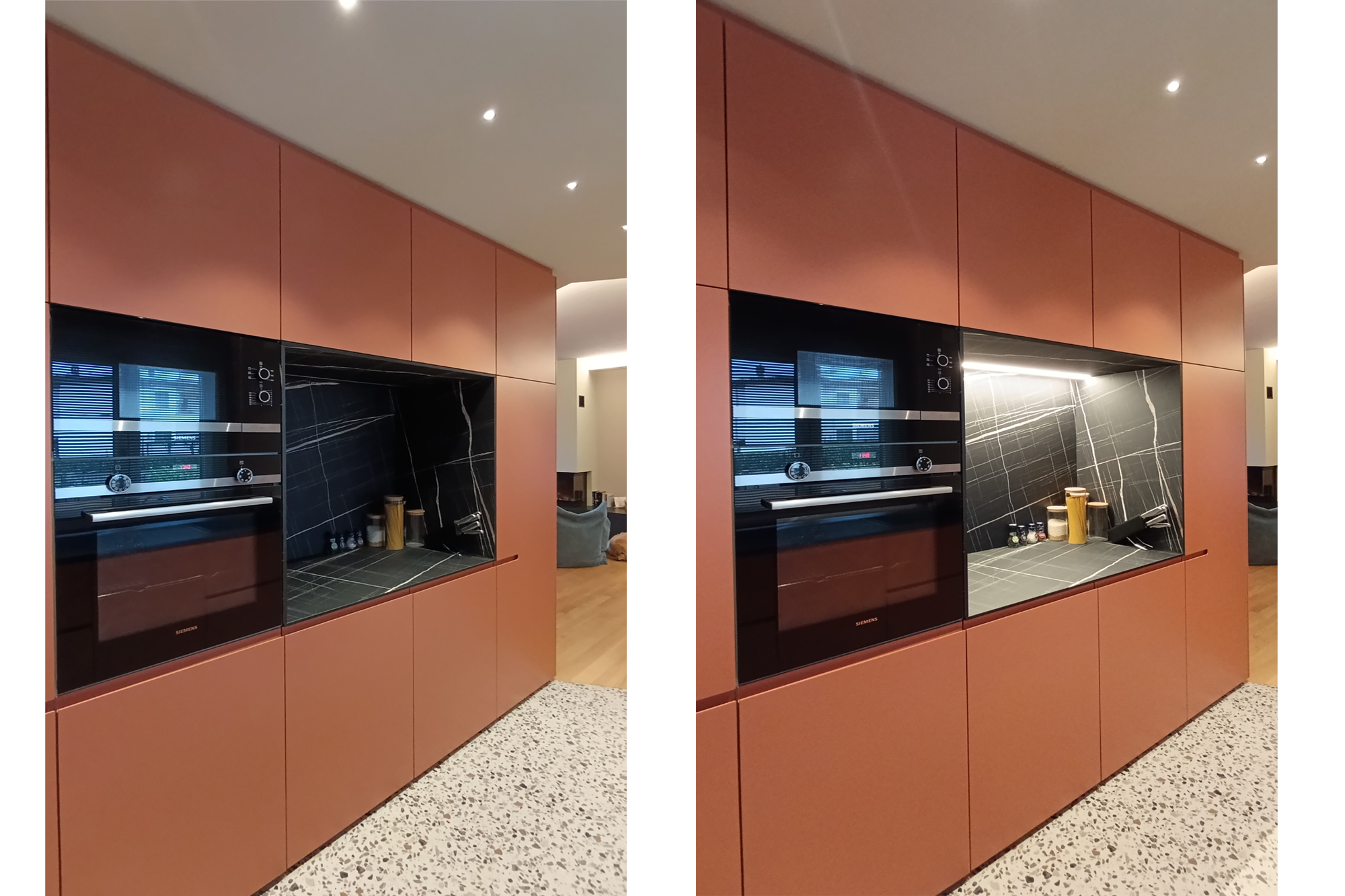 - La parete delle colonne cucina con il volume in negativo nero “scavato” tipo nicchia rivestito