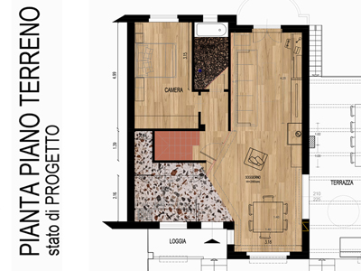 Materiali utilizzati a pavimento: parquet in rovere naturale posato a correre, grès porcellanato (effetto graniglia) in bagno, cucina e terrazze. Pavimento giardino esterno e cucina idem