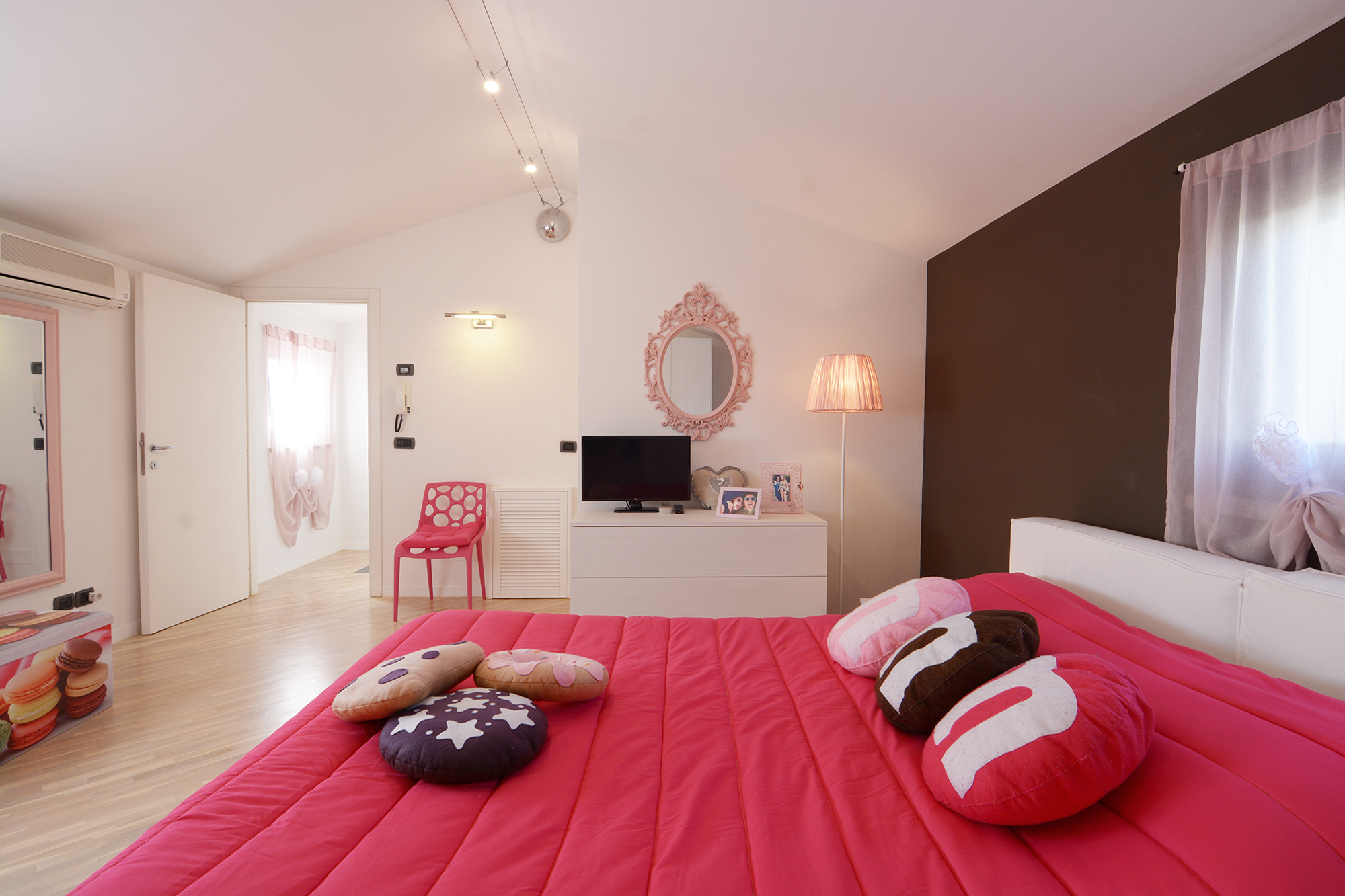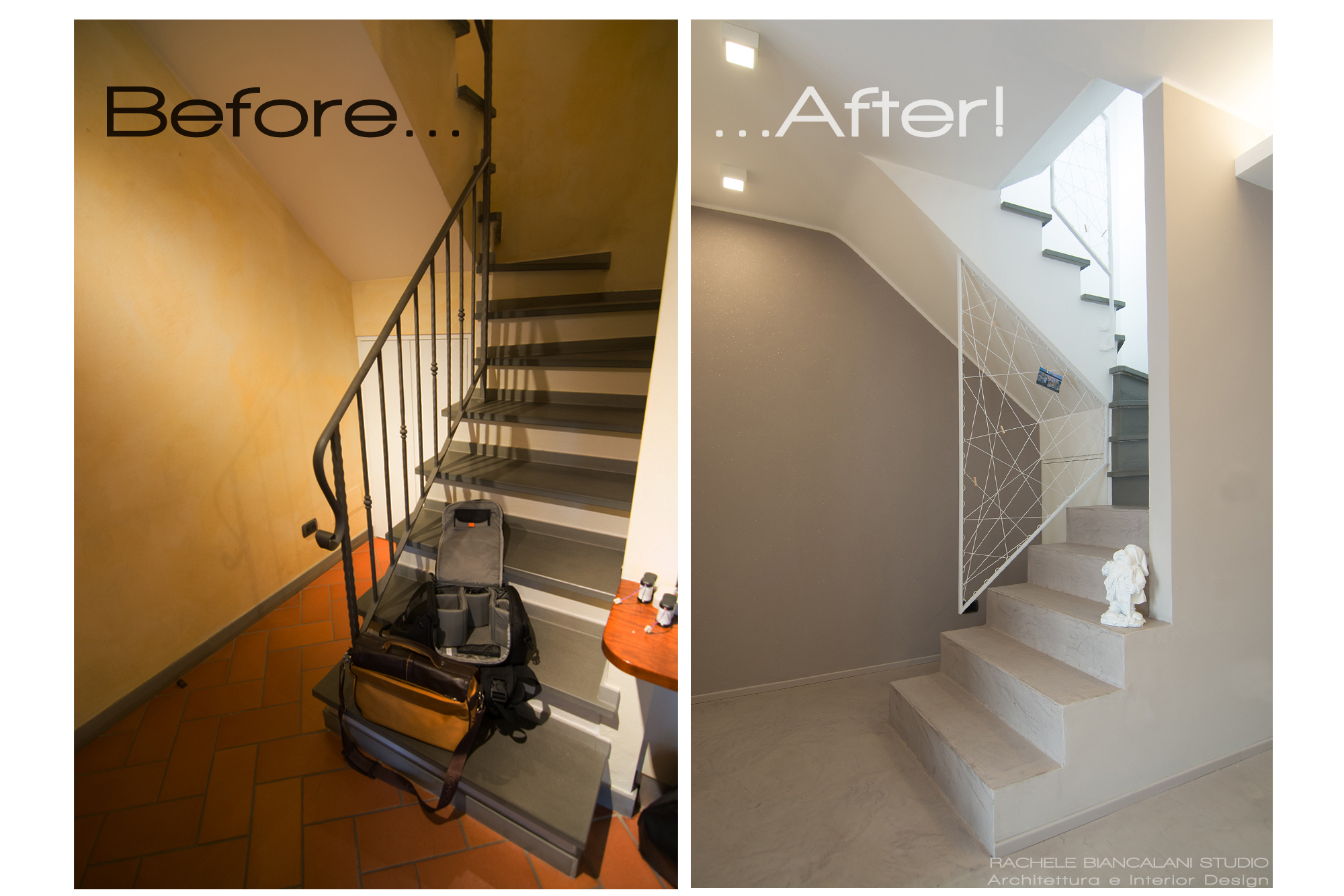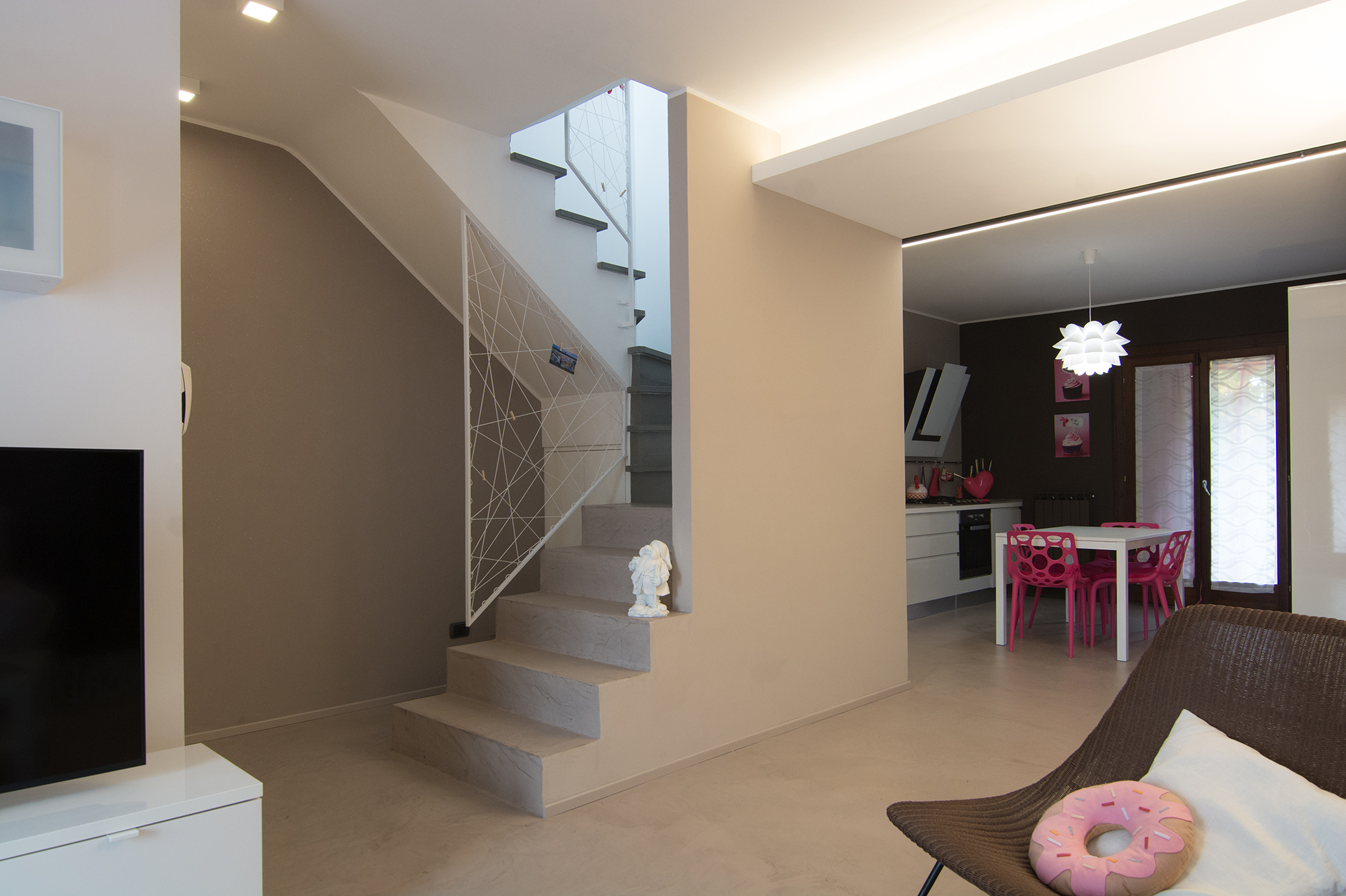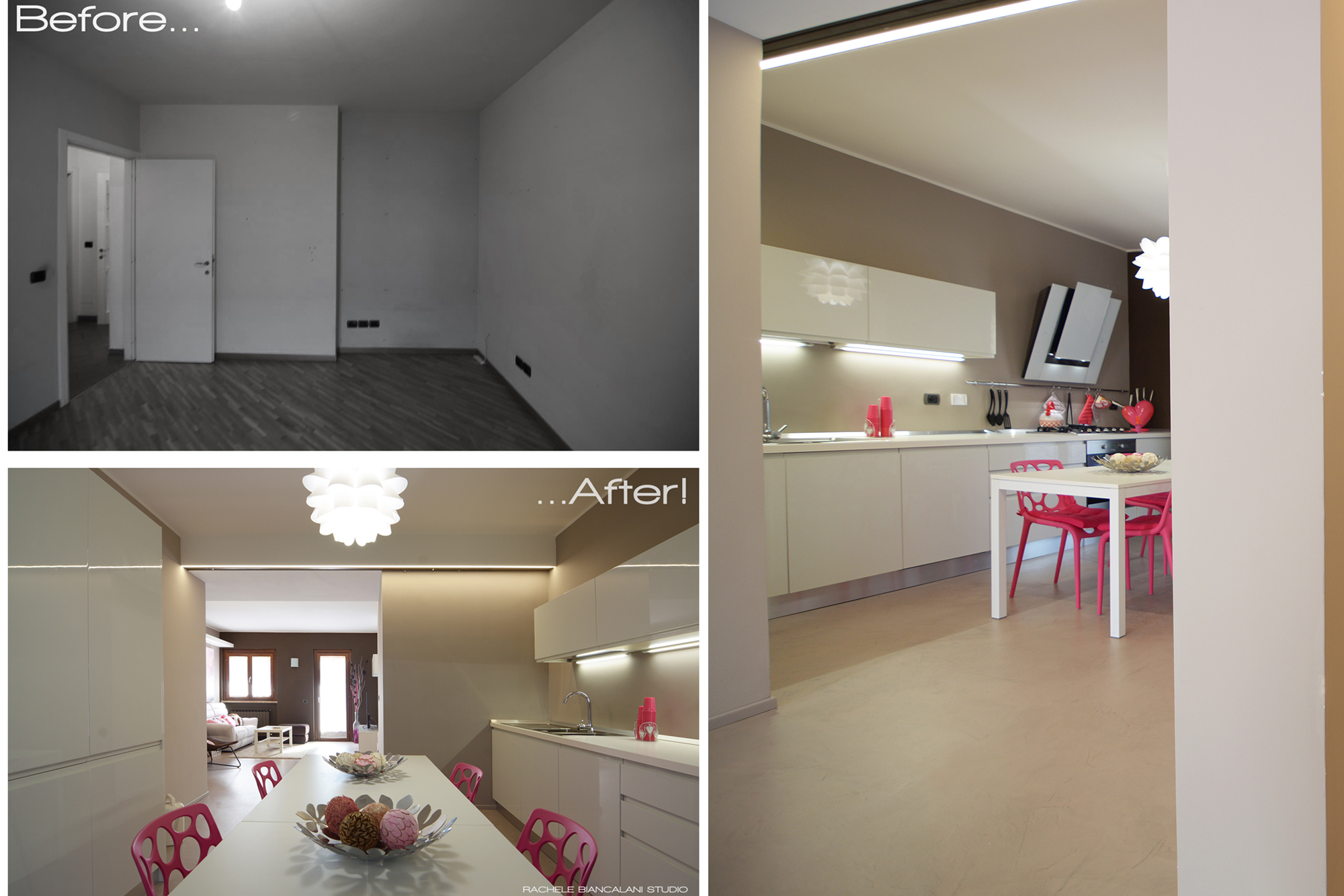 Progetto Architettonico, Pratica Edilizia, Interior Design, Direzione dei lavori e delle maestranze, Lighting Design, Home Shopping, Staging e Foto realizzati da Rachele Biancalani Studio. Questo appartamento su due livelli si presentava poco adatto alle esigenze della nostra cliente, una giovane scrittrice emergente che vive da sola e che ama ricevere gli amici. La zona giorno infatti aveva dimensioni limitatissime: in pochi mq erano condensati il cucinotto, la sala da pranzo e il soggiorno. C'erano invece tre grandi camere separate totalmente inutili per la nostra cliente. Inoltre le finiture, rustiche toscane (il cotto a pavimento, le pareti spugnate in giallo, la scala in pietra serena con corrimano in ferro battuto) non incontravano affatto i gusti della cliente giovane e amante del rosa e dello stile contemporaneo. Sebbene il budget per i lavori non fosse altissimo siamo riusciti ad ottimizzarlo investendo nelle modifiche fondamentali che potessero trasformare gli spazi: demolita la parete del cucinotto abbiamo utilizzato una delle camere per creare una grande cucina più che abitabile e lasciare lo spazio necessario per organizzare al meglio la zona living. Un gioco di velette in cartongesso delimita le zone e distribuisce tagli di luce dove necessario. Un resina (Rapidmix) in colore custom ha coperto con successo il vecchio cotto e parte della scala alla quale è stato modificato anche il parapetto sostituito da un reticolo con telaio in ferro e corda intrecciata che ci siamo divertiti a creare sul posto insieme alla cliente. La camera da letto padronale e lo studio sono entrambi caratterizzati dal colore rosa come il resto dell'appartamento. Bianco, rosa (in tutte le declinazioni) e marrone cioccolato caratterizzano tutti gli ambienti che risultano giovani e divertenti e rispecchiano a pieno la personalità di Serena!