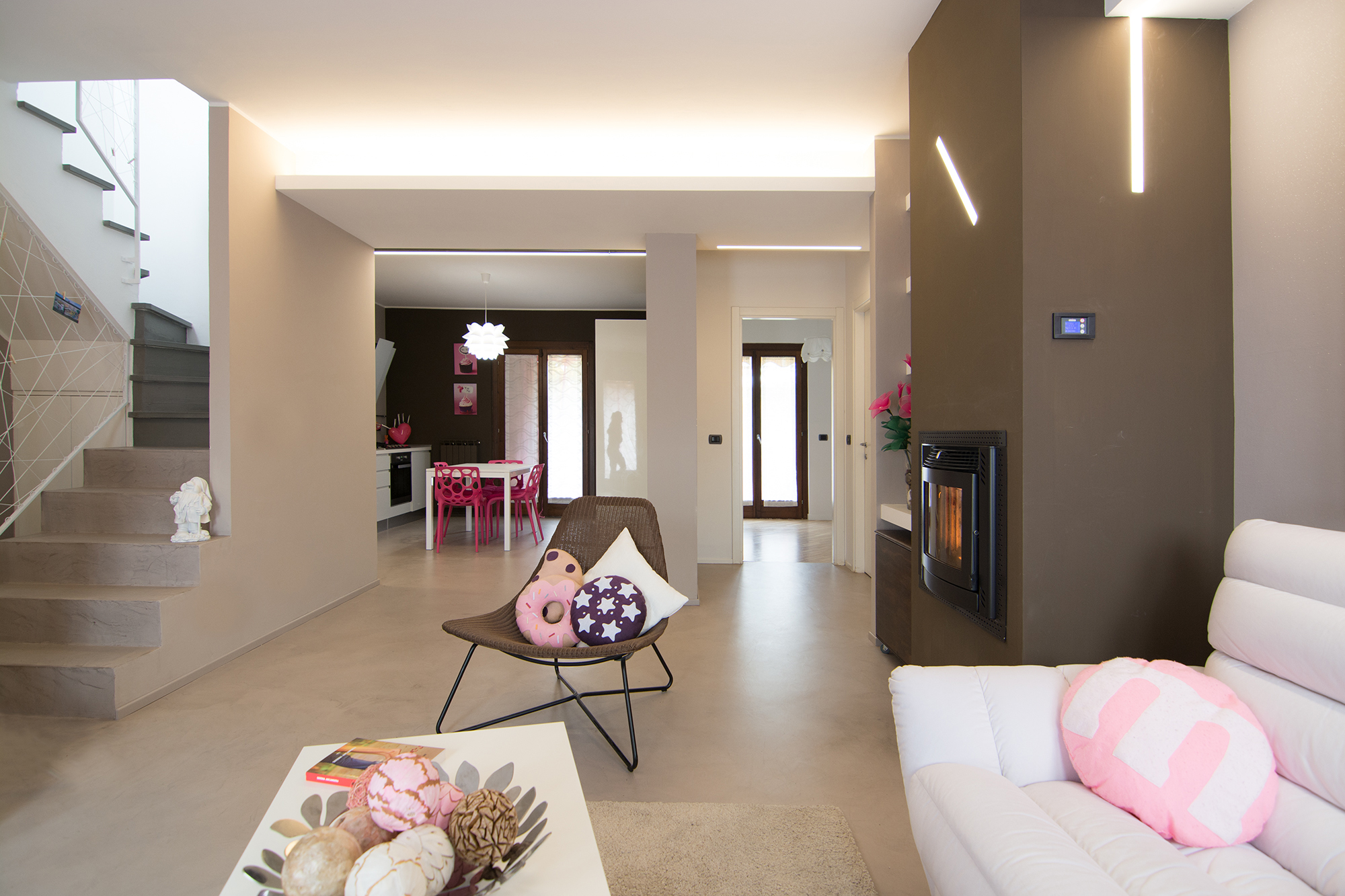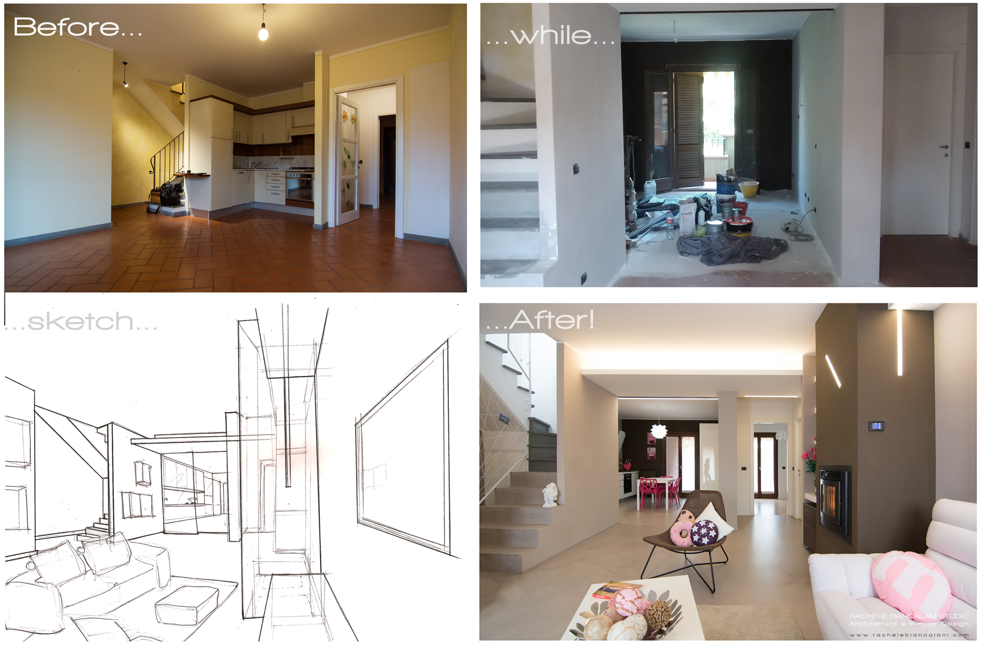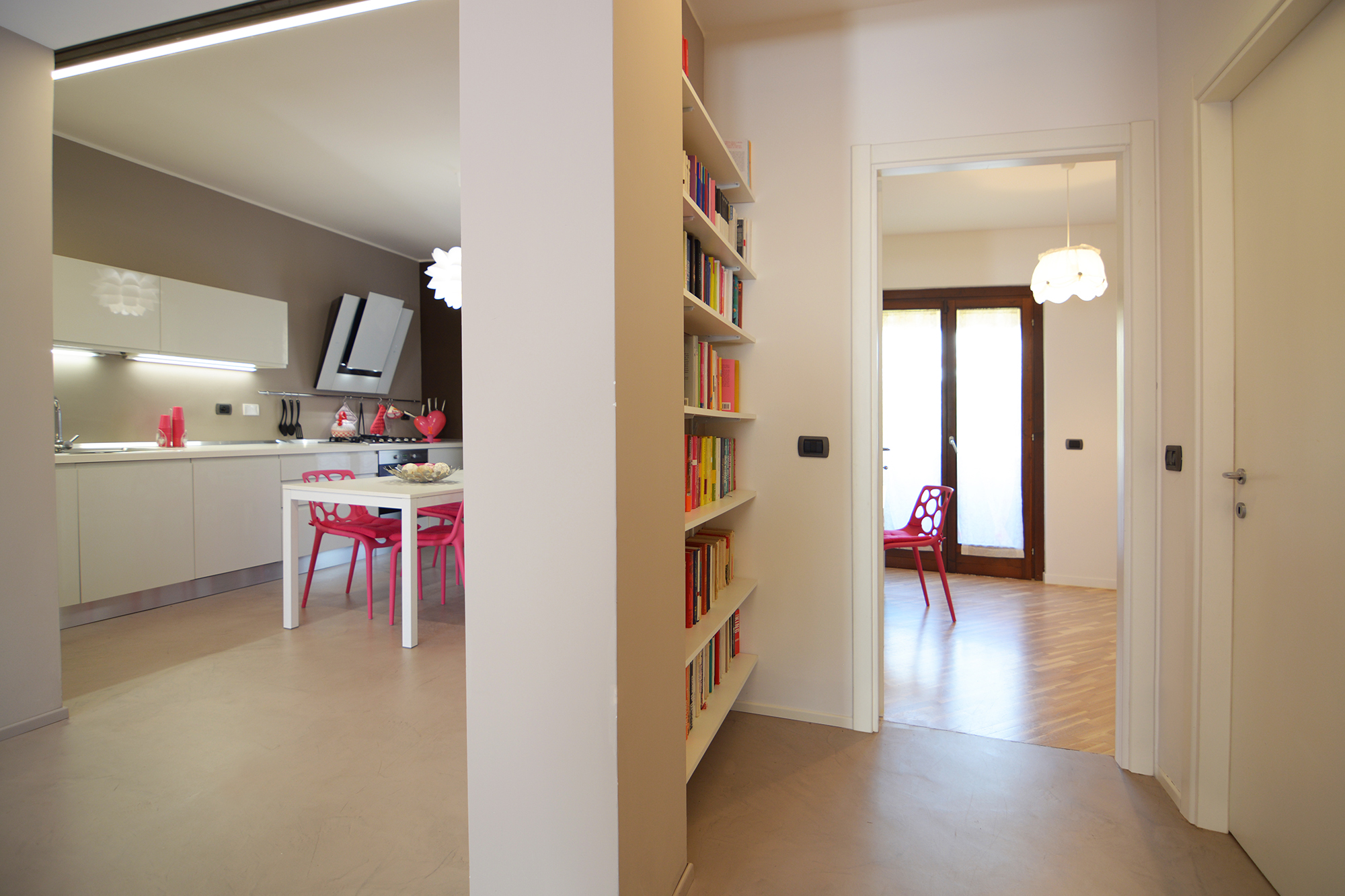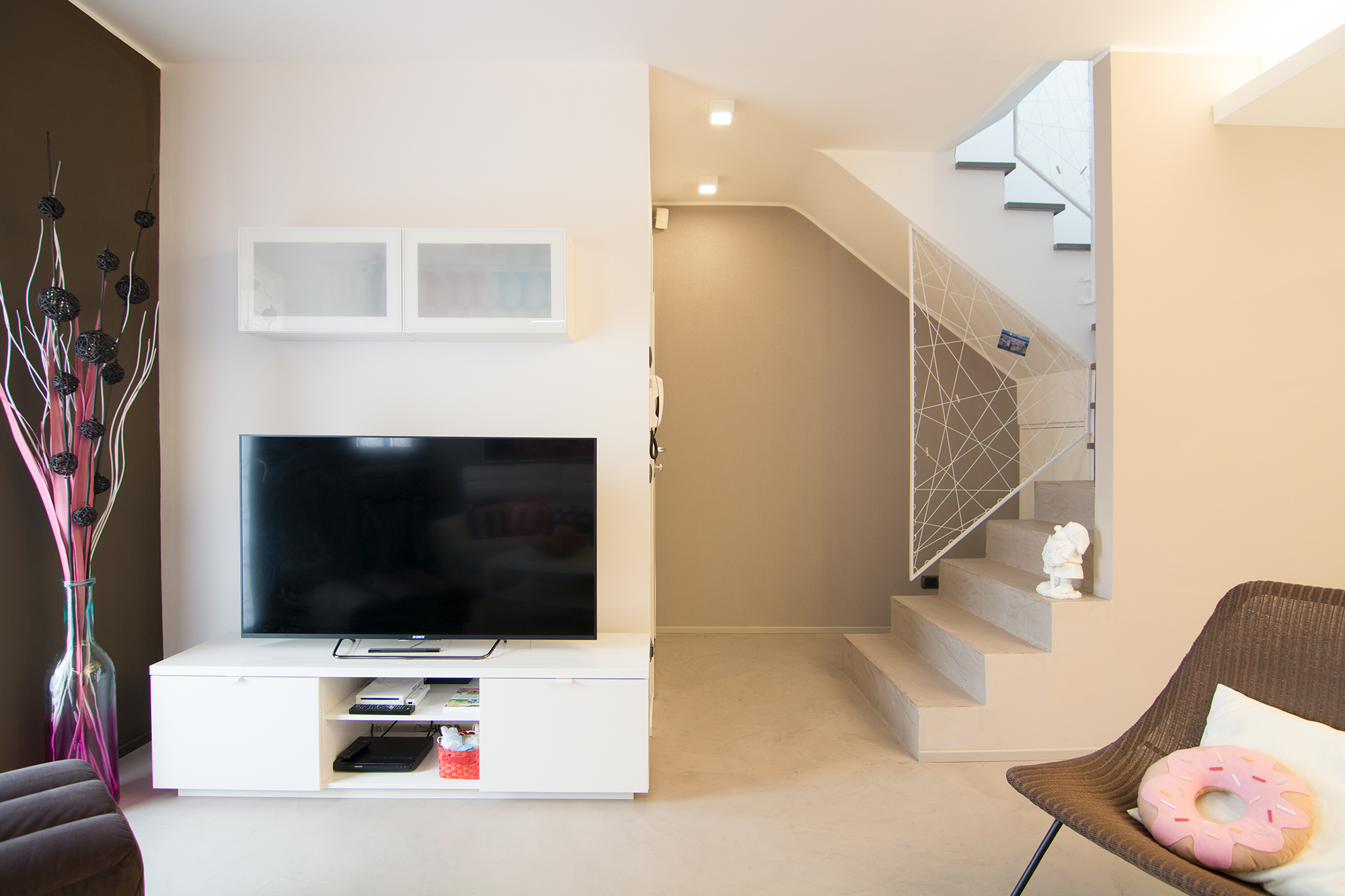 Progetto Architettonico, Pratica Edilizia, Interior Design, Direzione dei lavori e delle maestranze, Lighting Design, Home Shopping, Staging e Foto realizzati da Rachele Biancalani Studio. Questo appartamento su due livelli si presentava poco adatto alle esigenze della nostra cliente, una giovane scrittrice emergente che vive da sola e che ama ricevere gli amici. La zona giorno infatti aveva dimensioni limitatissime: in pochi mq erano condensati il cucinotto, la sala da pranzo e il soggiorno. C'erano invece tre grandi camere separate totalmente inutili per la nostra cliente. Inoltre le finiture, rustiche toscane (il cotto a pavimento, le pareti spugnate in giallo, la scala in pietra serena con corrimano in ferro battuto) non incontravano affatto i gusti della cliente giovane e amante del rosa e dello stile contemporaneo. Sebbene il budget per i lavori non fosse altissimo siamo riusciti ad ottimizzarlo investendo nelle modifiche fondamentali che potessero trasformare gli spazi: demolita la parete del cucinotto abbiamo utilizzato una delle camere per creare una grande cucina più che abitabile e lasciare lo spazio necessario per organizzare al meglio la zona living. Un gioco di velette in cartongesso delimita le zone e distribuisce tagli di luce dove necessario. Un resina (Rapidmix) in colore custom ha coperto con successo il vecchio cotto e parte della scala alla quale è stato modificato anche il parapetto sostituito da un reticolo con telaio in ferro e corda intrecciata che ci siamo divertiti a creare sul posto insieme alla cliente. La camera da letto padronale e lo studio sono entrambi caratterizzati dal colore rosa come il resto dell'appartamento. Bianco, rosa (in tutte le declinazioni) e marrone cioccolato caratterizzano tutti gli ambienti che risultano giovani e divertenti e rispecchiano a pieno la personalità di Serena!