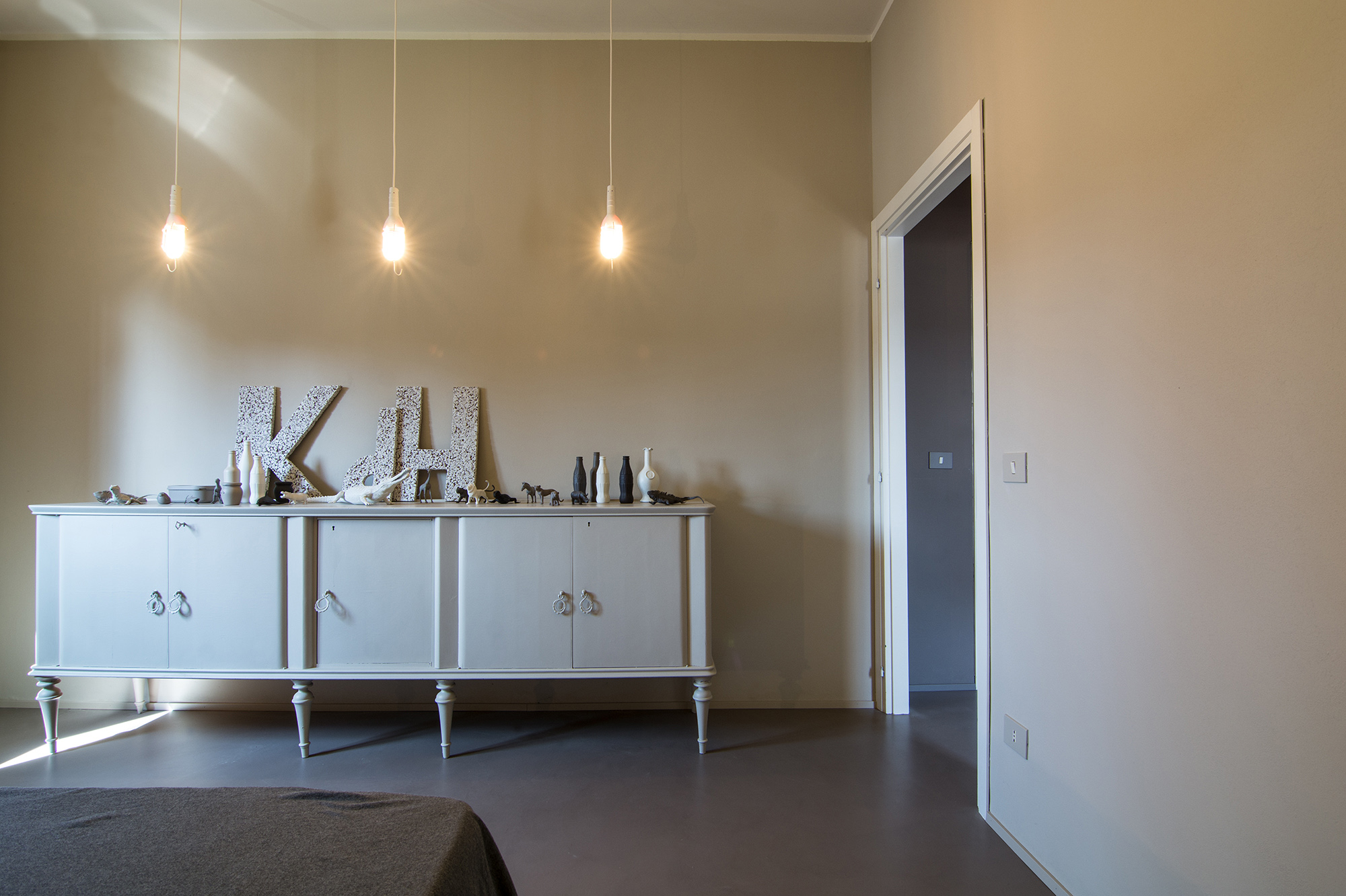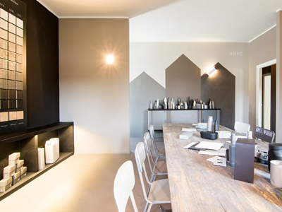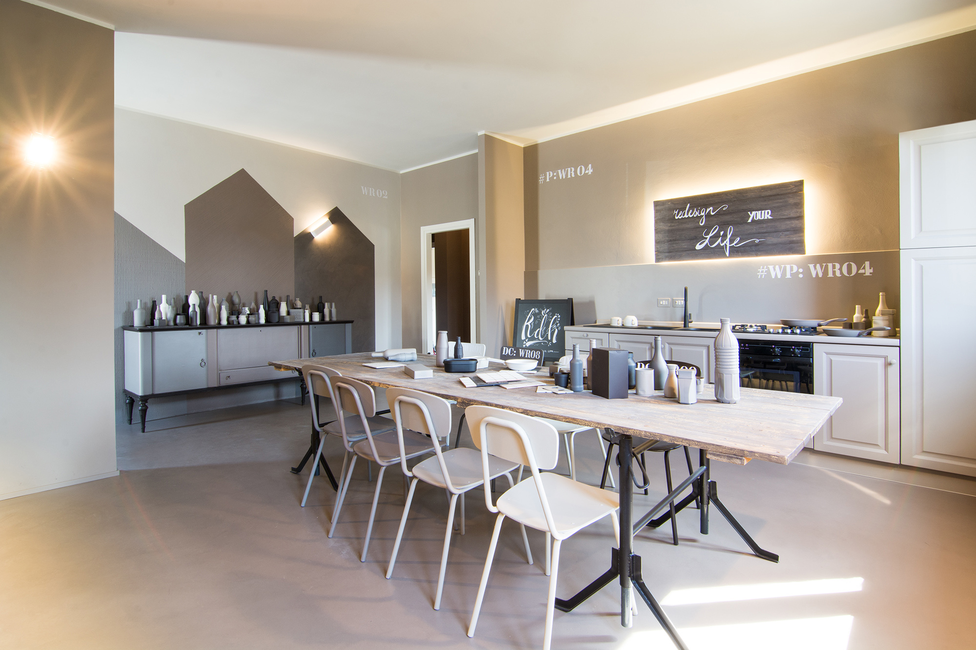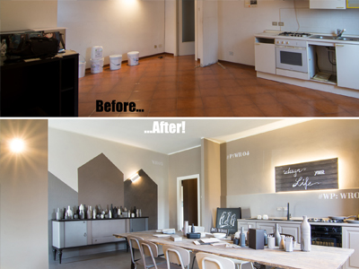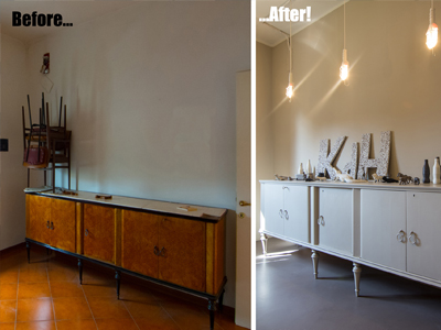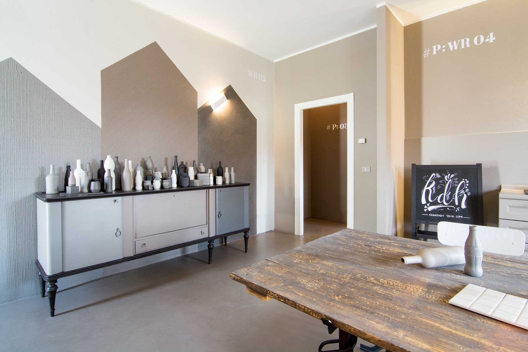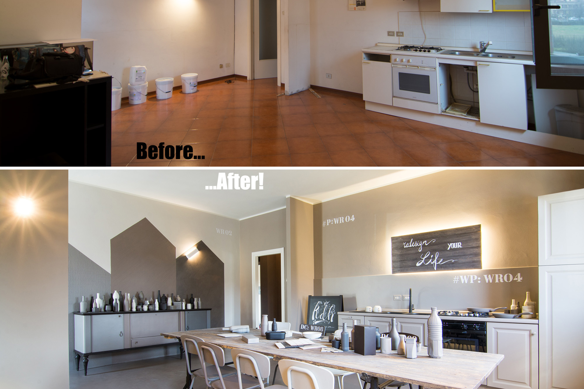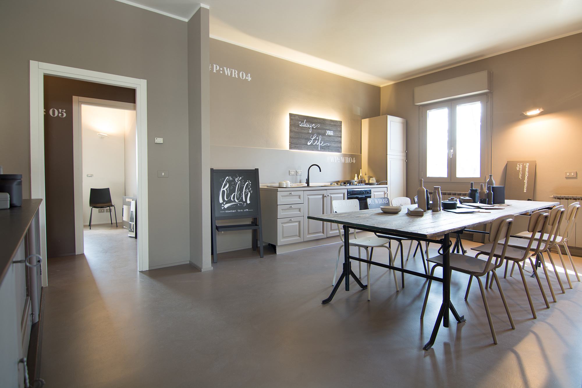 Intervento di ordinaria manutenzione per questo appartamento-showroom che abbiamo trasformato da terribile a terribilmente bello. La situazione prima dei lavori non era molto gradevole: vecchie piastrelle rosso mattone su un pavimento in dei punti imbarcato, gli infissi anni '80 neri con i cassonetti degli avvolgibili neri e bianchi e un sacco di altri dettagli sgradevoli. Il nostro Restyling "purista" ci ha visto utilizzare SOLO ED ESCLUSIVAMENTE prodotti della serie Kerakoll Design: dalle resine, agli smalti passando ovviamente per i decorativi e le pitture murali. Anche i vecchi arredi sono stati resi irresistibili dai prodotti Kerakoll che sono stati utilizzati proprio su tutto: nessuno può resistere al fascino delle bottigliette, dei contenitori, dei soprammobili dipinti con tutta la gamma delle tonalità KD. Giochi di luce diretta e indiretta ove possibile sottolineano le texture materiche di "Patina" e "Wallcrete". [interior design, lighting design, direzione dei lavori e foto a cura del nostro Studio]