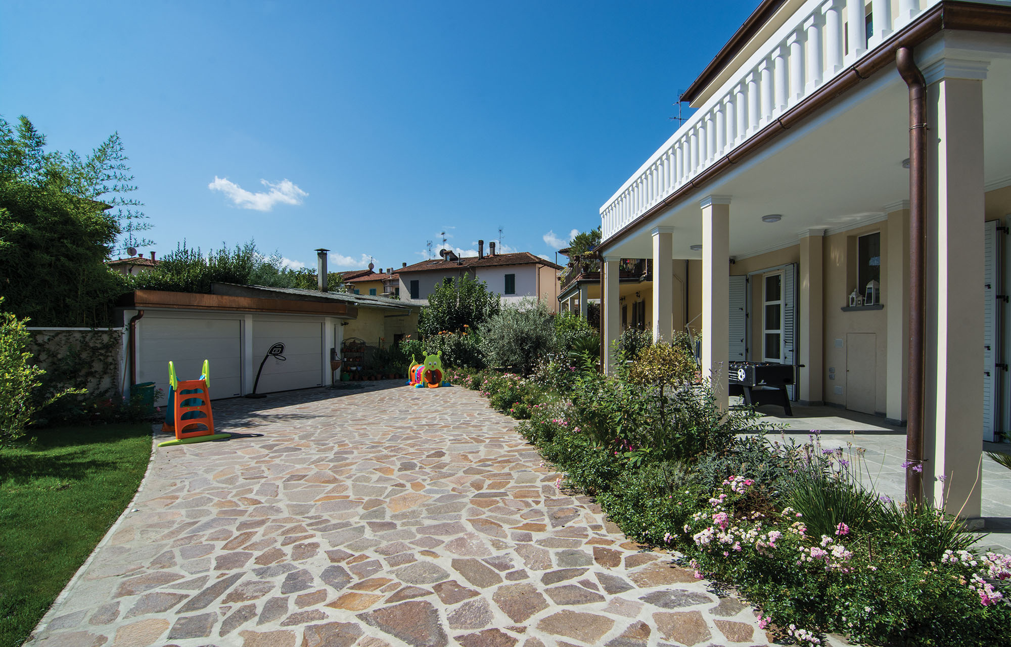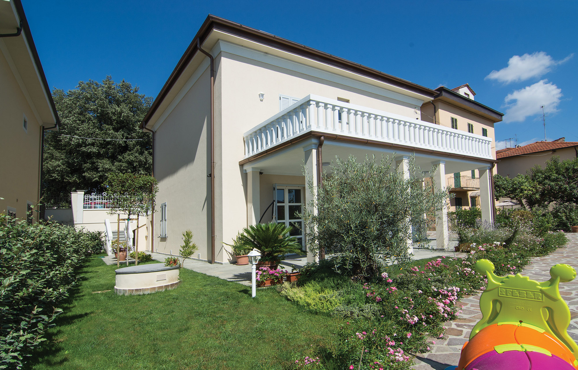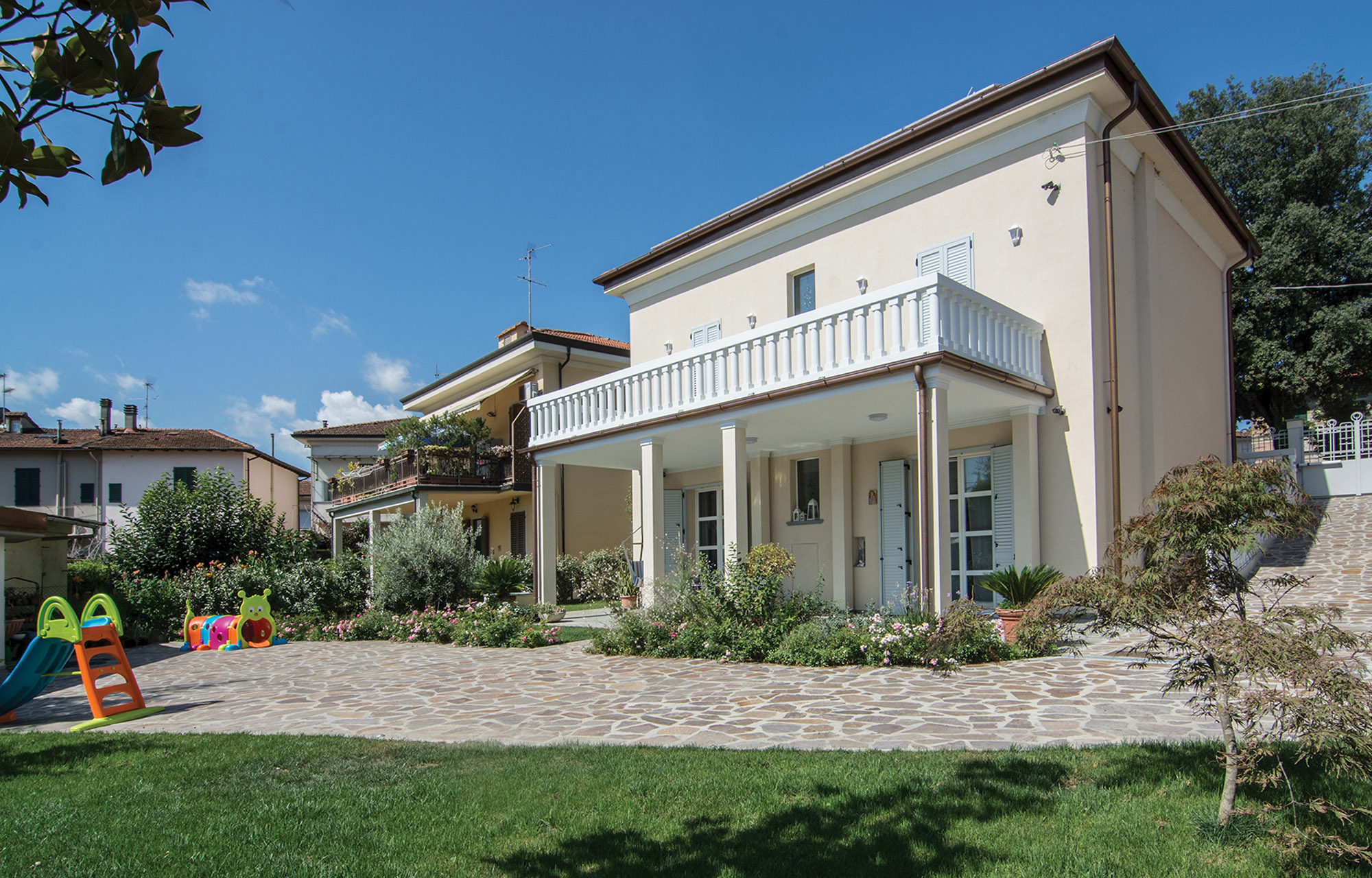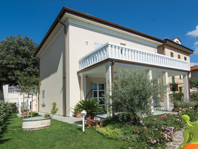 L’esterno della villa è stato mantenuto fedele alle sue caratteristiche architettoniche originali, pertanto la loggia e il parapetto della grande terrazza a piano primo si integrano perfettamente con i caratteri tipologici dell’edificio, inoltre sono stati inserite pavimentazioni in vera pietra sia sulle terrazze che in tutti i vialetti esterni carrabili e pedonali. Scale, soglie e davanzali sono in pietra serena, tipica toscana.