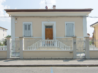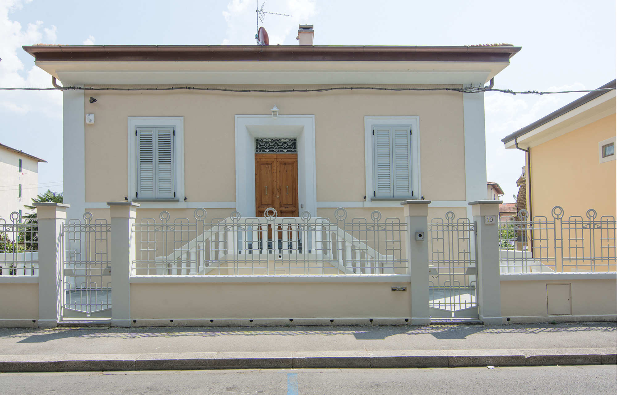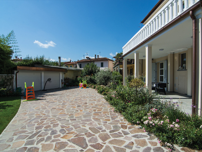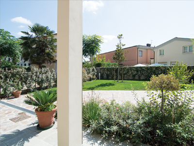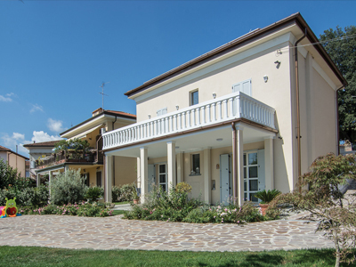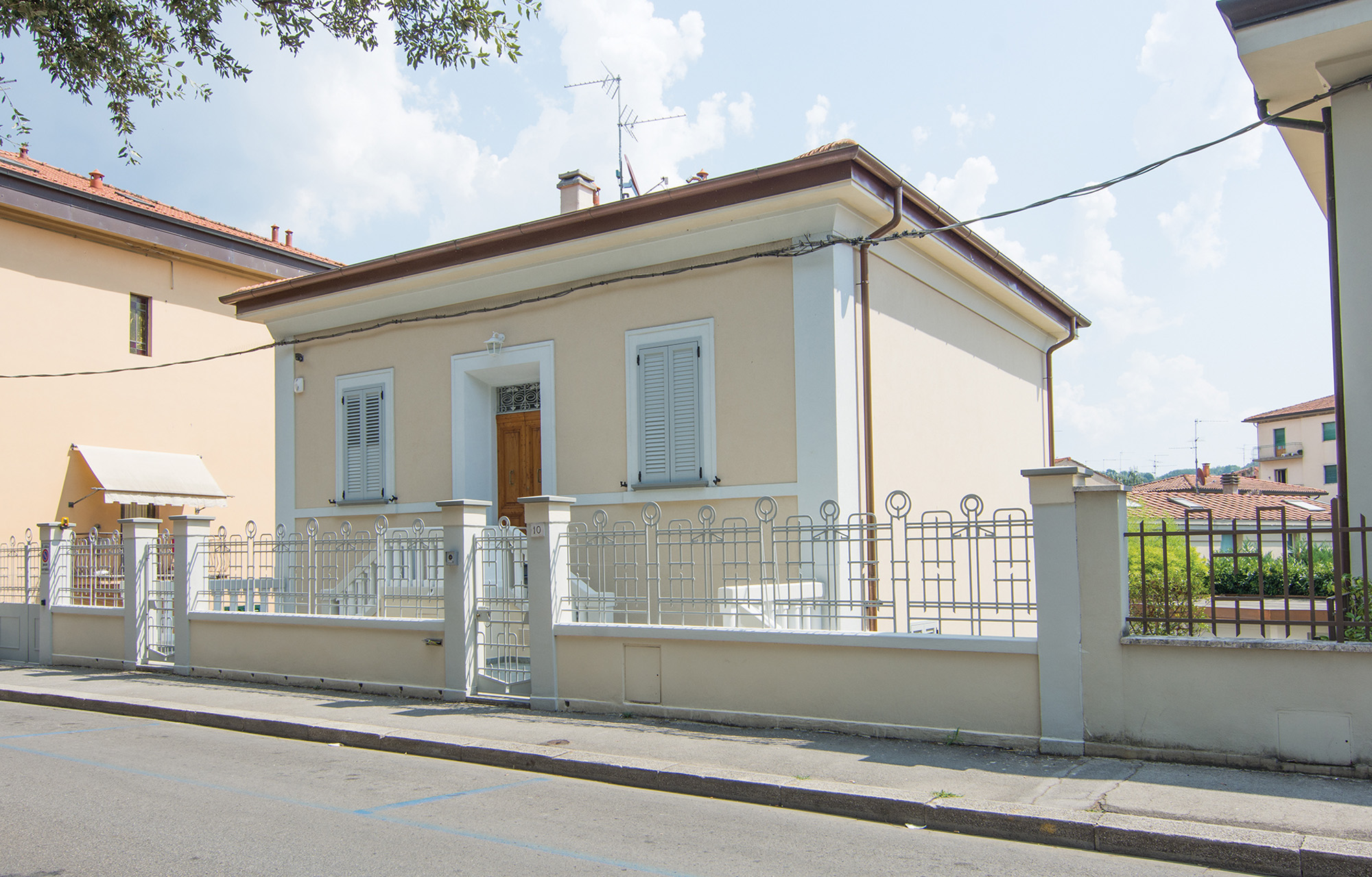 L’esterno della villa è stato mantenuto fedele alle sue caratteristiche architettoniche originali, pertanto la loggia e il parapetto della grande terrazza a piano primo si integrano perfettamente con i caratteri tipologici dell’edificio, inoltre sono stati inserite pavimentazioni in vera pietra sia sulle terrazze che in tutti i vialetti esterni carrabili e pedonali. Scale, soglie e davanzali sono in pietra serena, tipica toscana.