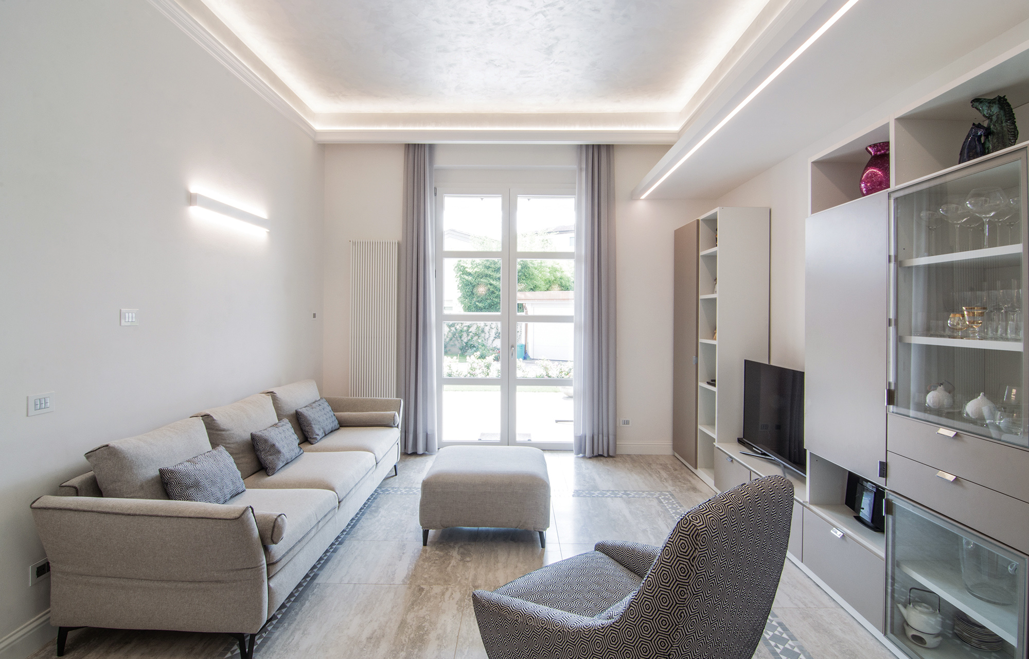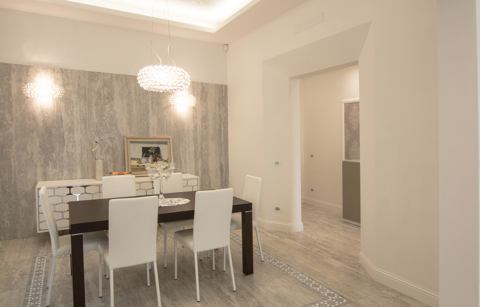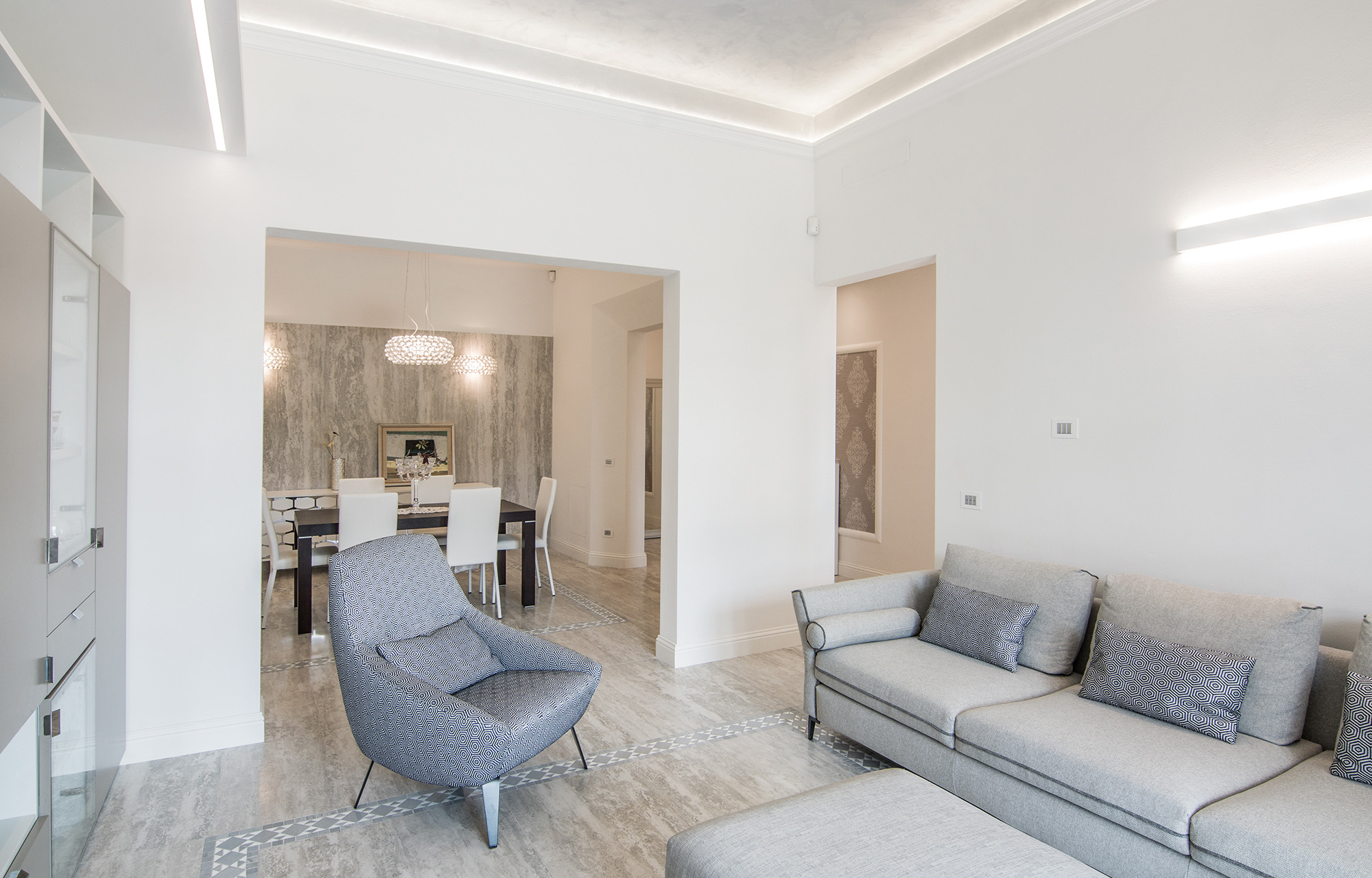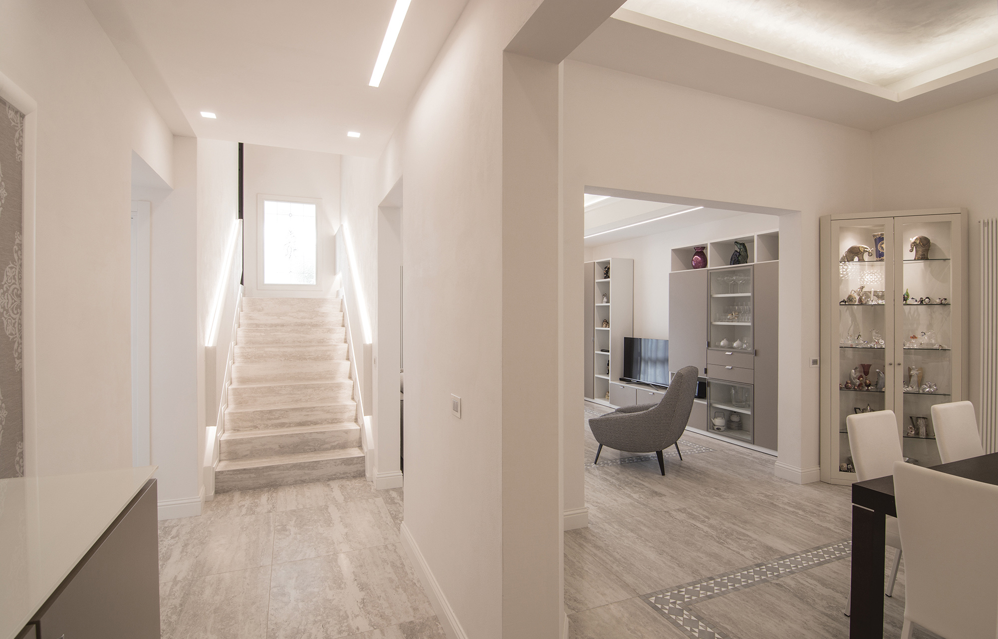 La Committenza desiderava ambienti dallo stile elegante e allo stesso tempo funzionali, ecco perchè la Progettista ha rivoluzionato completamente la planimetria del piano terra (che in precedenza ospitava un centro estetico!) ampliando alcune aperture sia interne che in facciata, che hanno reso gli ambienti comunicanti lasciando filtrare la luce naturale dalle enormi finestre che sono state realizzate su progetto.
