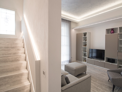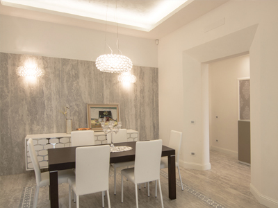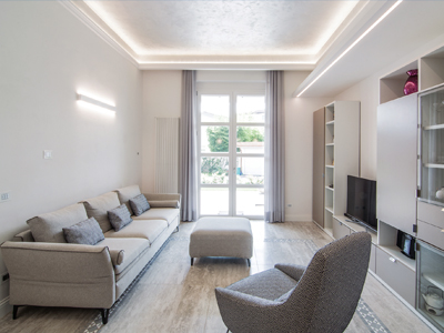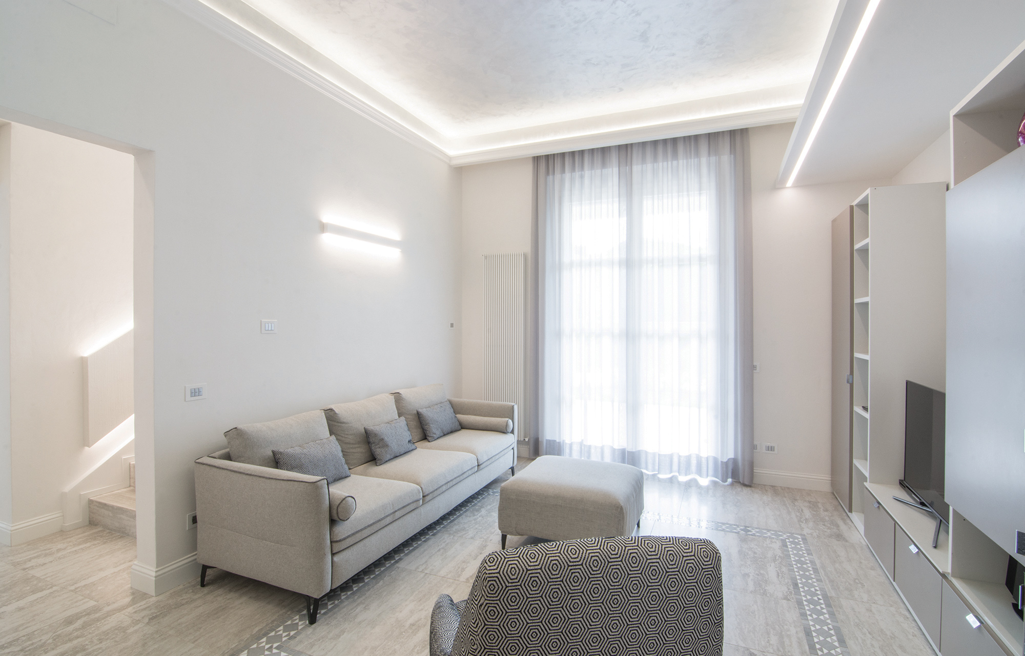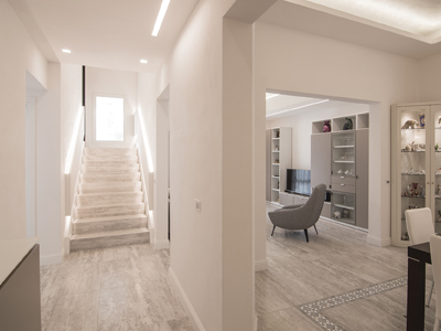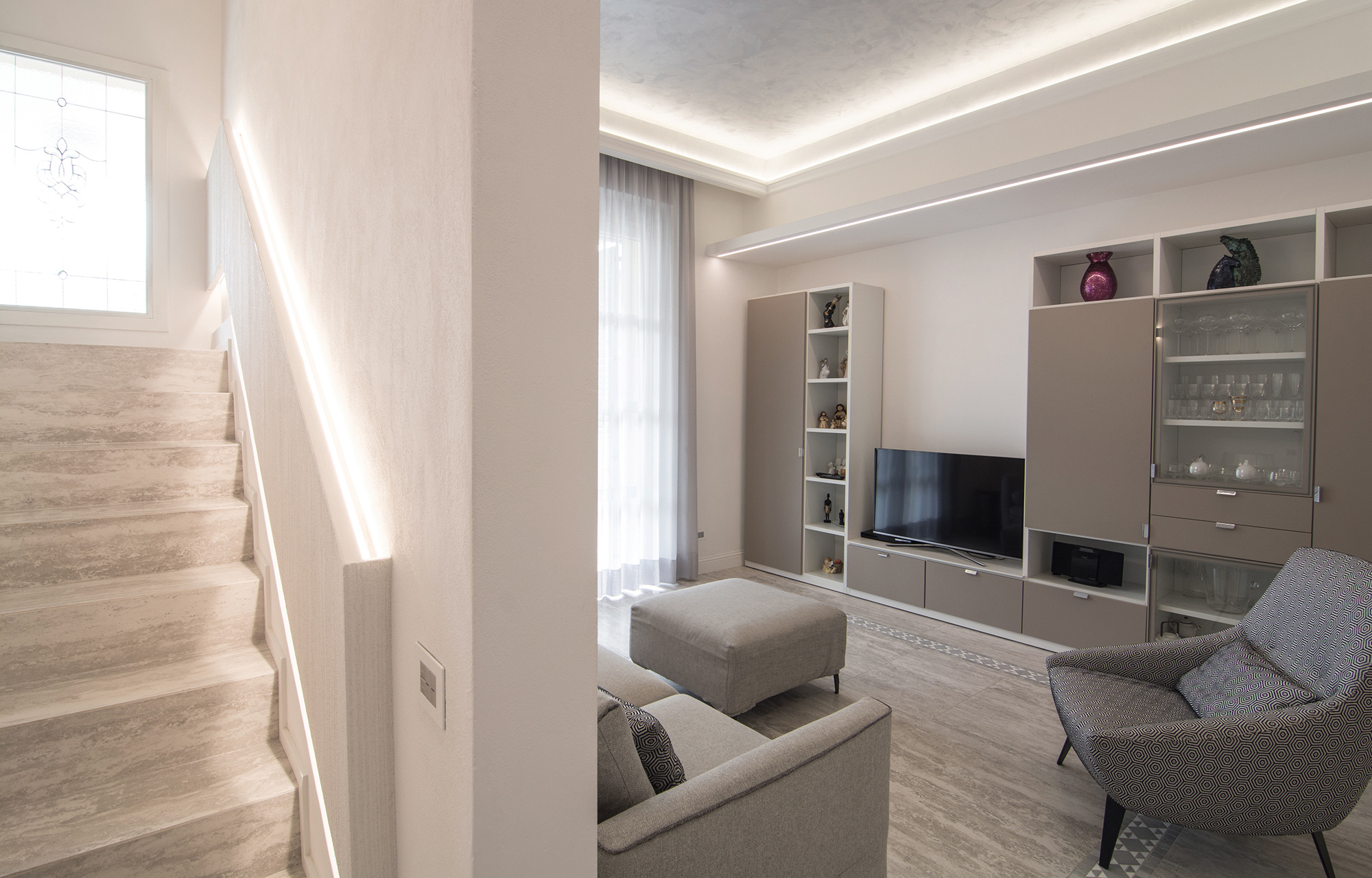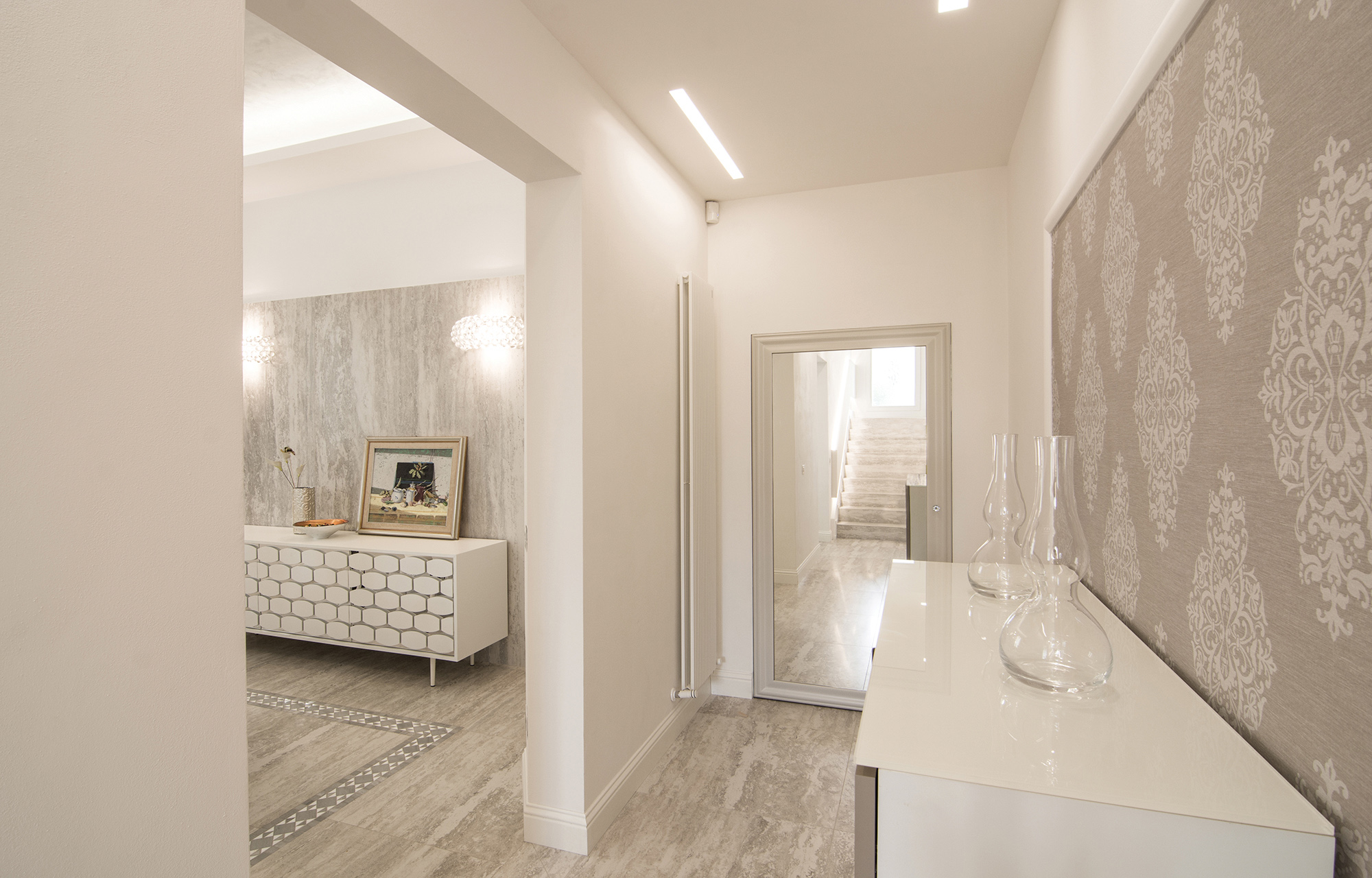 La Committenza desiderava ambienti dallo stile elegante e allo stesso tempo funzionali, ecco perchè la Progettista ha rivoluzionato completamente la planimetria del piano terra (che in precedenza ospitava un centro estetico!) ampliando alcune aperture sia interne che in facciata, che hanno reso gli ambienti comunicanti lasciando filtrare la luce naturale dalle enormi finestre che sono state realizzate su progetto.
