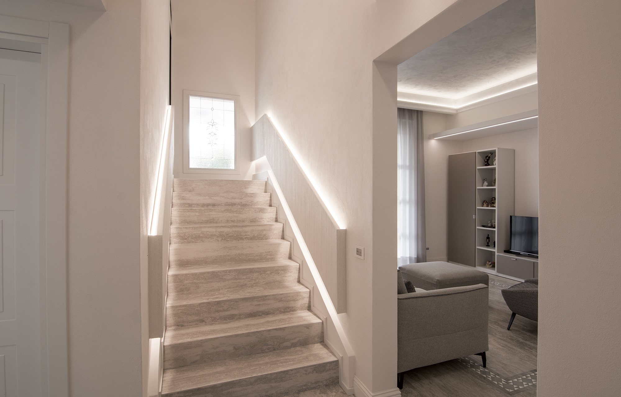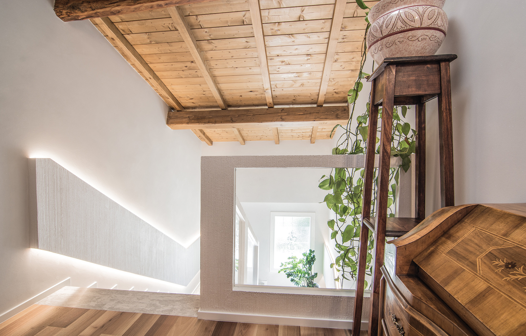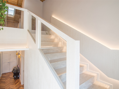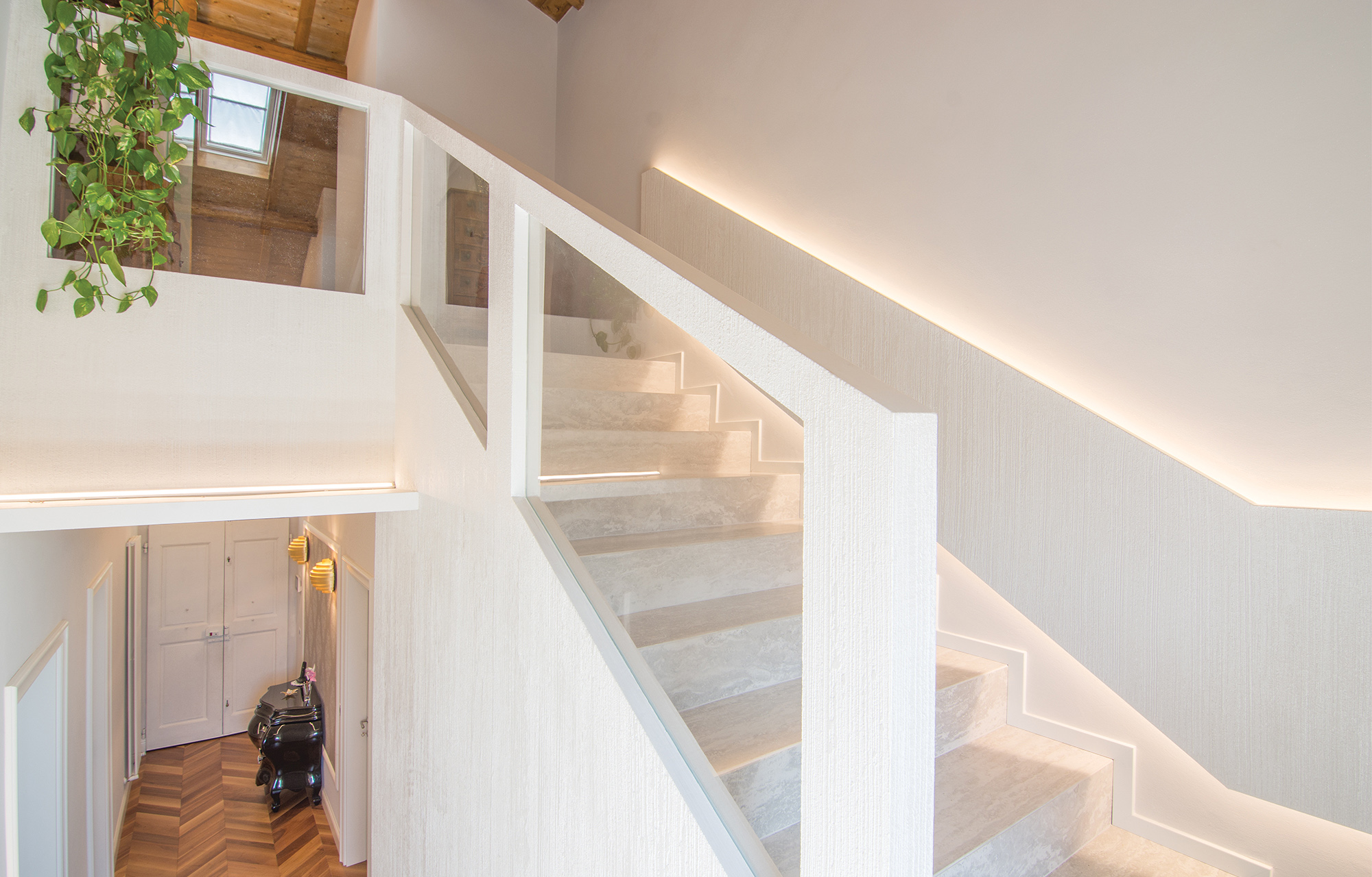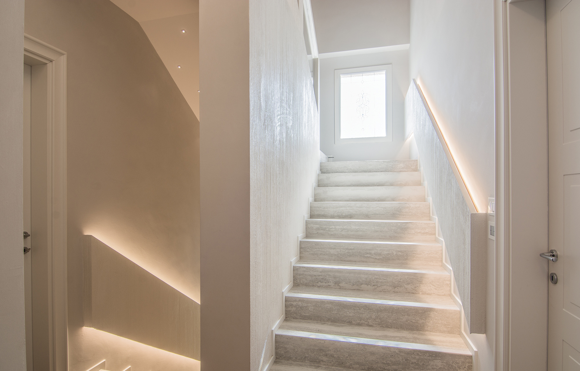 Nella zona giorno si nota la predominanza del colore bianco con inserimenti di grigio caldo. Se si osserva con attenzione però il bianco ha una texture che va dal glitter al “raschiato” come si nota facilmente nel corrimano in cartongesso retroilluminato realizzato su progetto di Rachele Biancalani che caratterizza il corpo scala di tutti e tre i piani. I prodotti utilizzati per le imbiancature sono Oikos al piano terra e Sikkens al piano primo nel quale in ogni stanza abbiamo un esplosione di colore. I soffitti madreperlati delle tre stanze principali del piano terra sono realizzati con Ottocento Antico Velluto di Oikos.