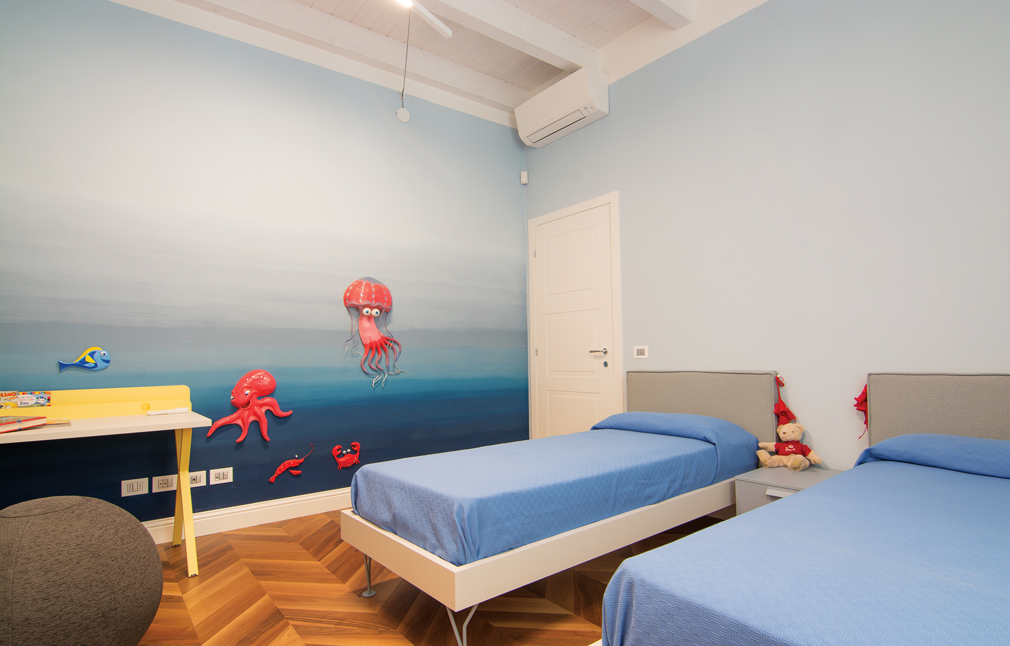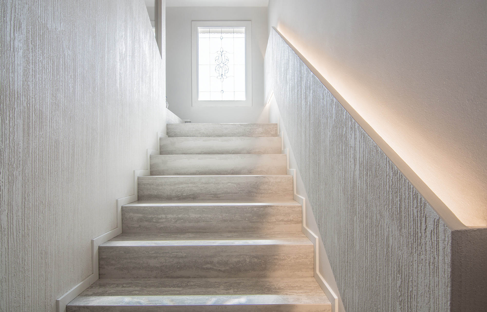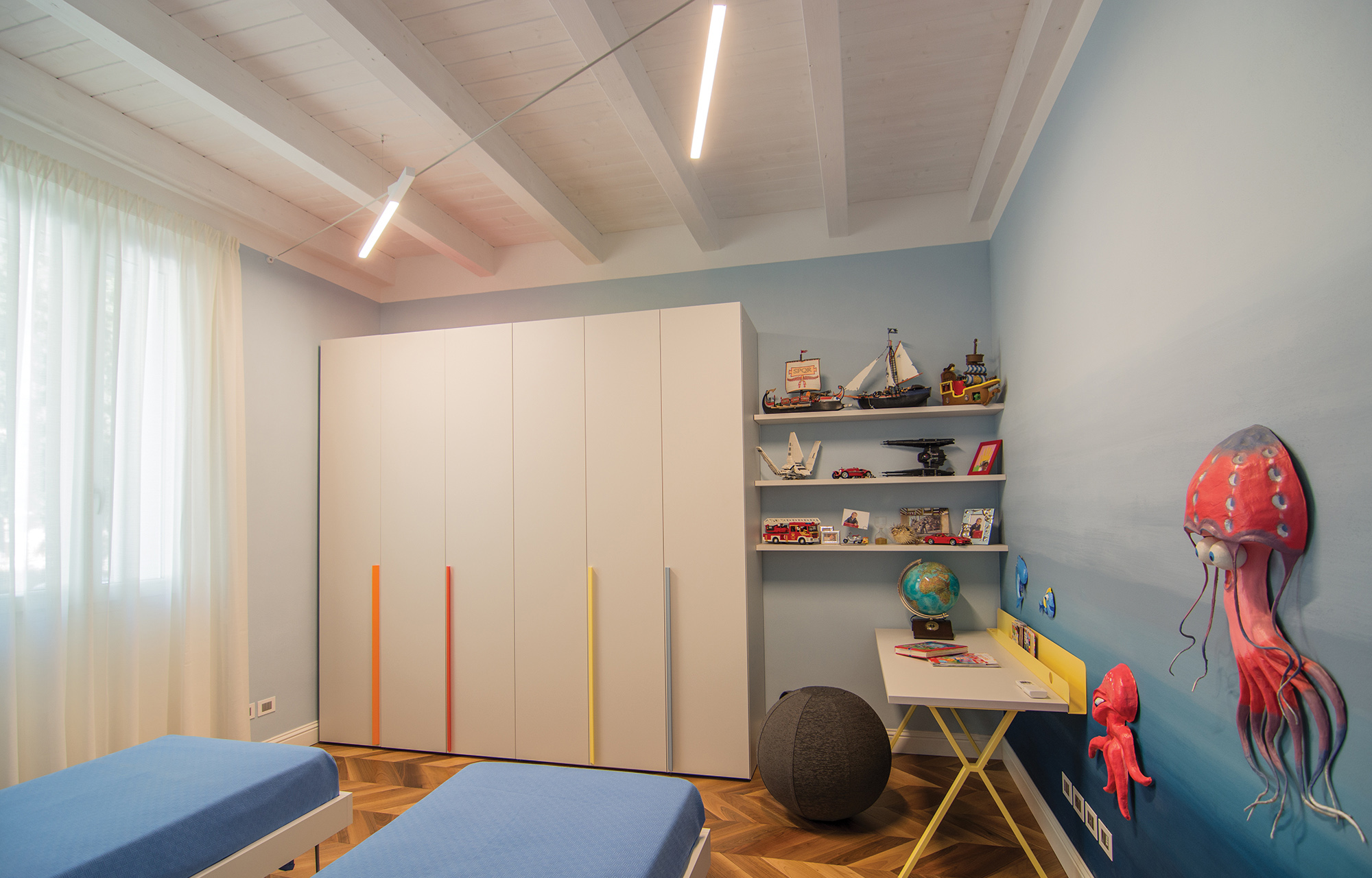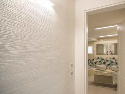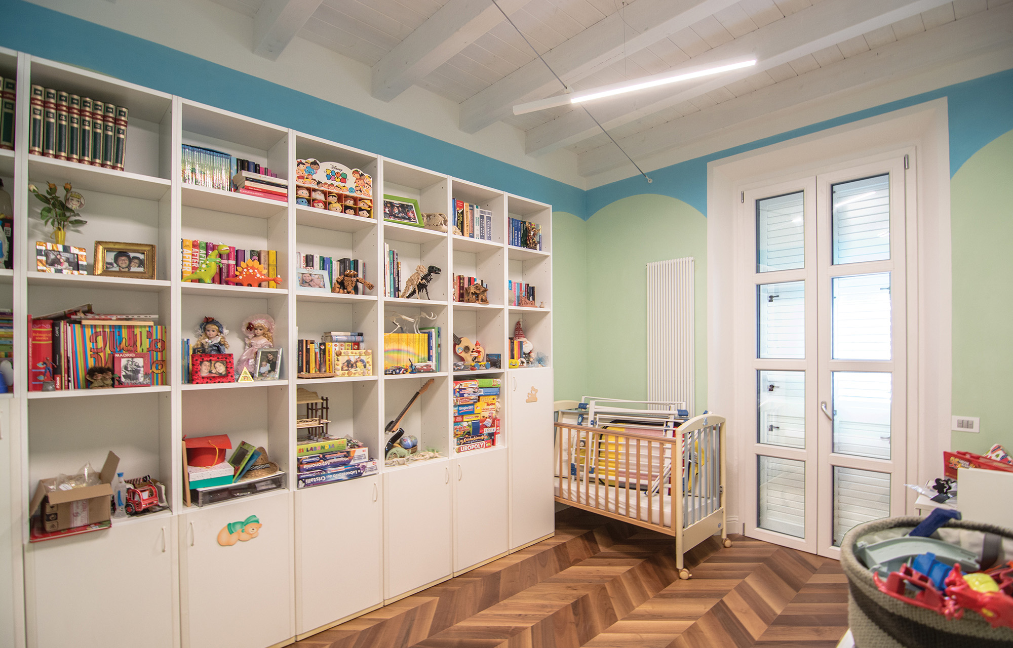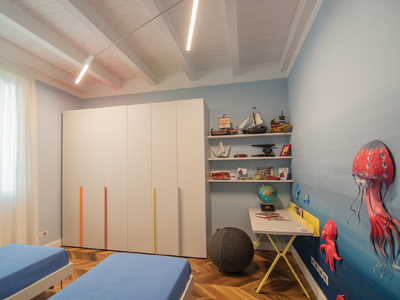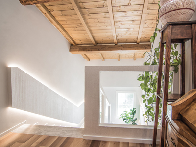 Nella zona giorno si nota la predominanza del colore bianco con inserimenti di grigio caldo. Se si osserva con attenzione però il bianco ha una texture che va dal glitter al “raschiato” come si nota facilmente nel corrimano in cartongesso retroilluminato realizzato su progetto di Rachele Biancalani che caratterizza il corpo scala di tutti e tre i piani. I prodotti utilizzati per le imbiancature sono Oikos al piano terra e Sikkens al piano primo nel quale in ogni stanza abbiamo un esplosione di colore. I soffitti madreperlati delle tre stanze principali del piano terra sono realizzati con Ottocento Antico Velluto di Oikos.