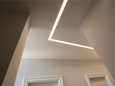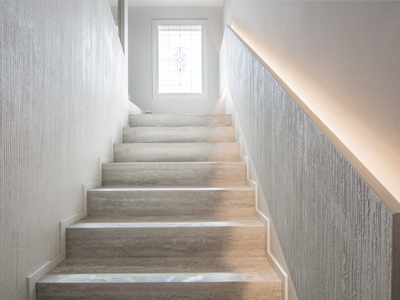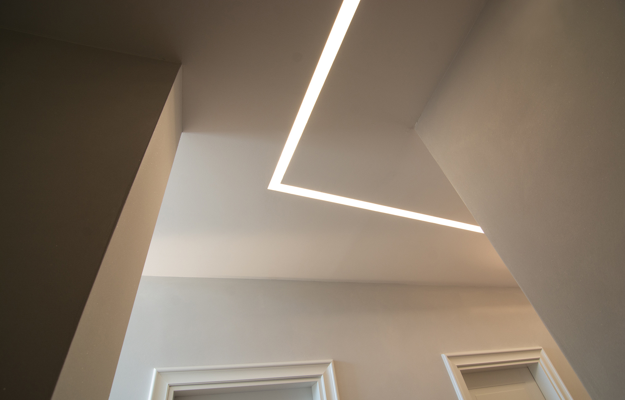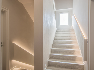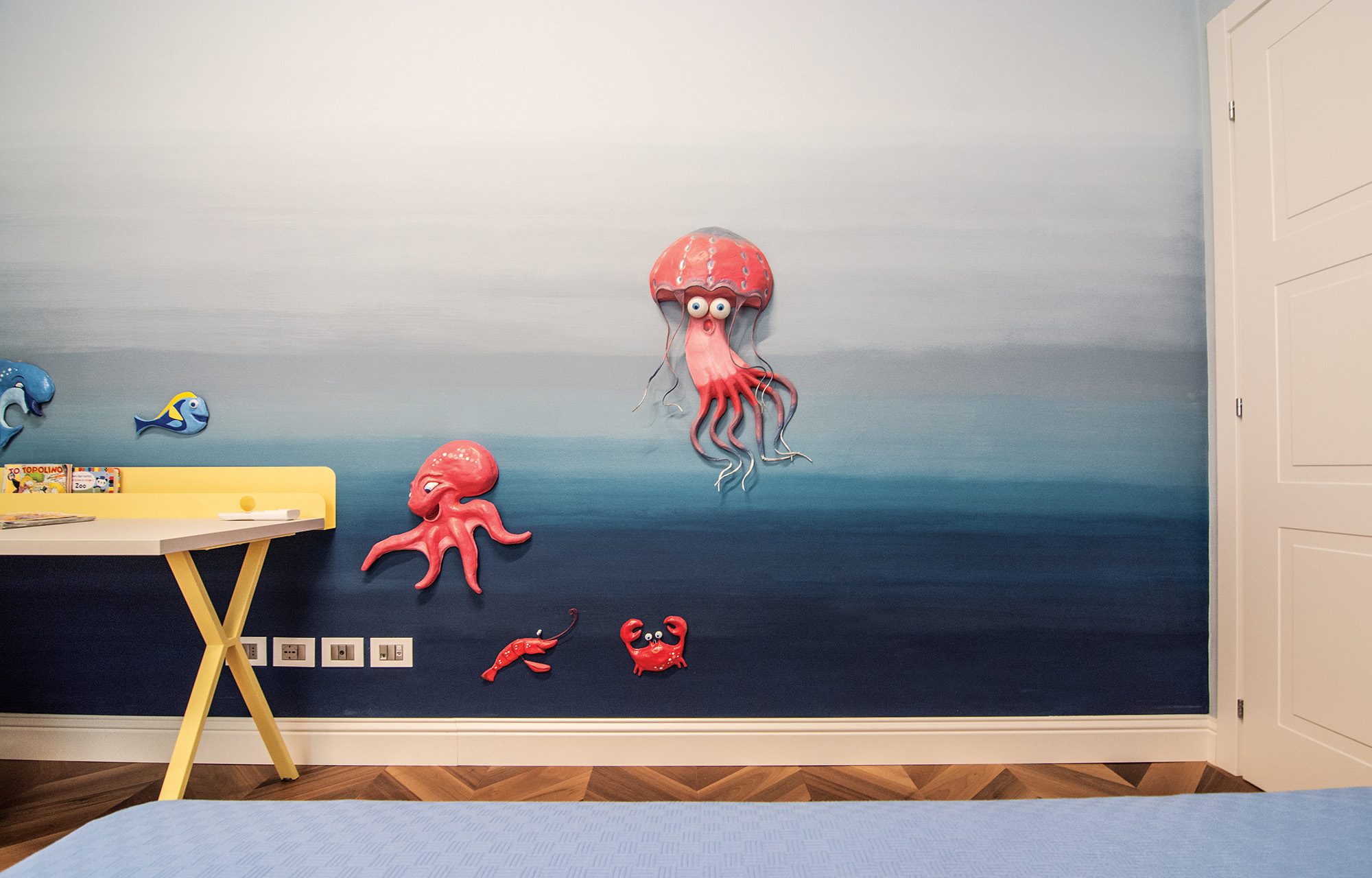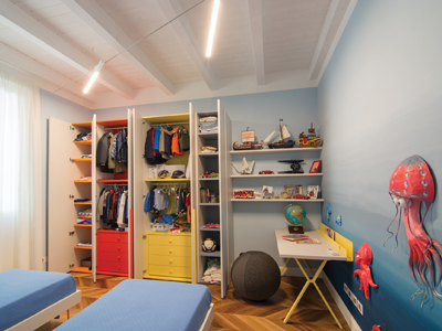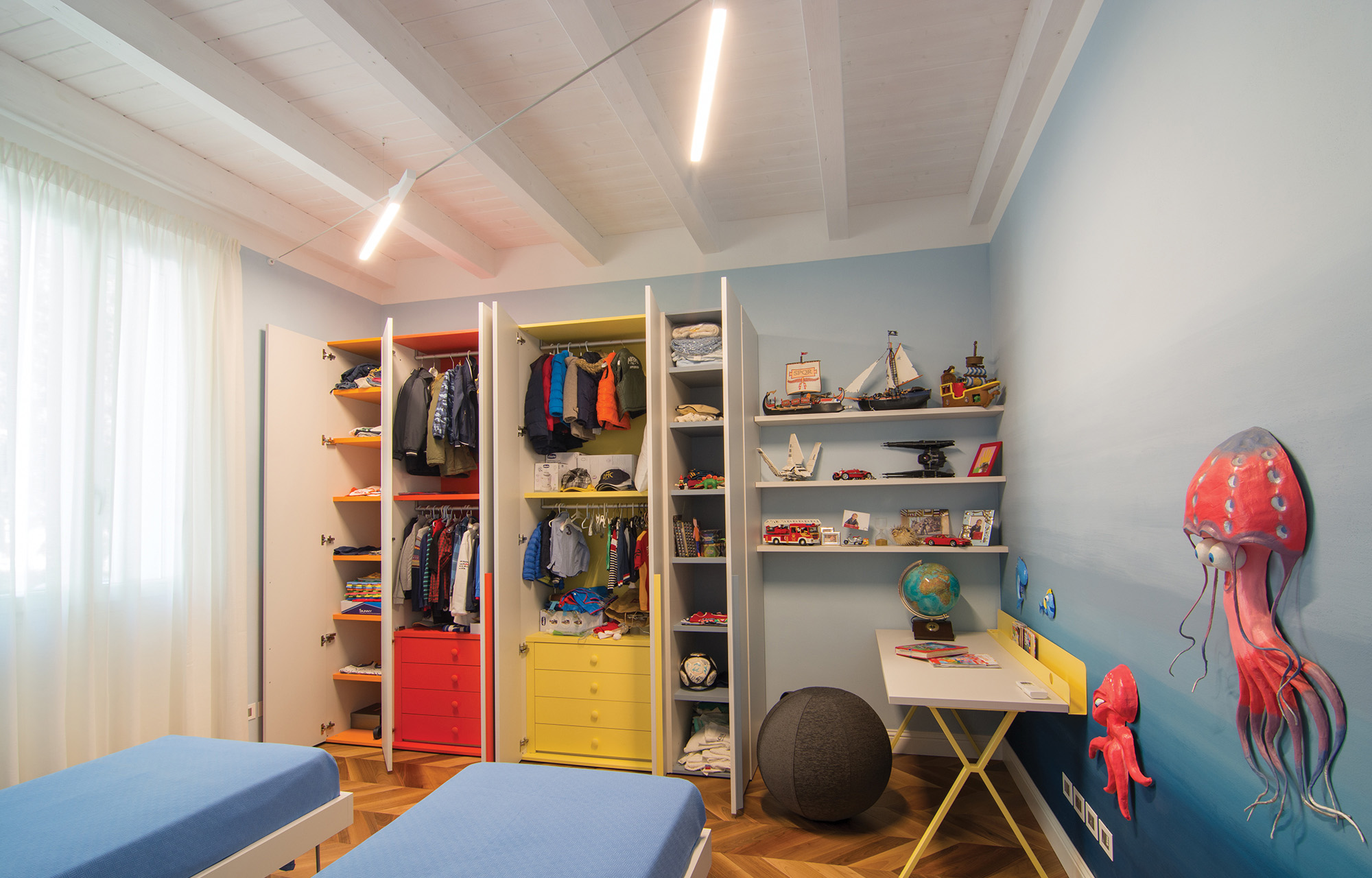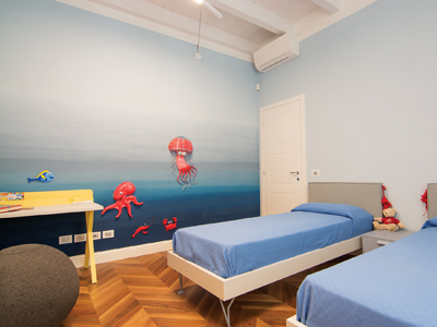 Nella zona giorno si nota la predominanza del colore bianco con inserimenti di grigio caldo. Se si osserva con attenzione però il bianco ha una texture che va dal glitter al “raschiato” come si nota facilmente nel corrimano in cartongesso retroilluminato realizzato su progetto di Rachele Biancalani che caratterizza il corpo scala di tutti e tre i piani. I prodotti utilizzati per le imbiancature sono Oikos al piano terra e Sikkens al piano primo nel quale in ogni stanza abbiamo un esplosione di colore. I soffitti madreperlati delle tre stanze principali del piano terra sono realizzati con Ottocento Antico Velluto di Oikos.