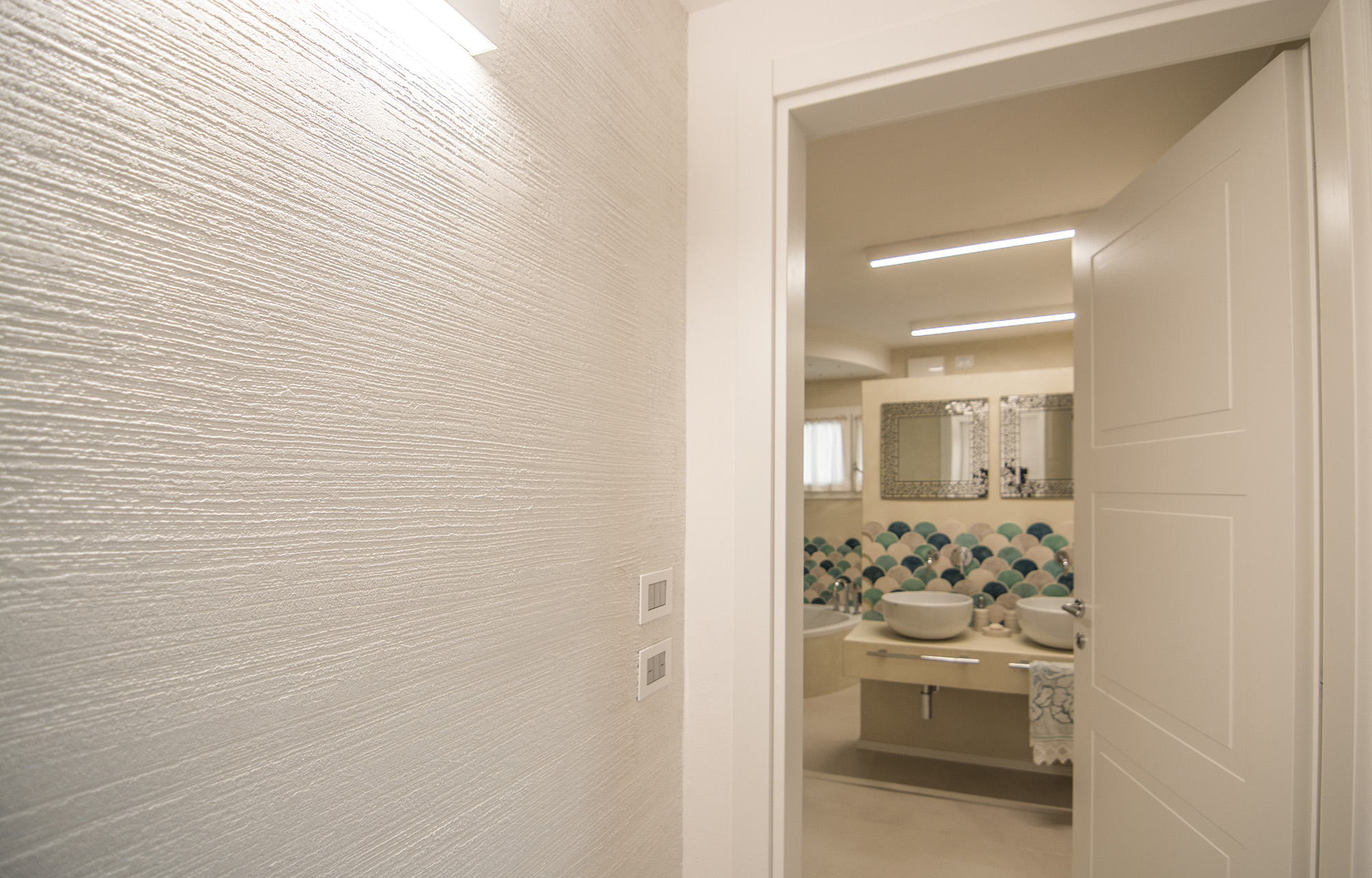 Un’altra grossa difficoltà riscontrata dalla Progettista è stato lavorare, almeno inizialmente, con maestranze scelte in autonomia dalla Committenza che si sono dimostrate inadatte ad eseguire lavori tanto raffinati che, come da progetto, prevedevano l’inserimento di dettagli come porte e sportelli a filomuro, illuminazione radente, bagni con molti elementi in muratura da rivestire in resina e corpi illuminanti integrati nella muratura stessa.