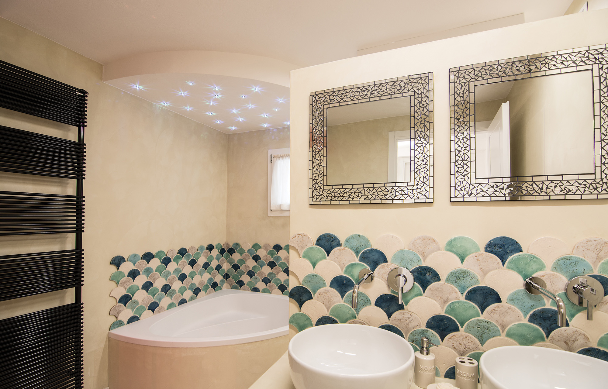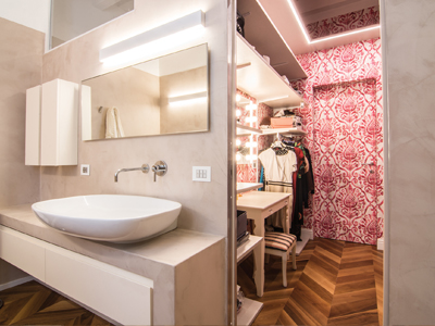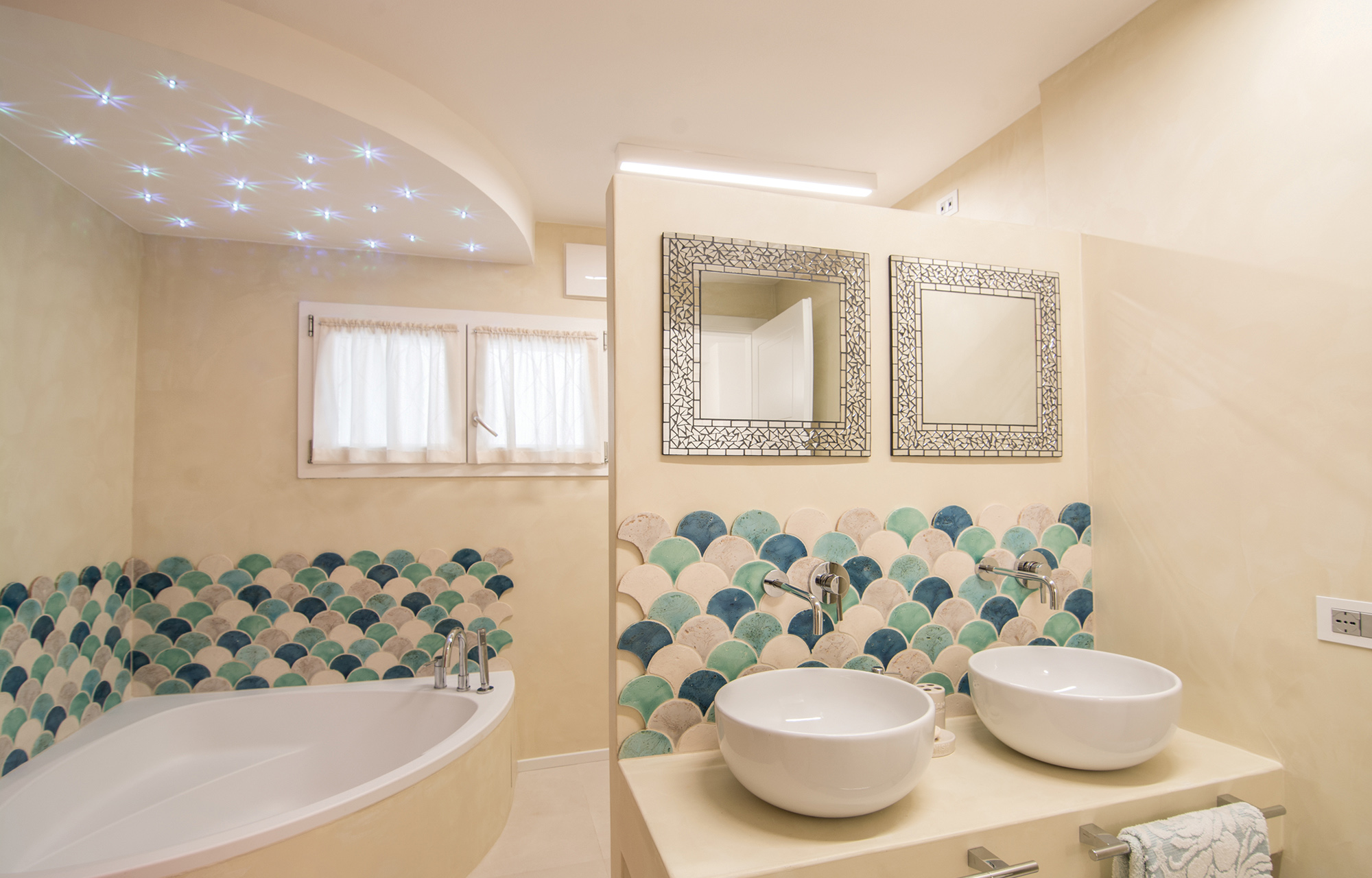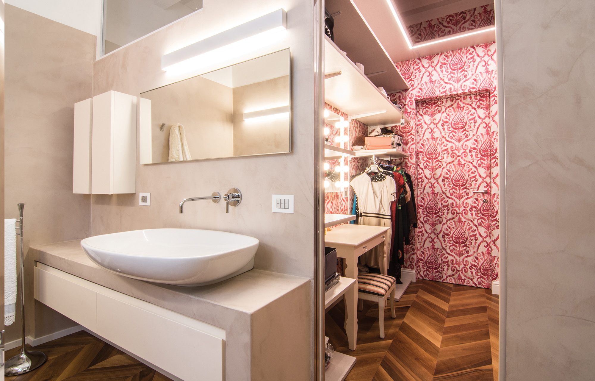 Al piano terra l’unica nota di colore è rappresentata nel bagno “SPA” dalle piastrelle artigianali smaltate a mano di Cotto Antiqua in cinque diversi colori di cui uno personalizzato su richiesta della Progettista che ha deciso di abbinarle ad una resina spatolata (Rapidmix) di un color burro chiaro. Questo grande bagno oltre a due ciotole lavabo ospita una grande vasca angolare con cromoterapia e una doccia doppia con getti idromassaggio, seduta in muratura e soffione extra-large Al primo piano dalla camera padronale si accede direttamente alla cabina armadio passante che conduce al bagno padronale. La cabina armadio è stata realizzata su misura ed ospita la console-trucco “Ameliè” con specchio abbinato su progetto di Rachele Biancalani.