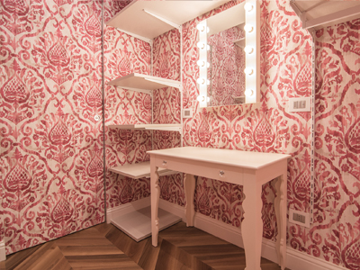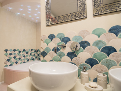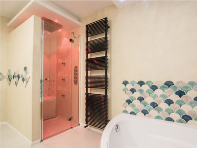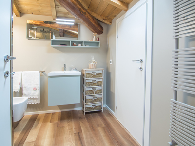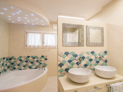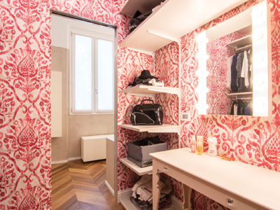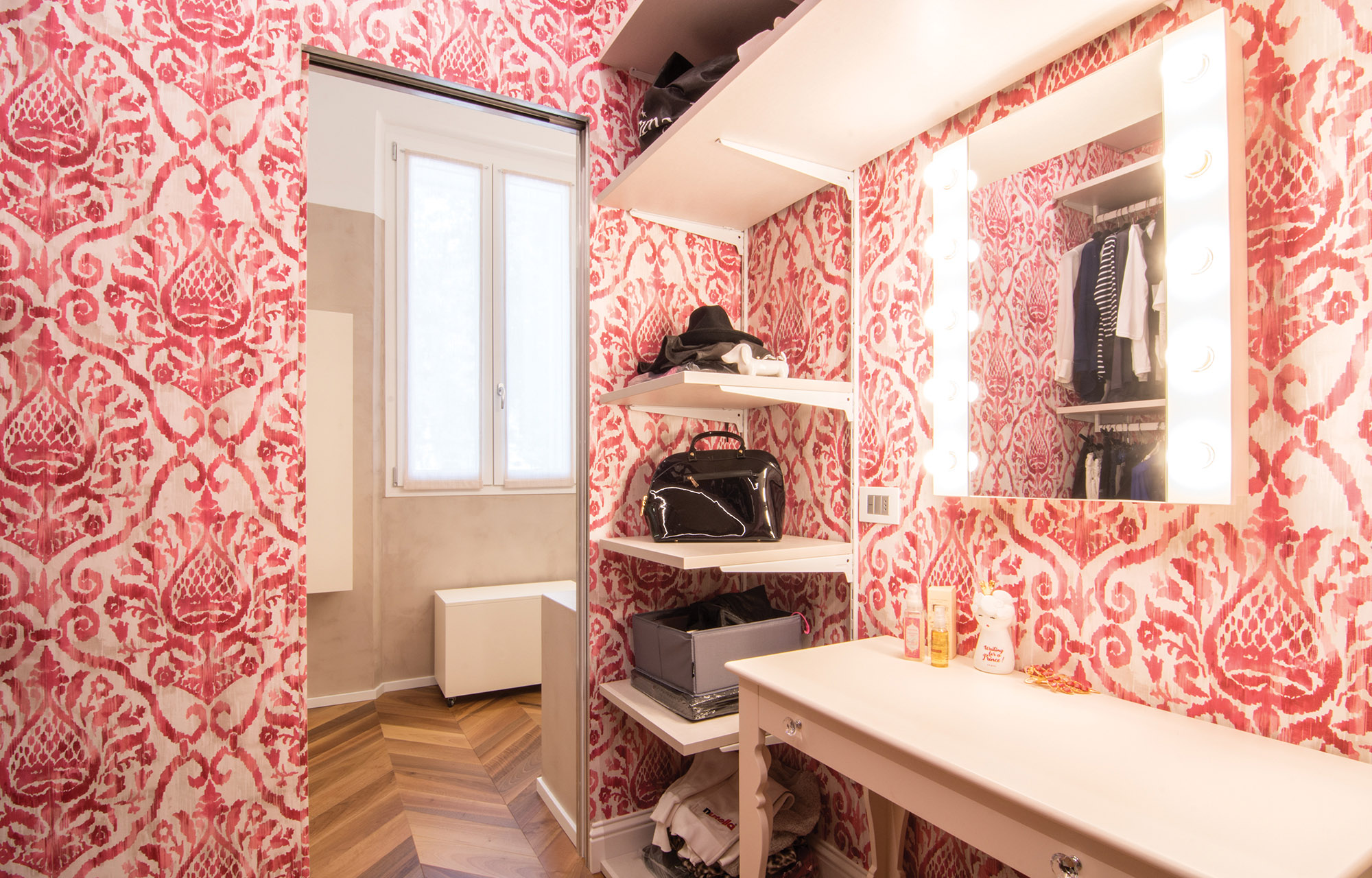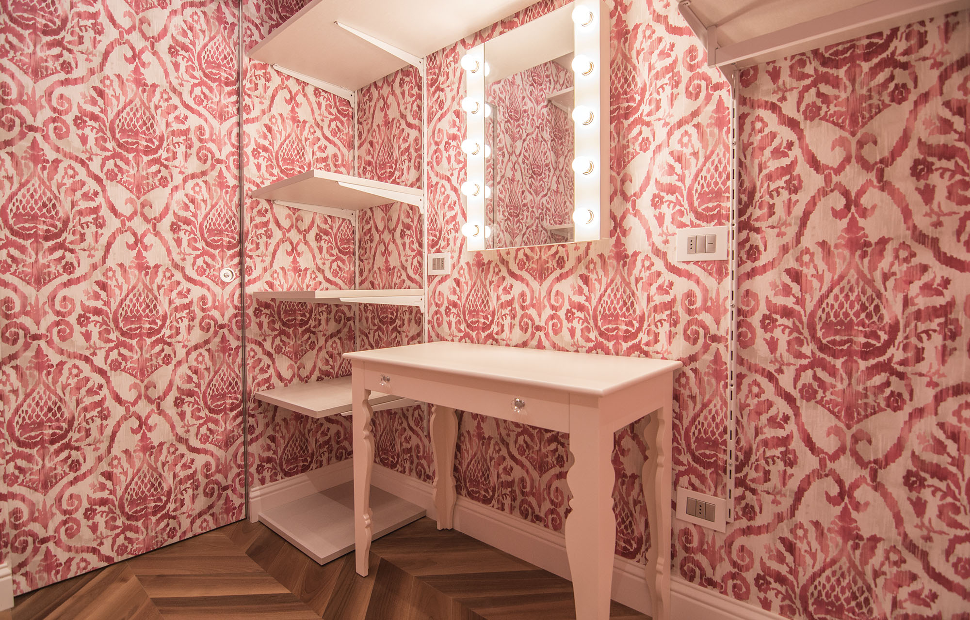 Al piano terra l’unica nota di colore è rappresentata nel bagno “SPA” dalle piastrelle artigianali smaltate a mano di Cotto Antiqua in cinque diversi colori di cui uno personalizzato su richiesta della Progettista che ha deciso di abbinarle ad una resina spatolata (Rapidmix) di un color burro chiaro. Questo grande bagno oltre a due ciotole lavabo ospita una grande vasca angolare con cromoterapia e una doccia doppia con getti idromassaggio, seduta in muratura e soffione extra-large Al primo piano dalla camera padronale si accede direttamente alla cabina armadio passante che conduce al bagno padronale. La cabina armadio è stata realizzata su misura ed ospita la console-trucco “Ameliè” con specchio abbinato su progetto di Rachele Biancalani.