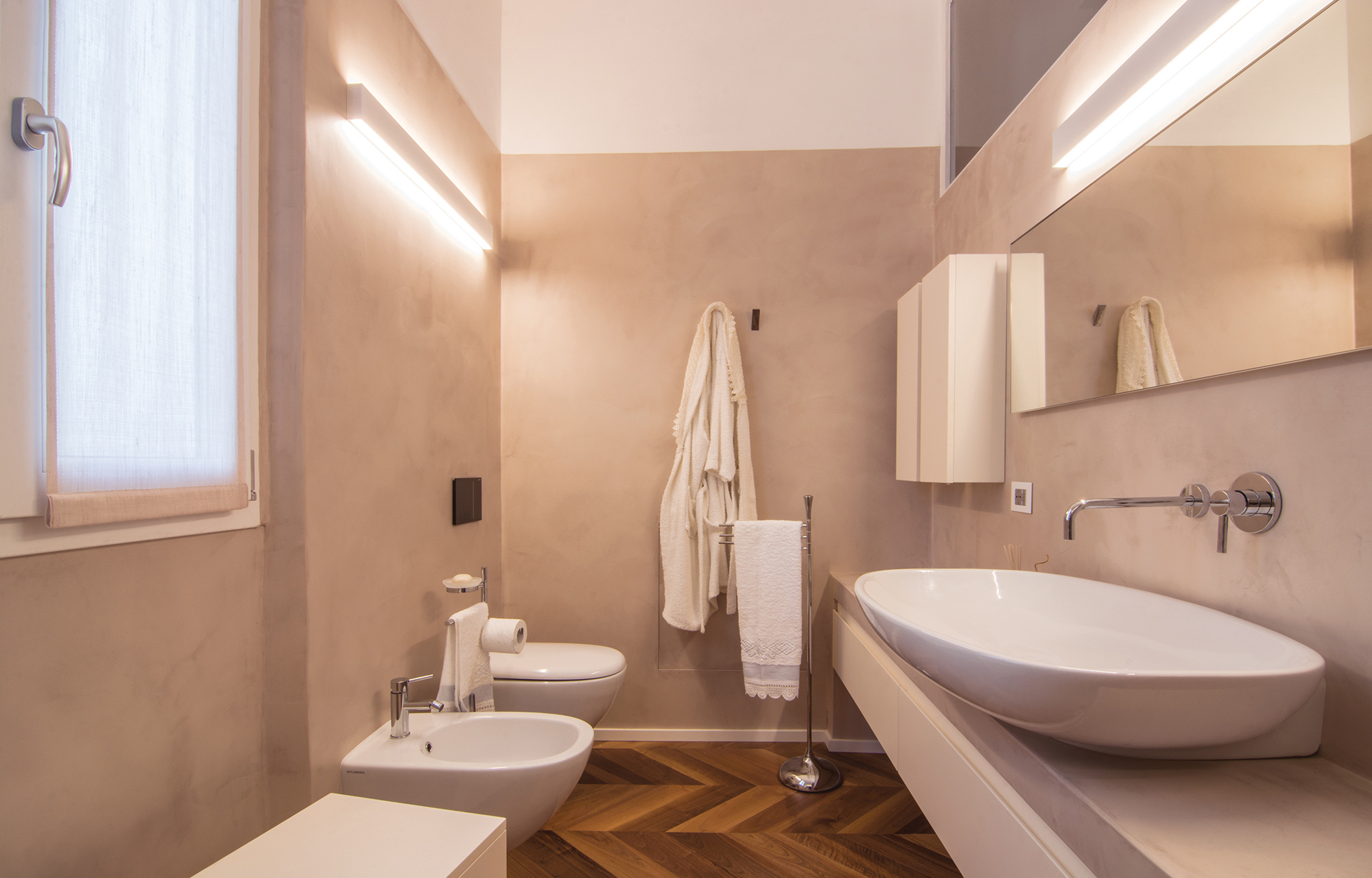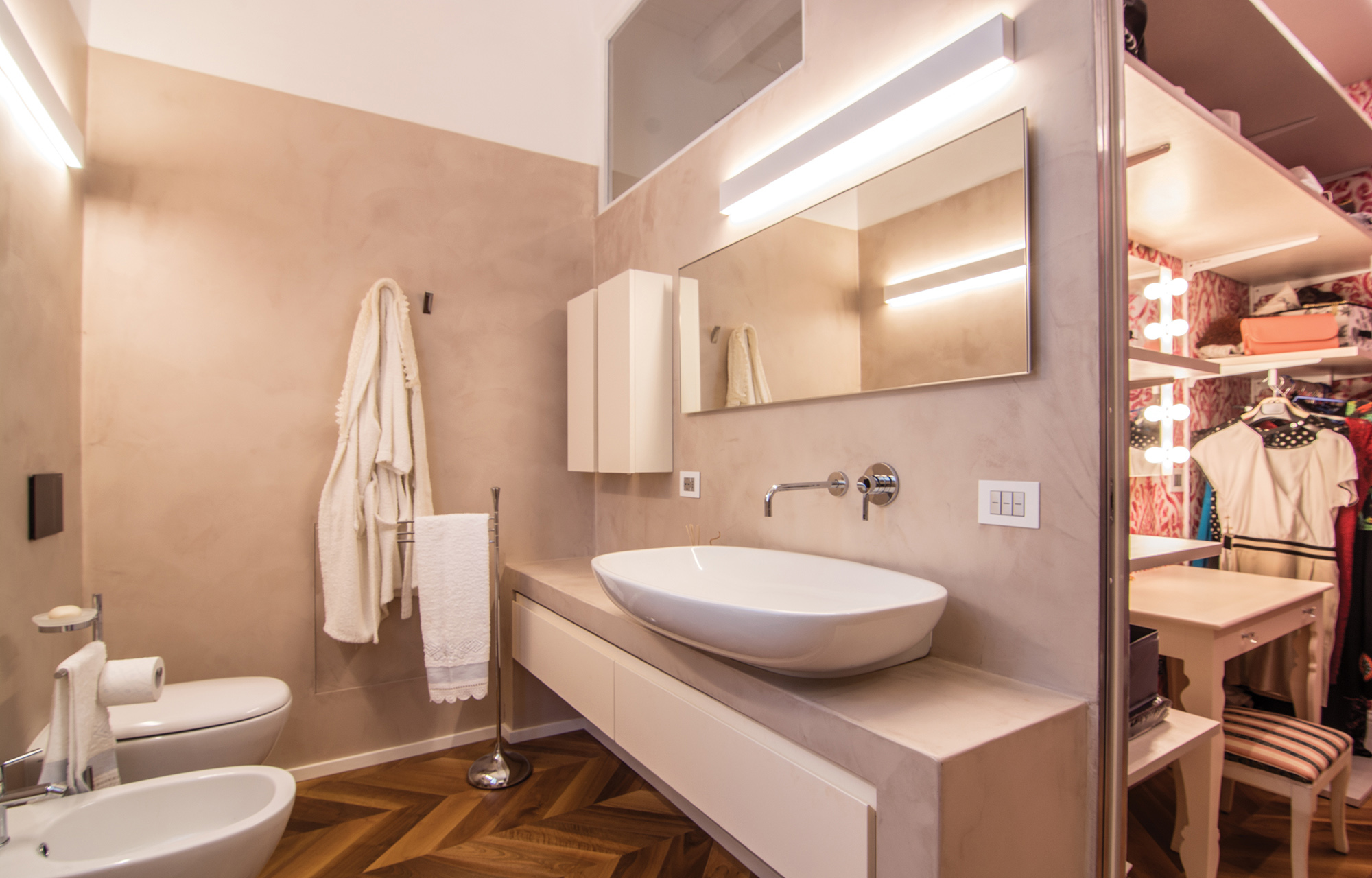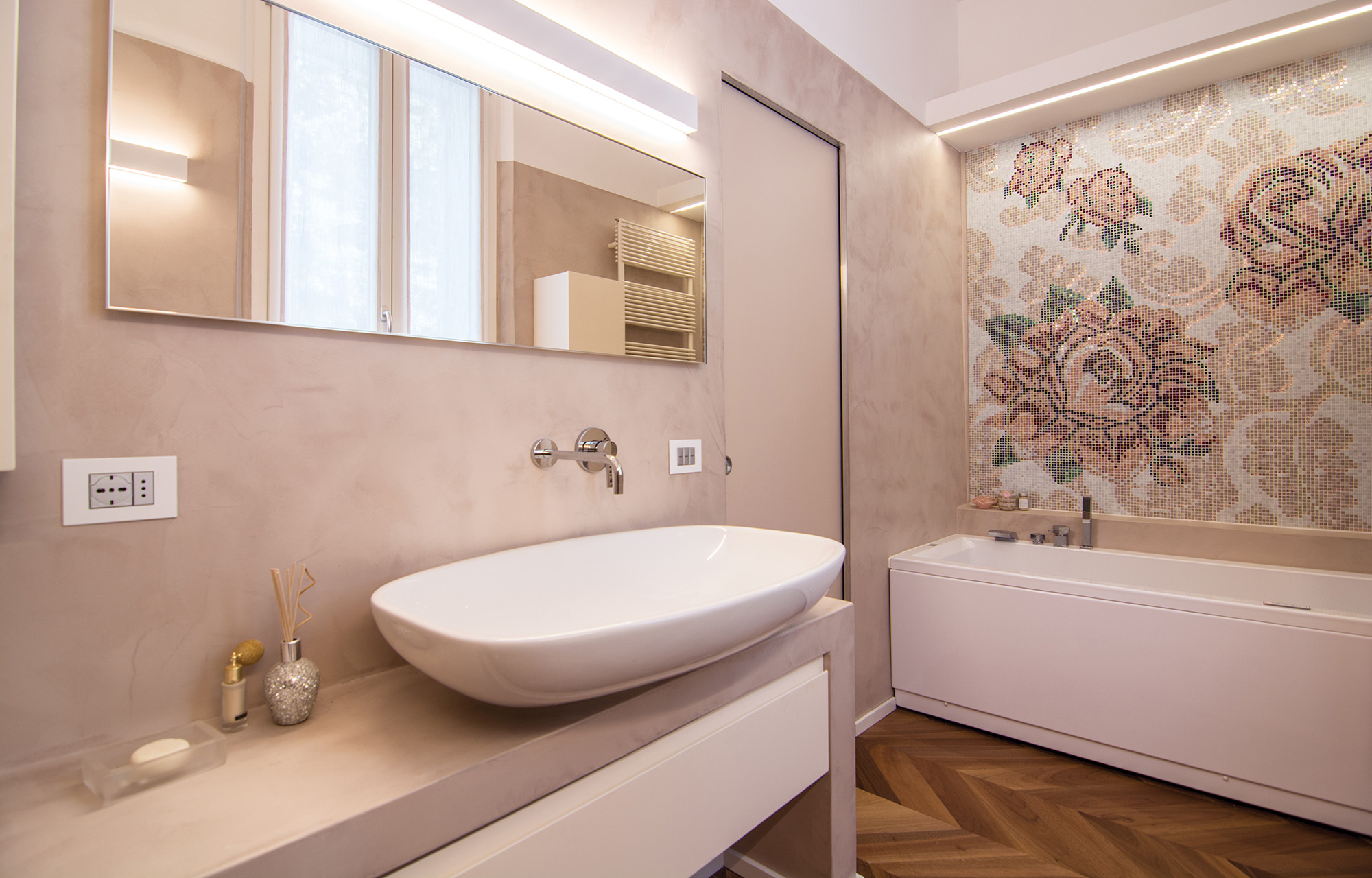 Nei quattro bagni dell’abitazione la decorazione e gli abbinamenti cromatici variano ogni volta: due sono più maschili e realizzati con resine Kerakoll Design, due sono invece più femminili, dalle forme più morbide e realizzati con resine Rapidmix.