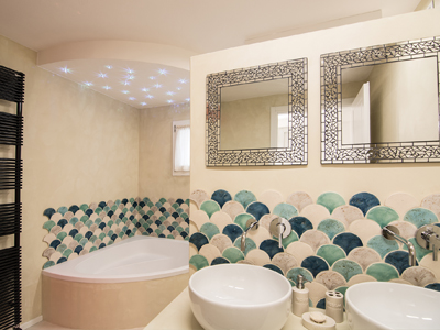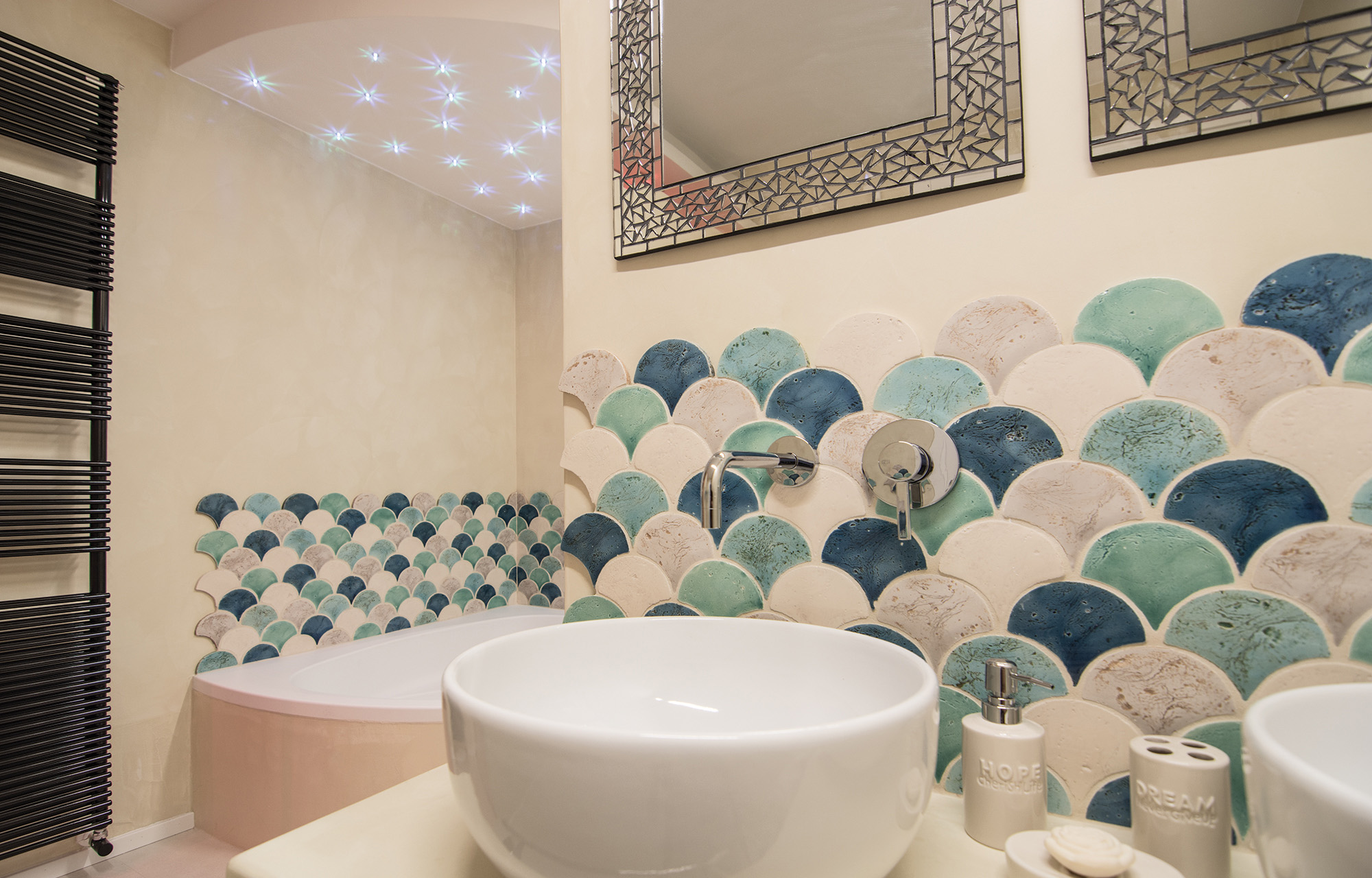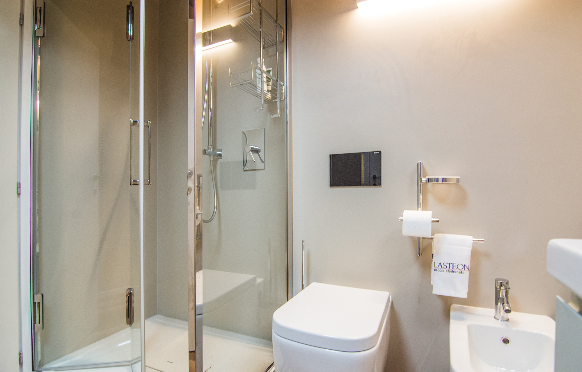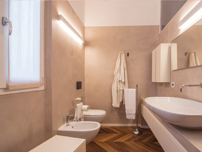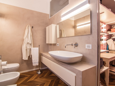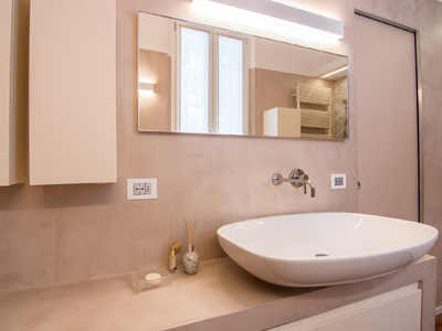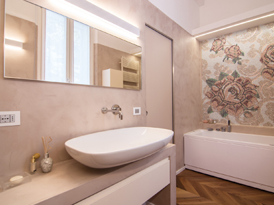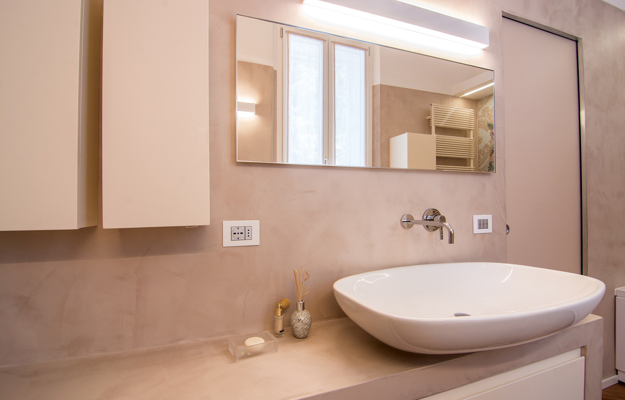Nei quattro bagni dell’abitazione la decorazione e gli abbinamenti cromatici variano ogni volta: due sono più maschili e realizzati con resine Kerakoll Design, due sono invece più femminili, dalle forme più morbide e realizzati con resine Rapidmix.