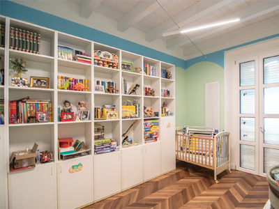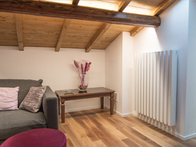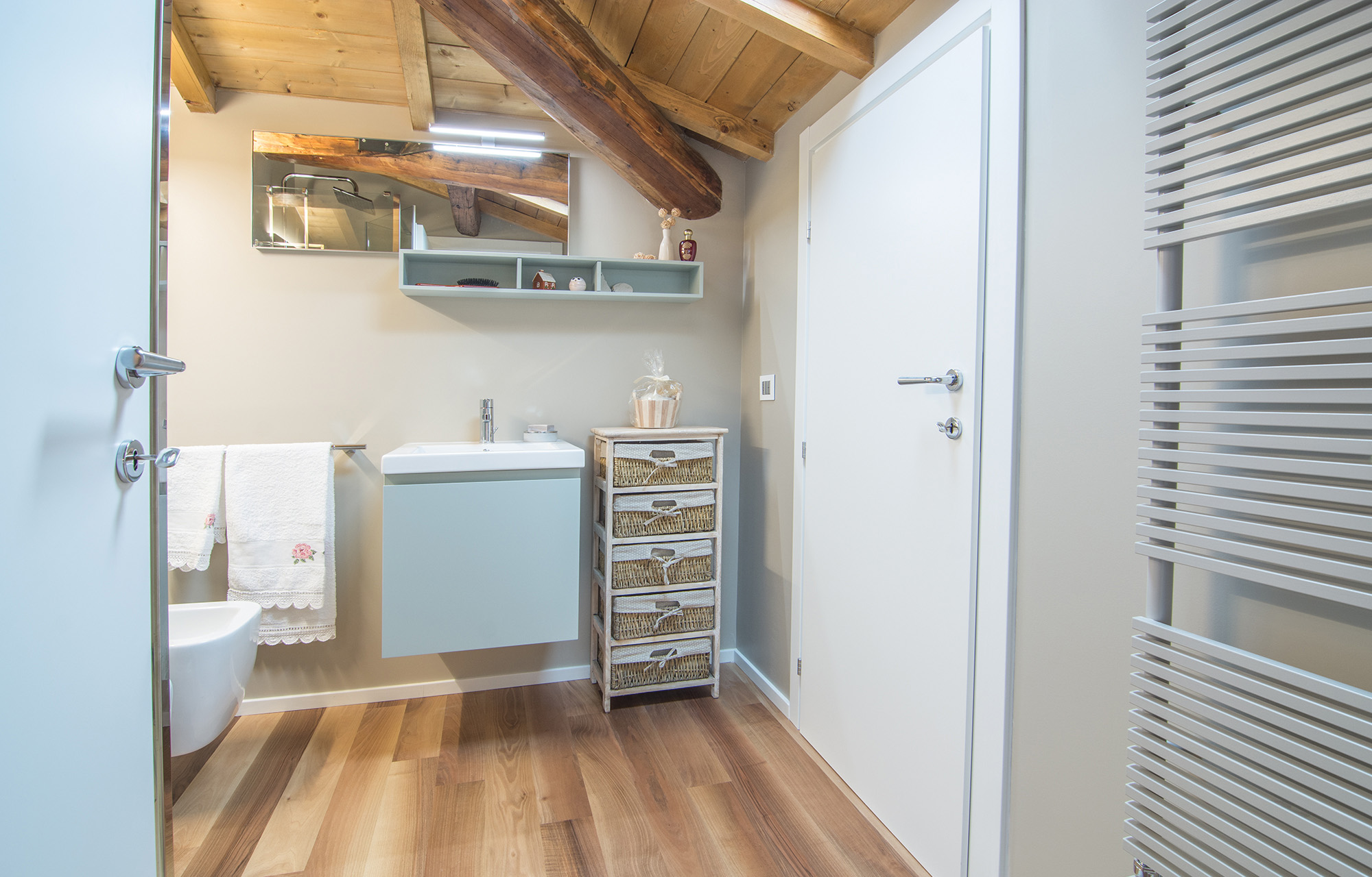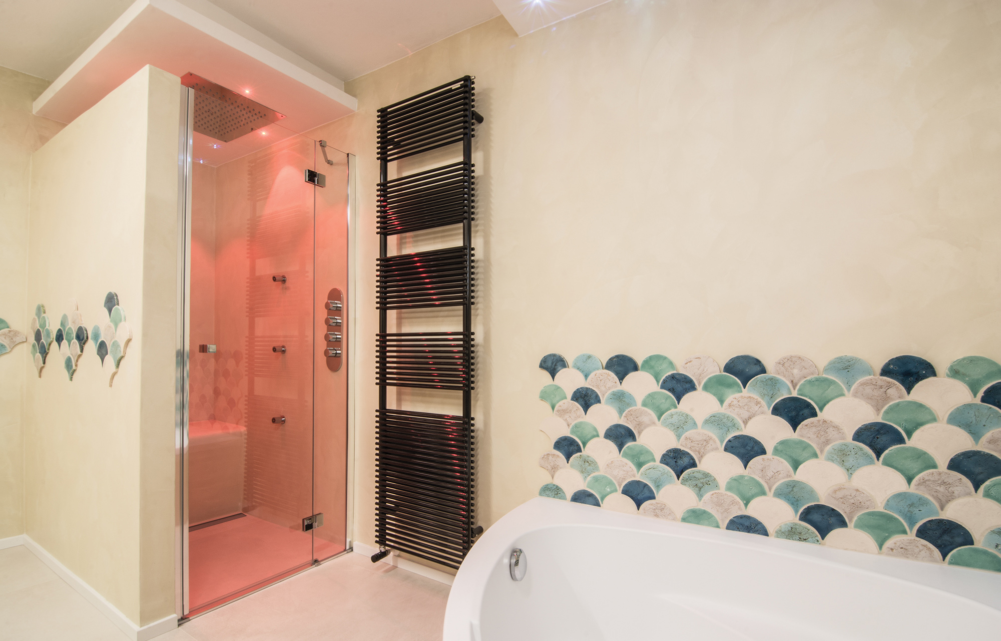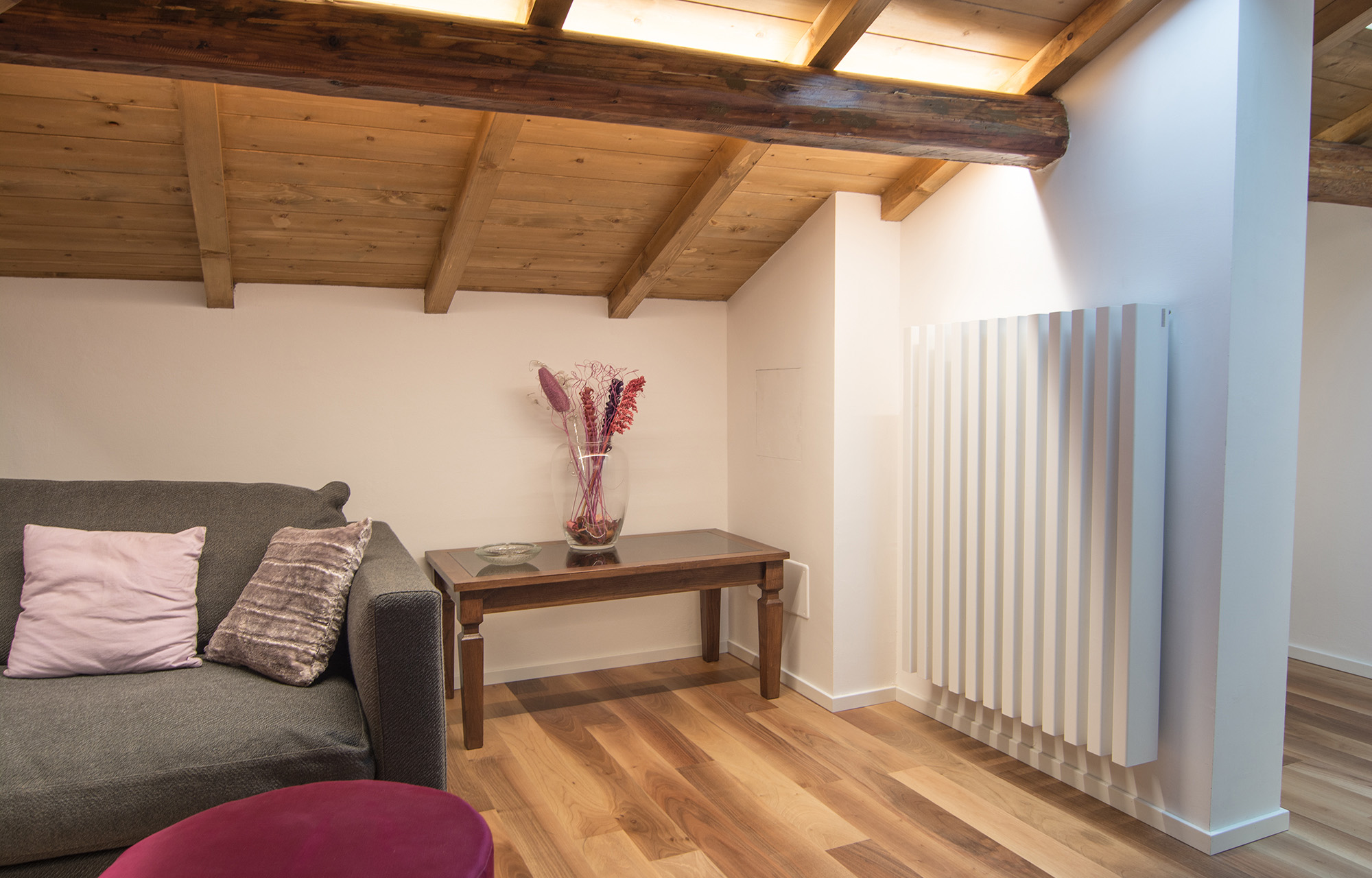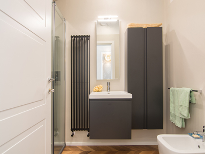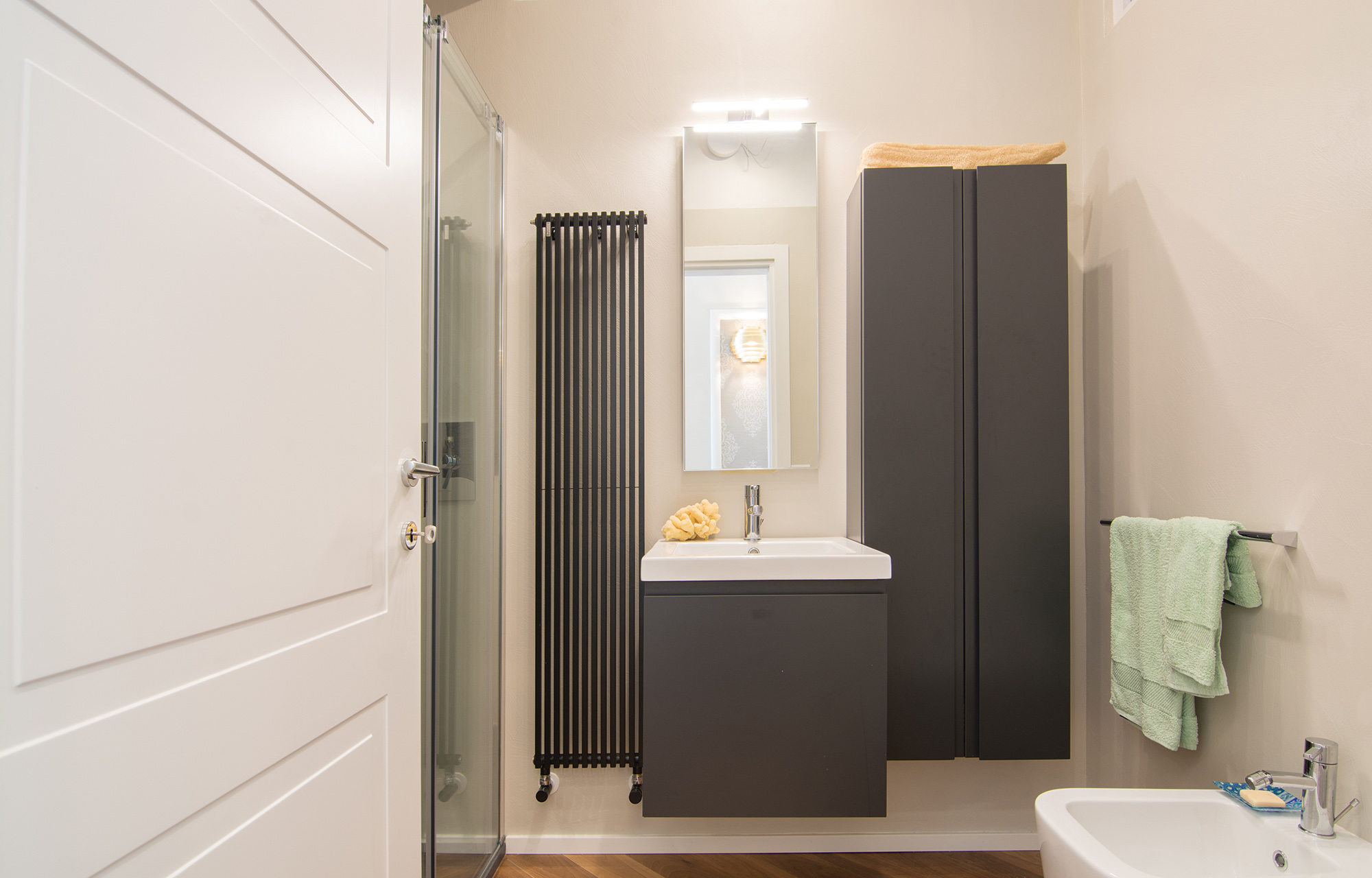 Tutti i radiatori dell’abitazione sono Tubes nei modelli Basics, Kubik e Soho. Le rubinetterie sono di Gessi, i lavabo di ceramica Cielo, Flaminia e Arbi, i sanitari Flaminia e Globo.