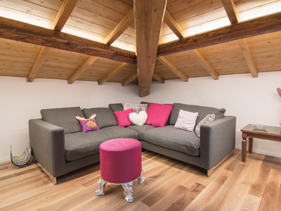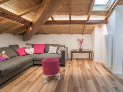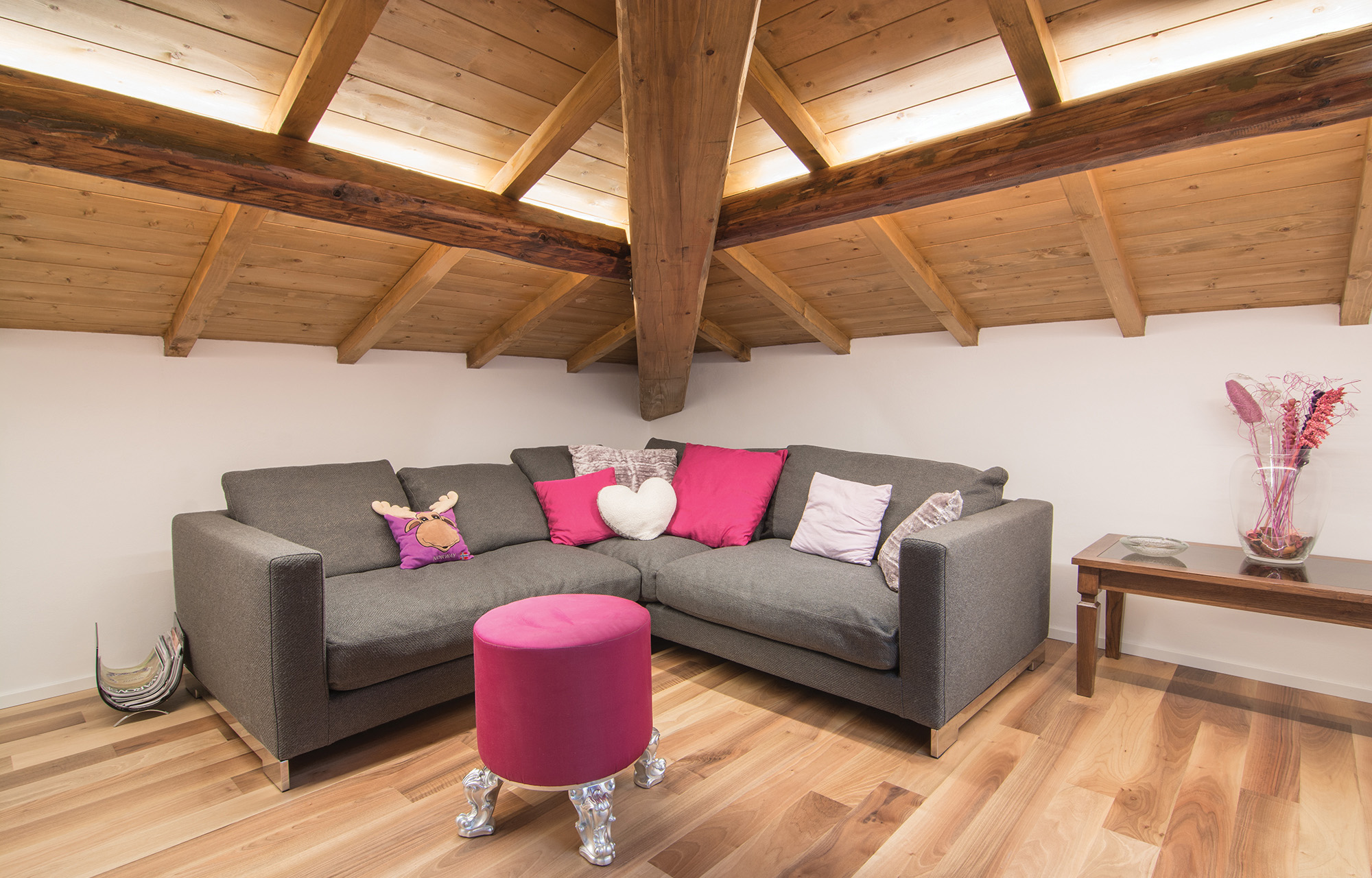 Il nuovo solaio in legno di abete tra piano terra e piano mansardato è stato sbiancato con più mani in modo che l’effetto fosse molto coprente perché così gradiva la Committenza mentre il sotto tetto è stato mordenzato.