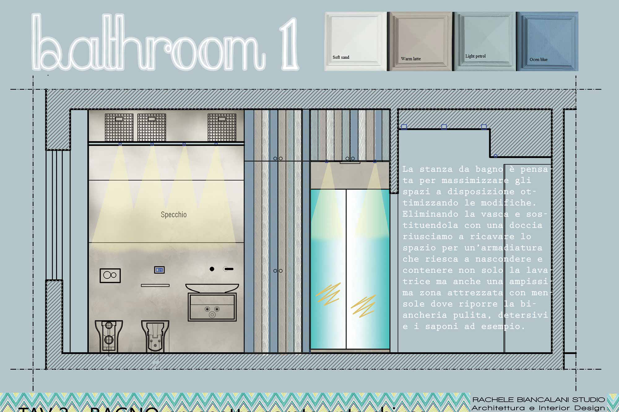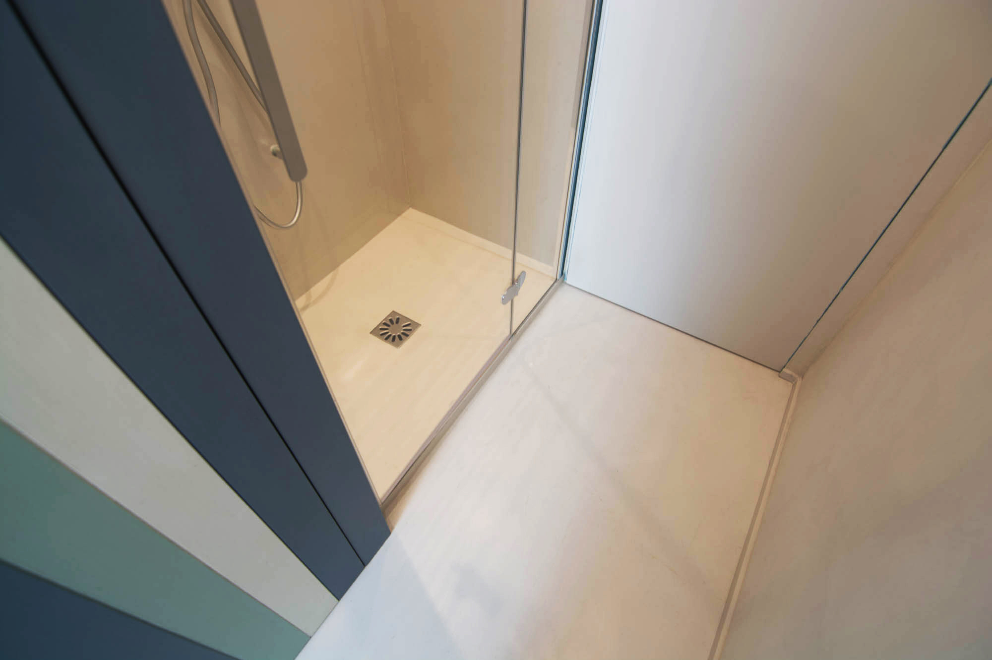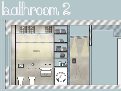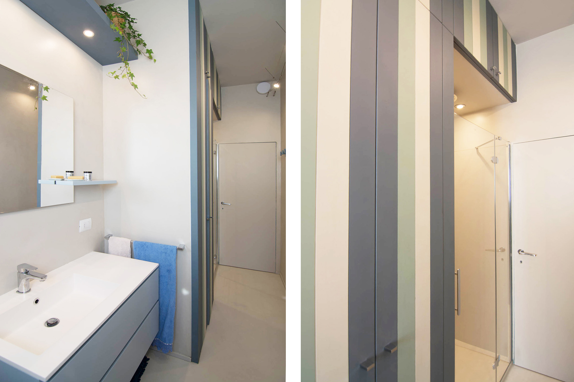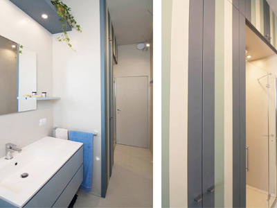 Il nostro Studio si è visto coinvolto in questa ristrutturazione di un appartamento a Firenze che ci ha impegnati dalla redazione del progetto architettonico fino al progetto degli arredi su misura, passando per la Direzione dei Lavori e delle Maestranze. Naturalmente abbiamo curato anche il progetto di Lighting Design scegliendo personalmente le posizioni e la tipologia di tutti i corpi illuminanti presenti nell'abitazione, ovviamente in accordo con la Committenza. Lo studio dei colori ha portato a sviluppare gli azzurri in tutte le loro declinazioni, dal blu profondo fino ai toni più chiari che ben si sposano col colore rovere naturale del pavimento. L'uso della carta da parati ha dato carattere alle stanze, e la Committenza è stata ricompensata del coraggio dimostrato "osando" un po' di colore soprattutto nella camera dei ragazzi che ha per sfondo una carta con uno spettacolare murales stile graffiti. Nota particolare per il bagno: l'unico bagno dell'abitazione è stato studiato al millimetro in modo da inserire al suo interno un grande armadio-contenitore perfettamente integrato col resto degli arredi, che funga da "nascondiglio" per la lavatrice e allo stesso tempo da grande ripostiglio per riporre saponi, biancheria del bagno e panni già lavati in attesa di essere stirati. Tutto questo contenuto in una pannellatura in legno smaltato a mano con fasce di diversi colori che alleggeriscono e rendono variopinto ma allo stesso tempo non stancante, il risultato finale. Materiale usato per il rivestimento del bagno e del piatto doccia: resina e finitura spatolata di Kearkoll. Proprietà di immagini e progetti riservata a Rachele Biancalani Studio