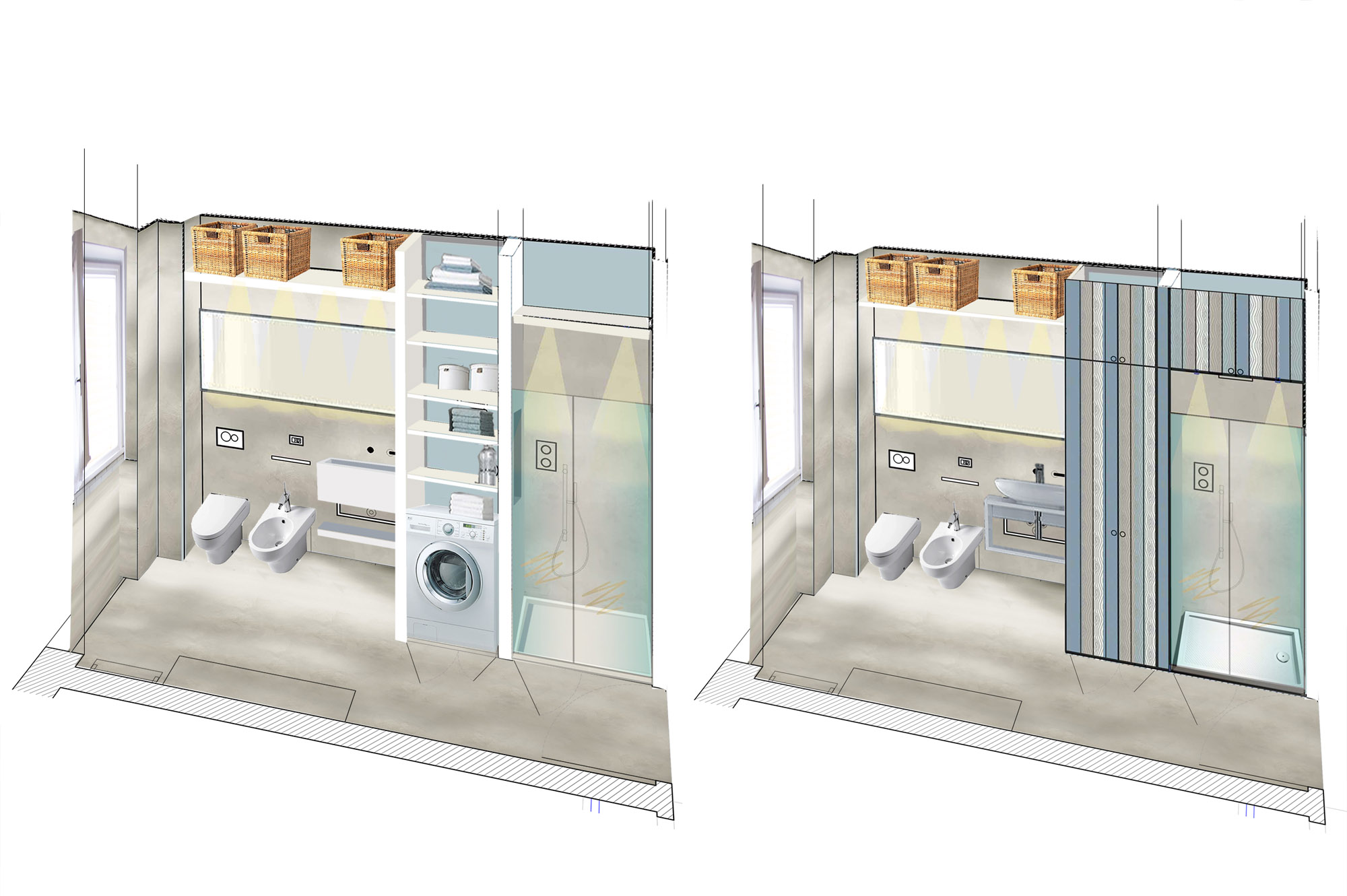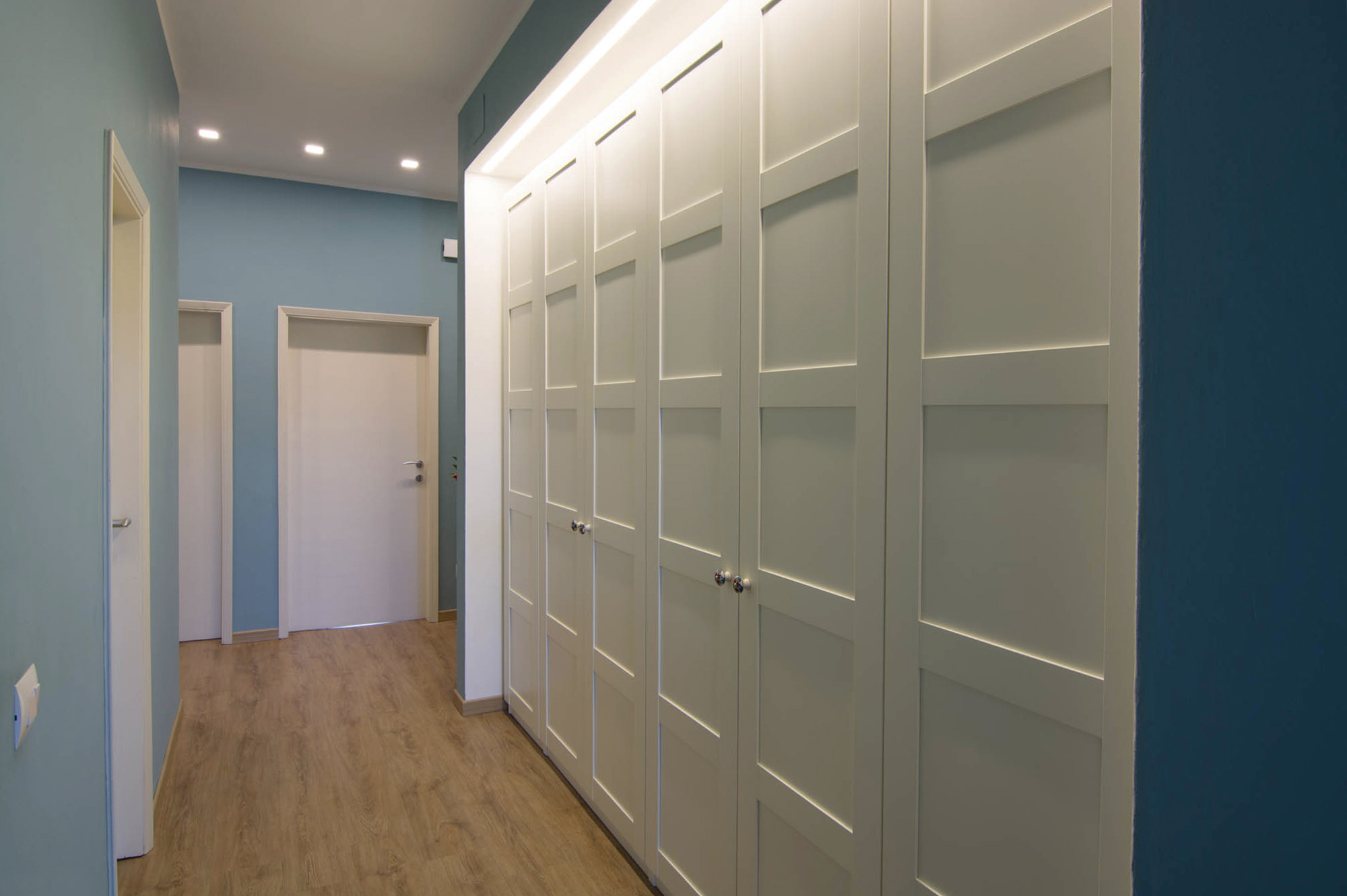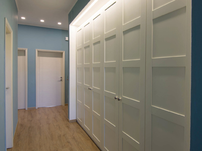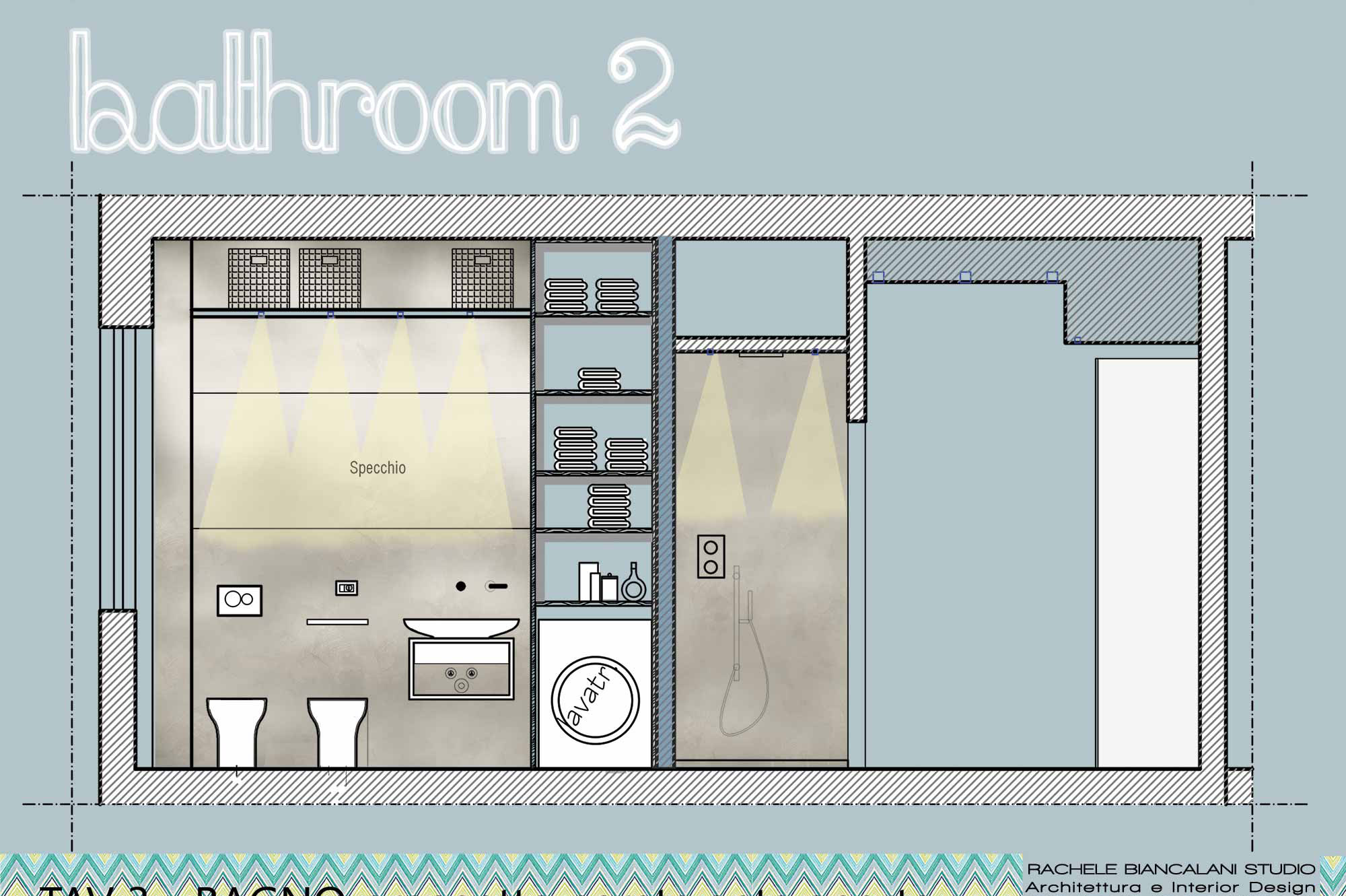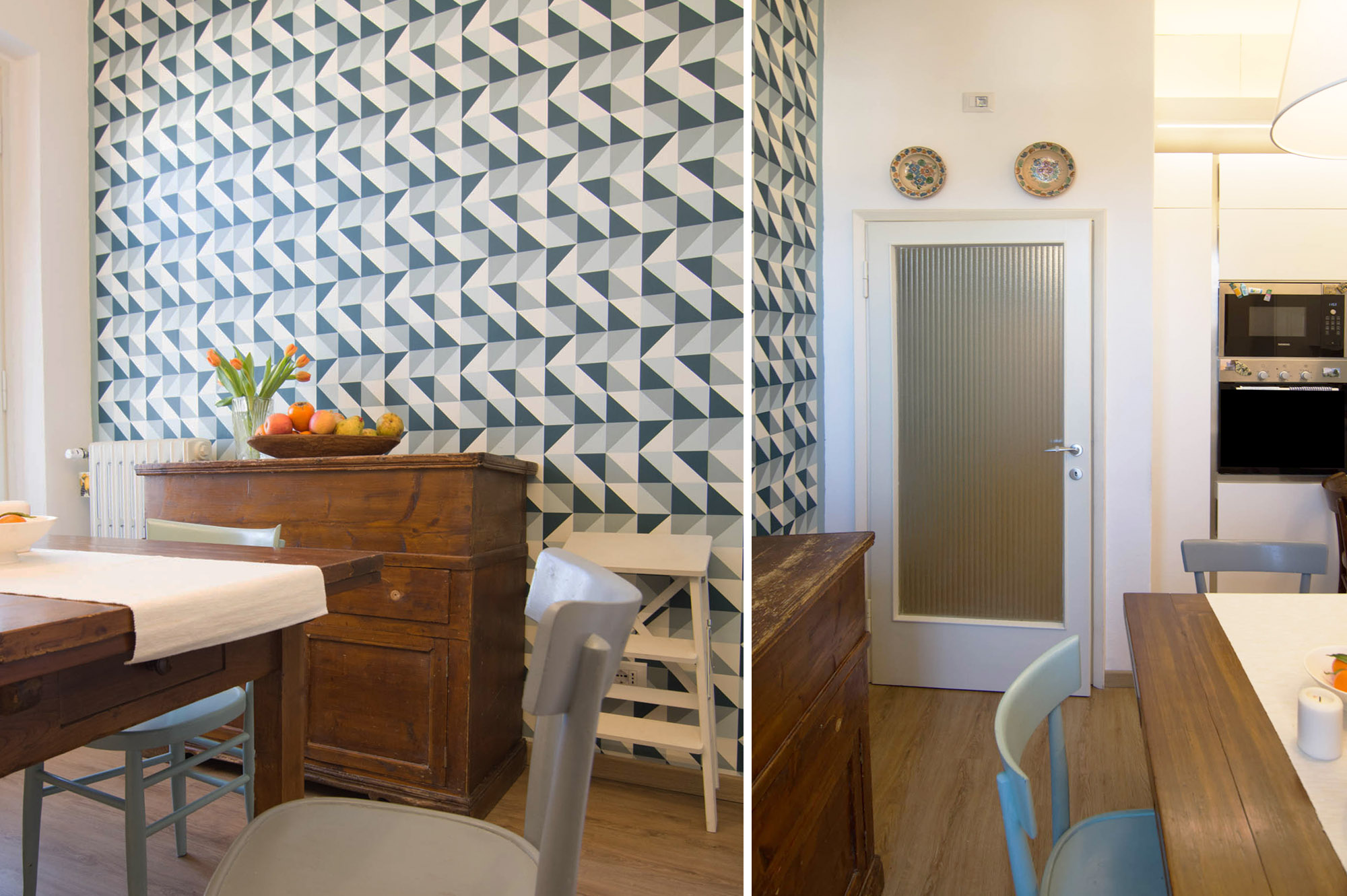 Il nostro Studio si è visto coinvolto in questa ristrutturazione di un appartamento a Firenze che ci ha impegnati dalla redazione del progetto architettonico fino al progetto degli arredi su misura, passando per la Direzione dei Lavori e delle Maestranze. Naturalmente abbiamo curato anche il progetto di Lighting Design scegliendo personalmente le posizioni e la tipologia di tutti i corpi illuminanti presenti nell'abitazione, ovviamente in accordo con la Committenza. Lo studio dei colori ha portato a sviluppare gli azzurri in tutte le loro declinazioni, dal blu profondo fino ai toni più chiari che ben si sposano col colore rovere naturale del pavimento. L'uso della carta da parati ha dato carattere alle stanze, e la Committenza è stata ricompensata del coraggio dimostrato "osando" un po' di colore soprattutto nella camera dei ragazzi che ha per sfondo una carta con uno spettacolare murales stile graffiti. Nota particolare per il bagno: l'unico bagno dell'abitazione è stato studiato al millimetro in modo da inserire al suo interno un grande armadio-contenitore perfettamente integrato col resto degli arredi, che funga da "nascondiglio" per la lavatrice e allo stesso tempo da grande ripostiglio per riporre saponi, biancheria del bagno e panni già lavati in attesa di essere stirati. Tutto questo contenuto in una pannellatura in legno smaltato a mano con fasce di diversi colori che alleggeriscono e rendono variopinto ma allo stesso tempo non stancante, il risultato finale. Materiale usato per il rivestimento del bagno e del piatto doccia: resina e finitura spatolata di Kearkoll. Proprietà di immagini e progetti riservata a Rachele Biancalani Studio