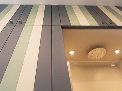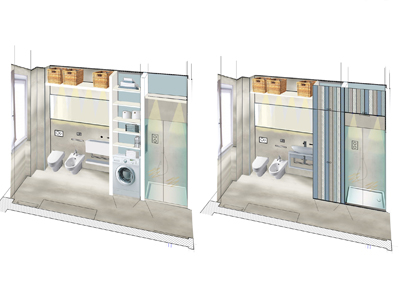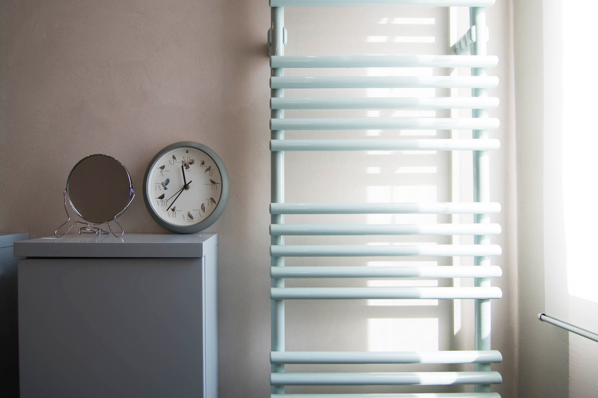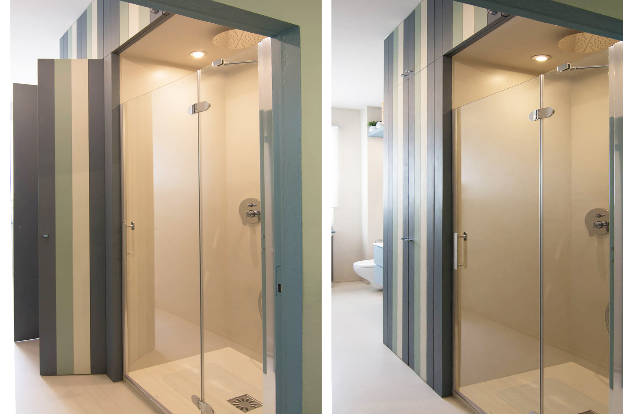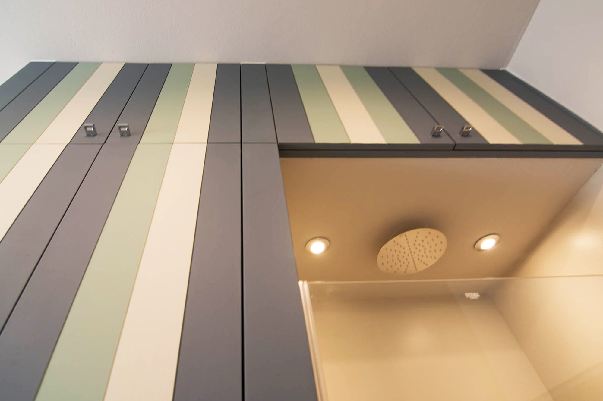 Il nostro Studio si è visto coinvolto in questa ristrutturazione di un appartamento a Firenze che ci ha impegnati dalla redazione del progetto architettonico fino al progetto degli arredi su misura, passando per la Direzione dei Lavori e delle Maestranze. Naturalmente abbiamo curato anche il progetto di Lighting Design scegliendo personalmente le posizioni e la tipologia di tutti i corpi illuminanti presenti nell'abitazione, ovviamente in accordo con la Committenza. Lo studio dei colori ha portato a sviluppare gli azzurri in tutte le loro declinazioni, dal blu profondo fino ai toni più chiari che ben si sposano col colore rovere naturale del pavimento. L'uso della carta da parati ha dato carattere alle stanze, e la Committenza è stata ricompensata del coraggio dimostrato "osando" un po' di colore soprattutto nella camera dei ragazzi che ha per sfondo una carta con uno spettacolare murales stile graffiti. Nota particolare per il bagno: l'unico bagno dell'abitazione è stato studiato al millimetro in modo da inserire al suo interno un grande armadio-contenitore perfettamente integrato col resto degli arredi, che funga da "nascondiglio" per la lavatrice e allo stesso tempo da grande ripostiglio per riporre saponi, biancheria del bagno e panni già lavati in attesa di essere stirati. Tutto questo contenuto in una pannellatura in legno smaltato a mano con fasce di diversi colori che alleggeriscono e rendono variopinto ma allo stesso tempo non stancante, il risultato finale. Materiale usato per il rivestimento del bagno e del piatto doccia: resina e finitura spatolata di Kearkoll. Proprietà di immagini e progetti riservata a Rachele Biancalani Studio