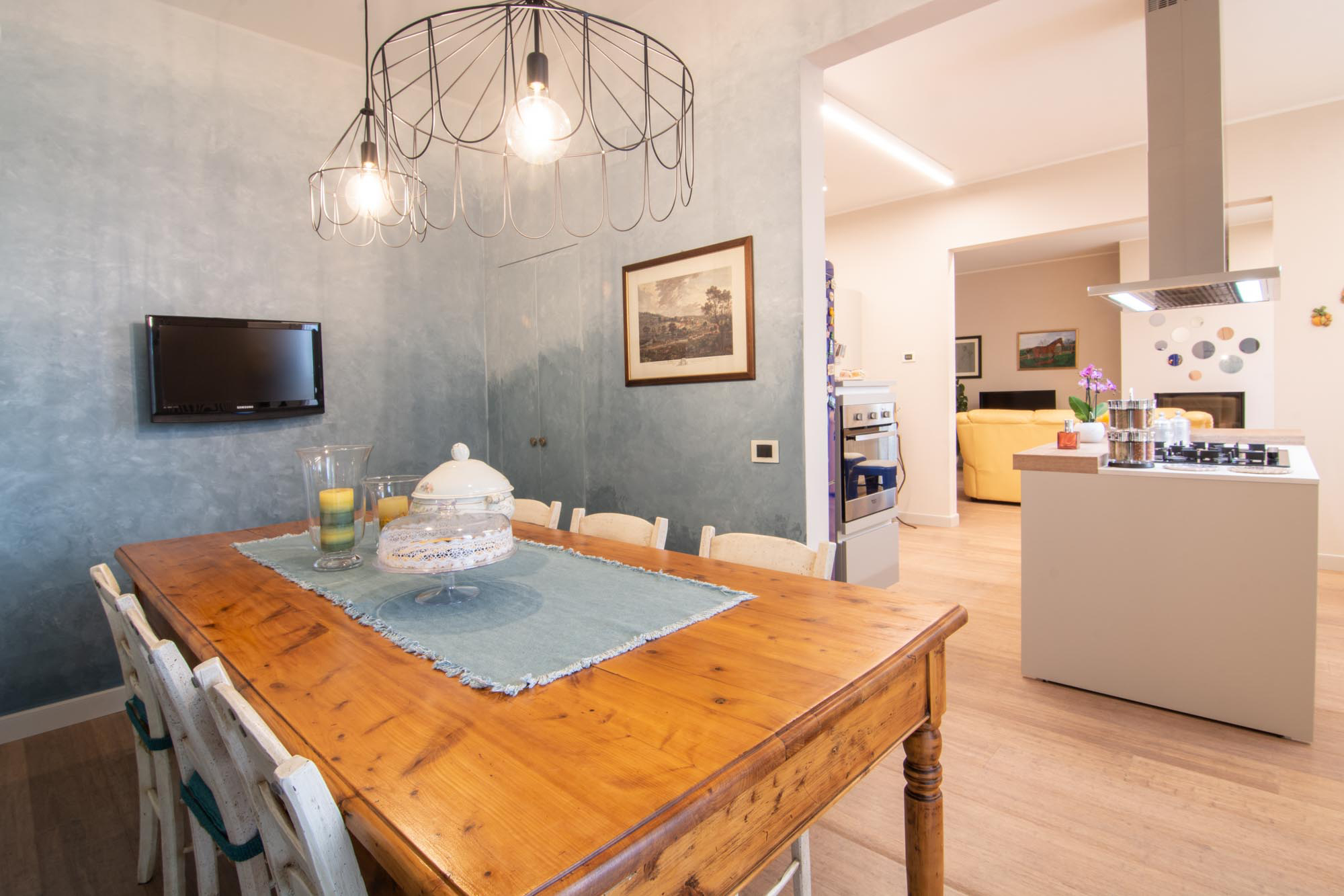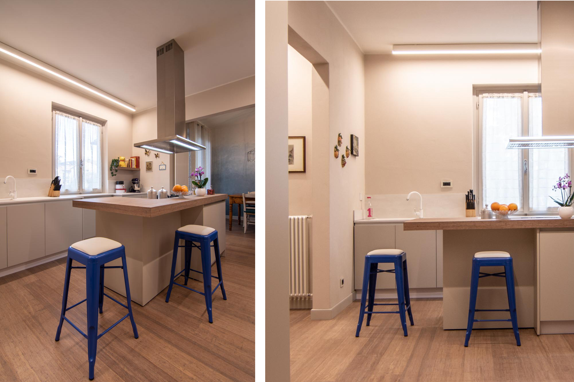 La richiesta era quella di creare una zona giorno open-space, richiesta che trova sempre una grande approvazione da parte mia che amo gli ambienti polifunzionali, ampi e senza pareti divisorie. Il grosso problema però era proprio la struttura inamovibile che rendeva difficoltosa la creazione di un ambiente fluido. Dopo alcuni tentativi abbiamo individuato una planimetria che, con poche modifiche strutturali, mettesse la cucina in una zona centrale aperta sul living ed abbiamo invece spostato la sala da pranzo in una stanza dedicata che prima ospitava la cucina.