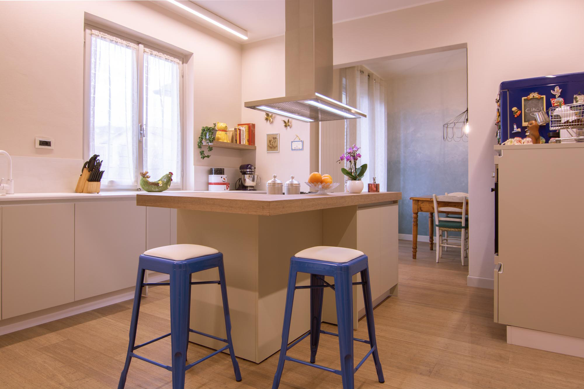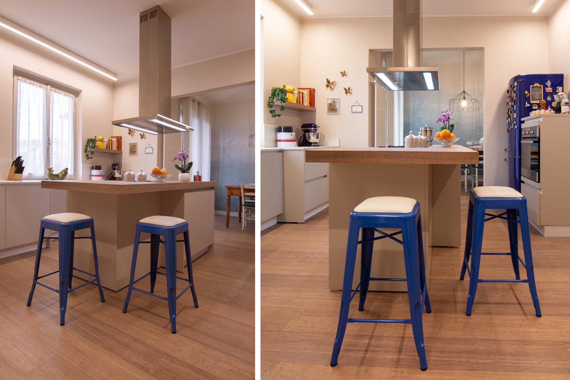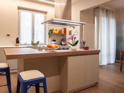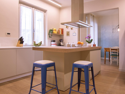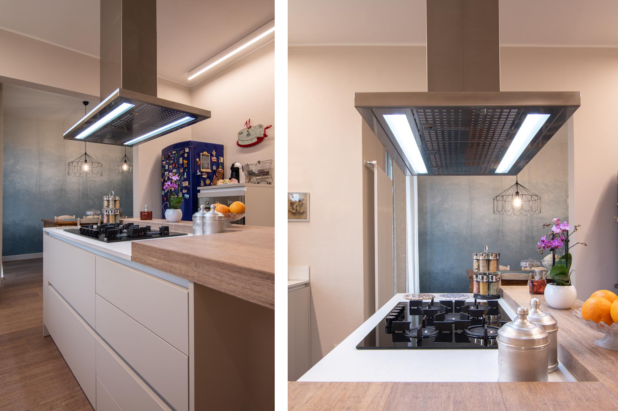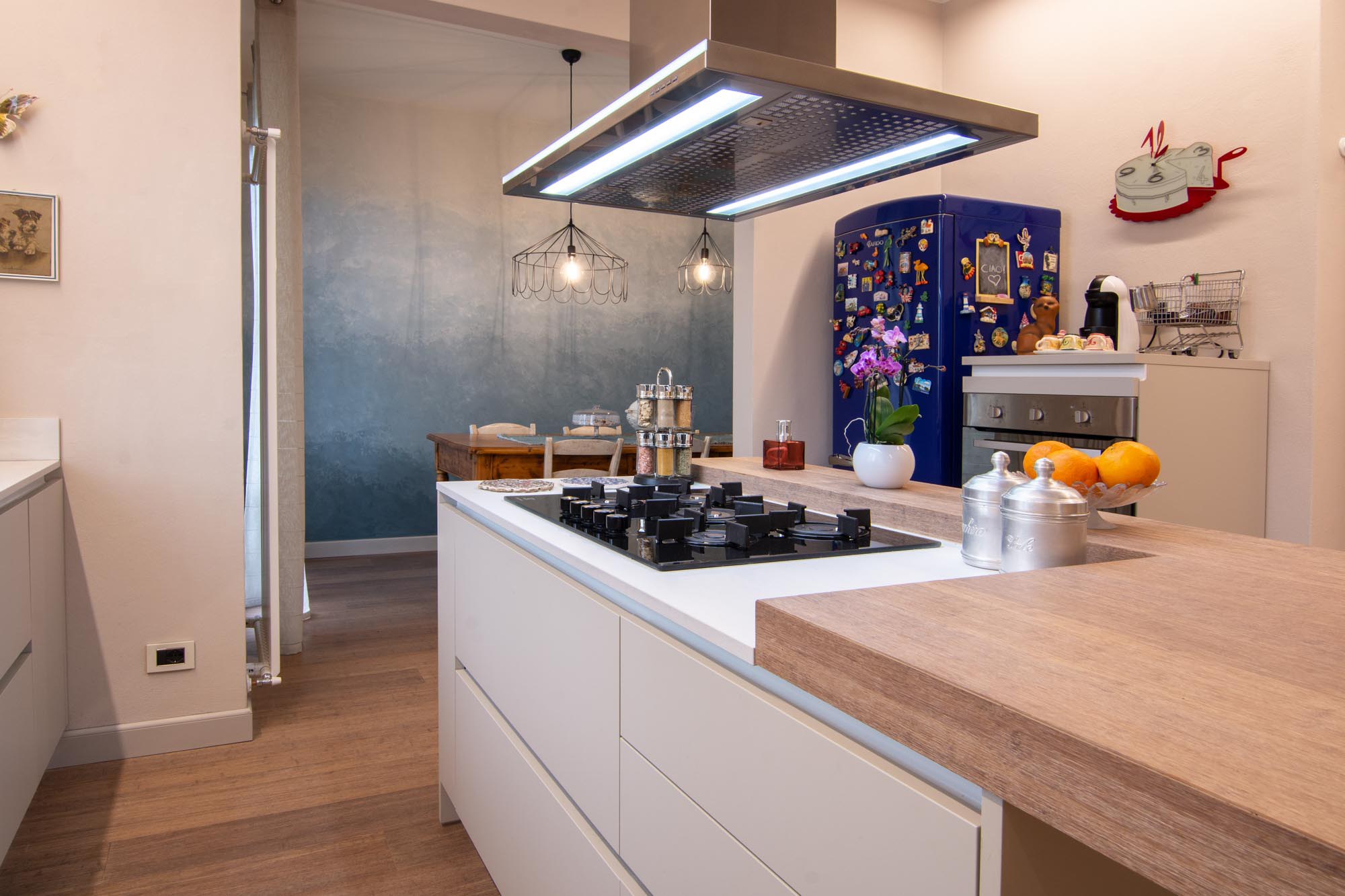 La cucina (Stosa) è composta da un’isola centrale munita di fuochi e dotata di un bancone in legno che è stato fatto realizzare su misura da un falegname utilizzando lo stesso legno usato per il parquet ovvero un resistentissimo e super ecologico bamboo termocotto, spazzolato e sbiancato.