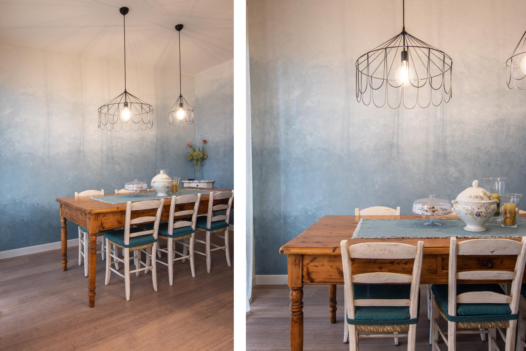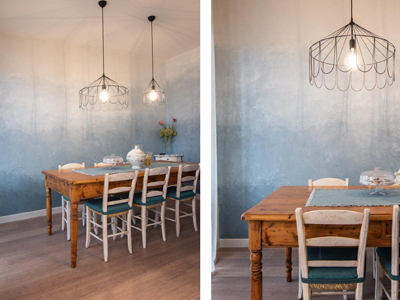 La sala da pranzo ha una dimensione piuttosto contenuta e per questo motivo non vi sono stati posizionati arredi. Le pareti sono state trattate con una pittura spatolata degradé che cambia gradualmente colore da carta zucchero a bianco e crea una sorta di effetto ottico, una sorta di moderno trompe-l’oeil realizzato con la finitura Dune opaco di Novacolor.