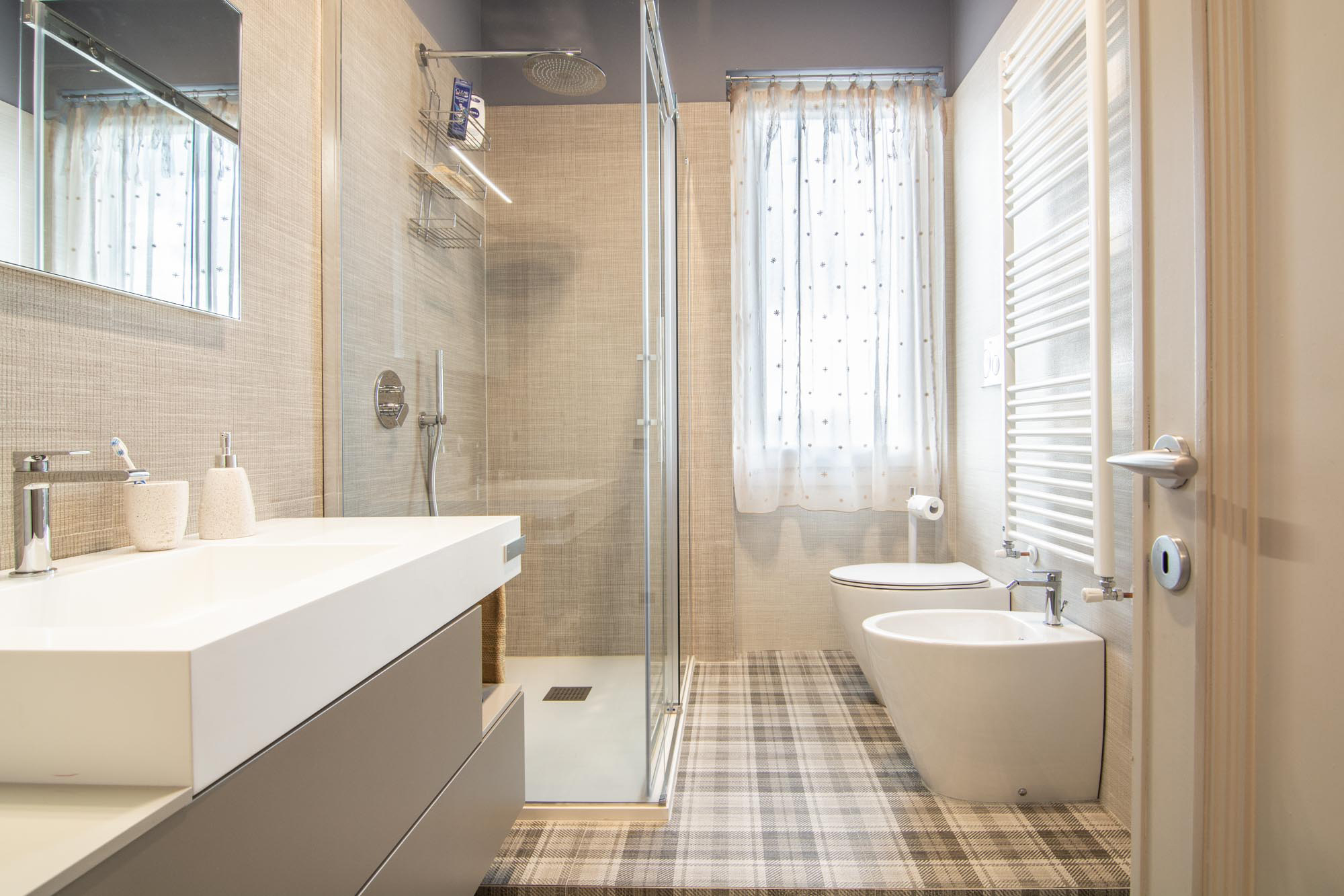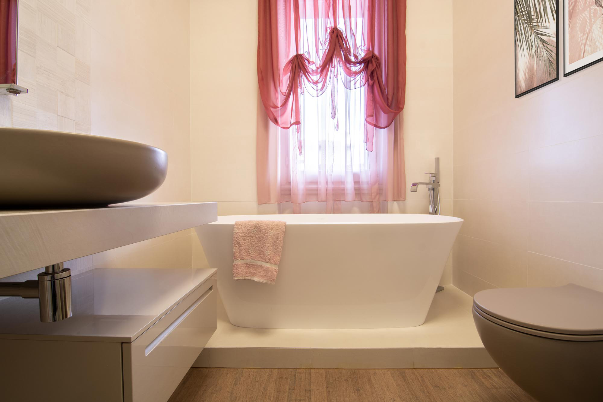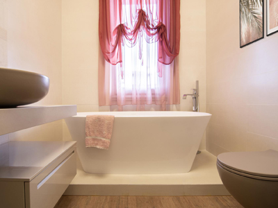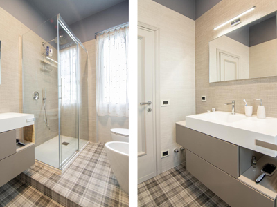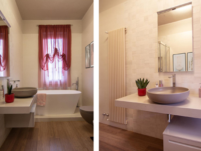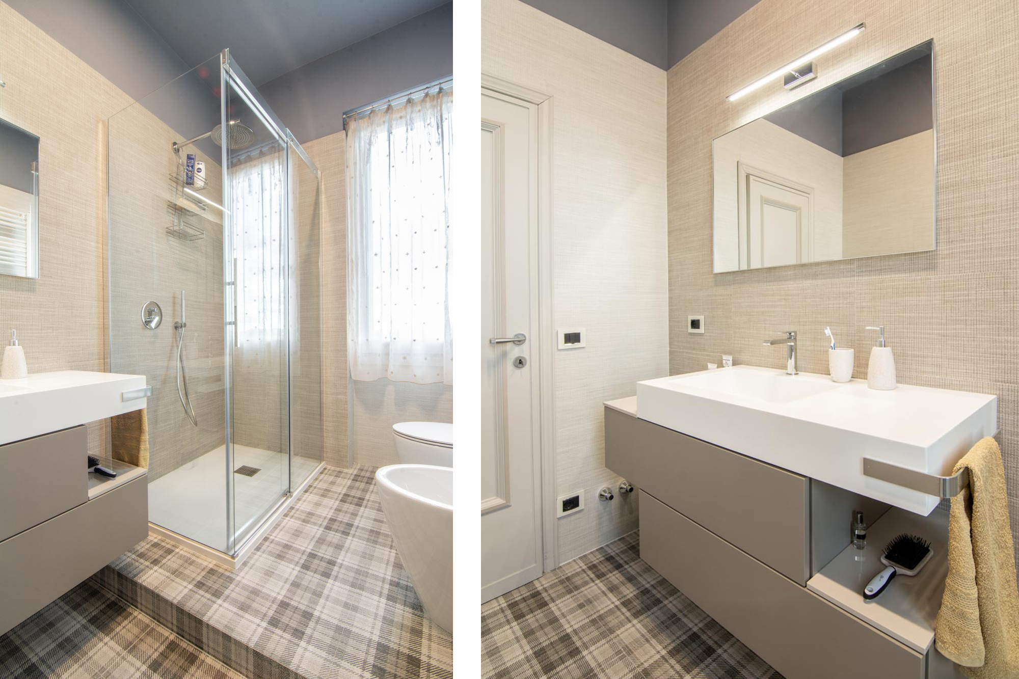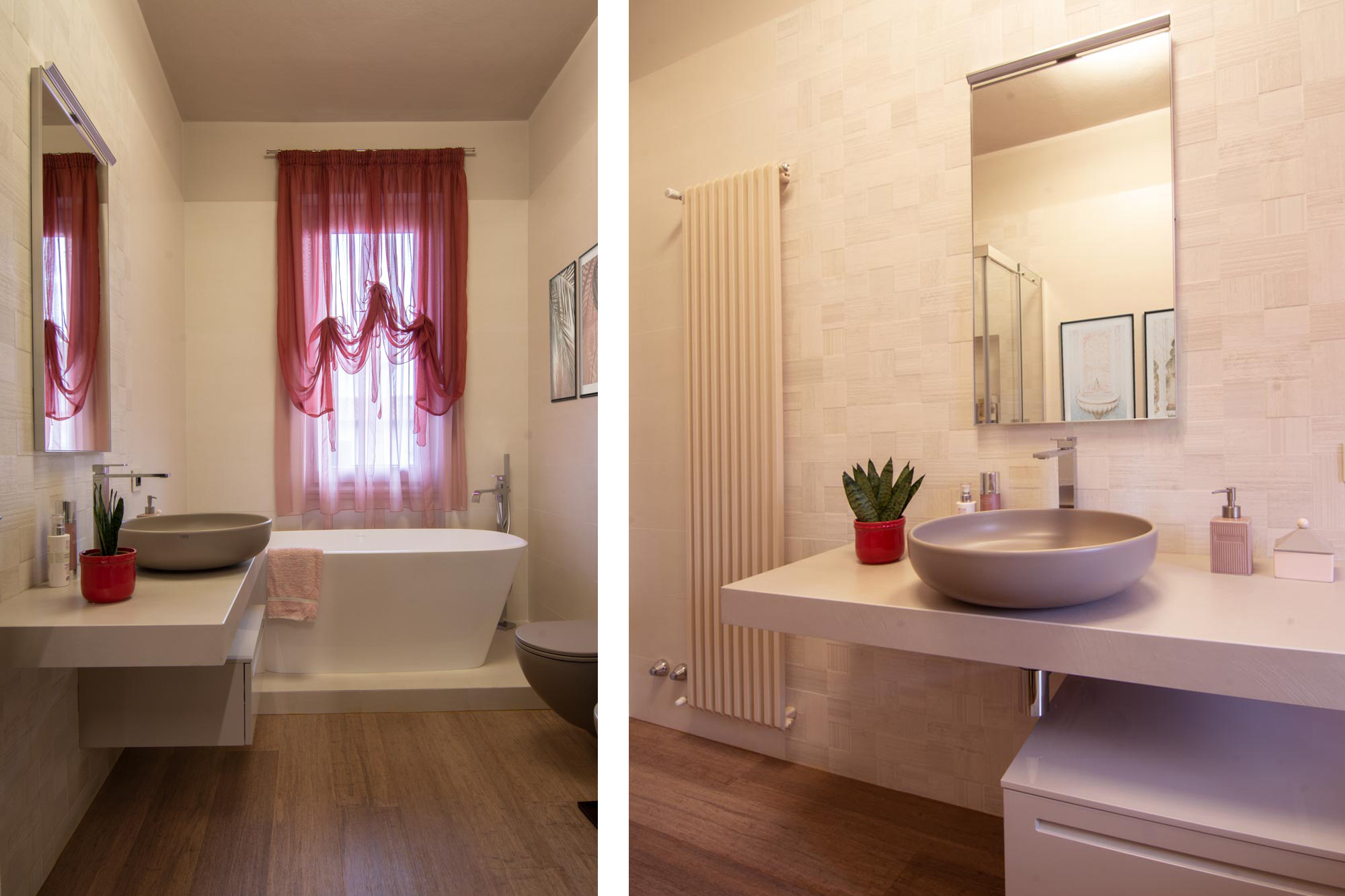 I due bagni dell’abitazione sono stati completamente rinnovati a partire dal tagli architettonico e dalla disposizione dei sanitari che non era molto funzionale. Nel bagno grande abbiamo posizionato una vasca freestanding in posizione centrale sotto la finestra, il bagno secondario è stato ampliato per inserirvi una doccia ampia (80x100) e un bel mobile lavabo. I sanitari sono dell’azienda Ceramica Cielo, modello Smile sospesi. Colorati per il bagno grande, bianchi per quello con doccia. Tutti i piatti doccia sono in resina e la vasca è in Live Tech. Pavimenti e rivestimenti in grès sono di Ceramica Sant’Agostino, serie Tailorart che ha la caratteristica di avere texture materiche che imitano il tessuto. I colori utilizzati per i soffitti dei bagni sono più scuri dei colori che utilizziamo di solito per rendere più accoglienti gli ambienti.