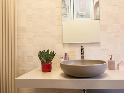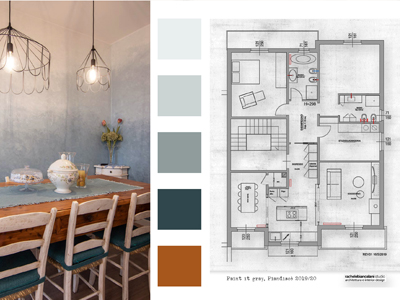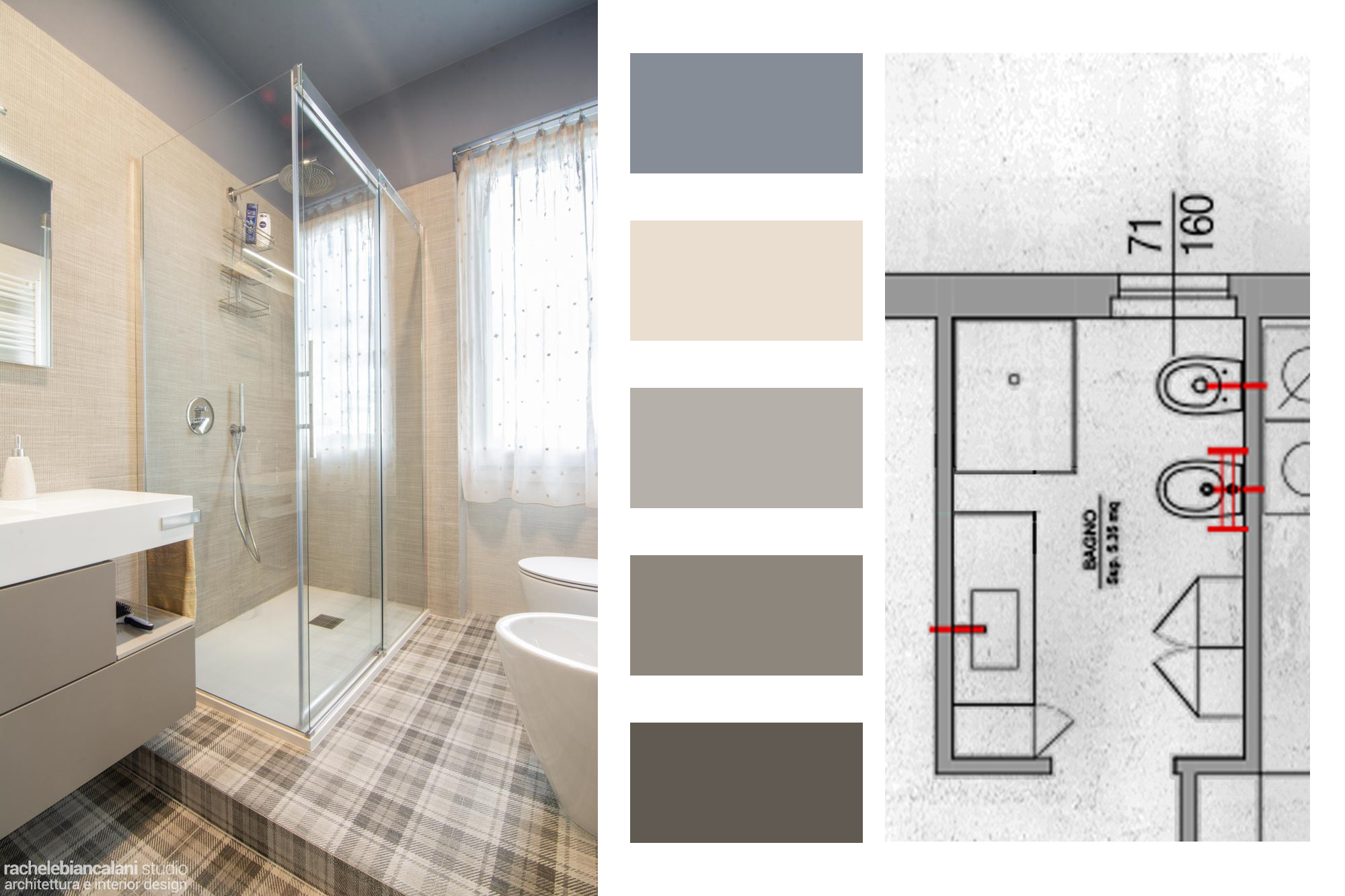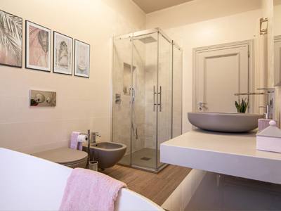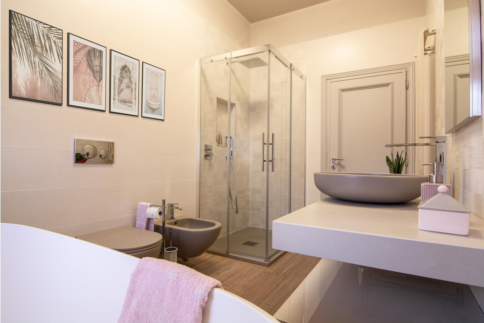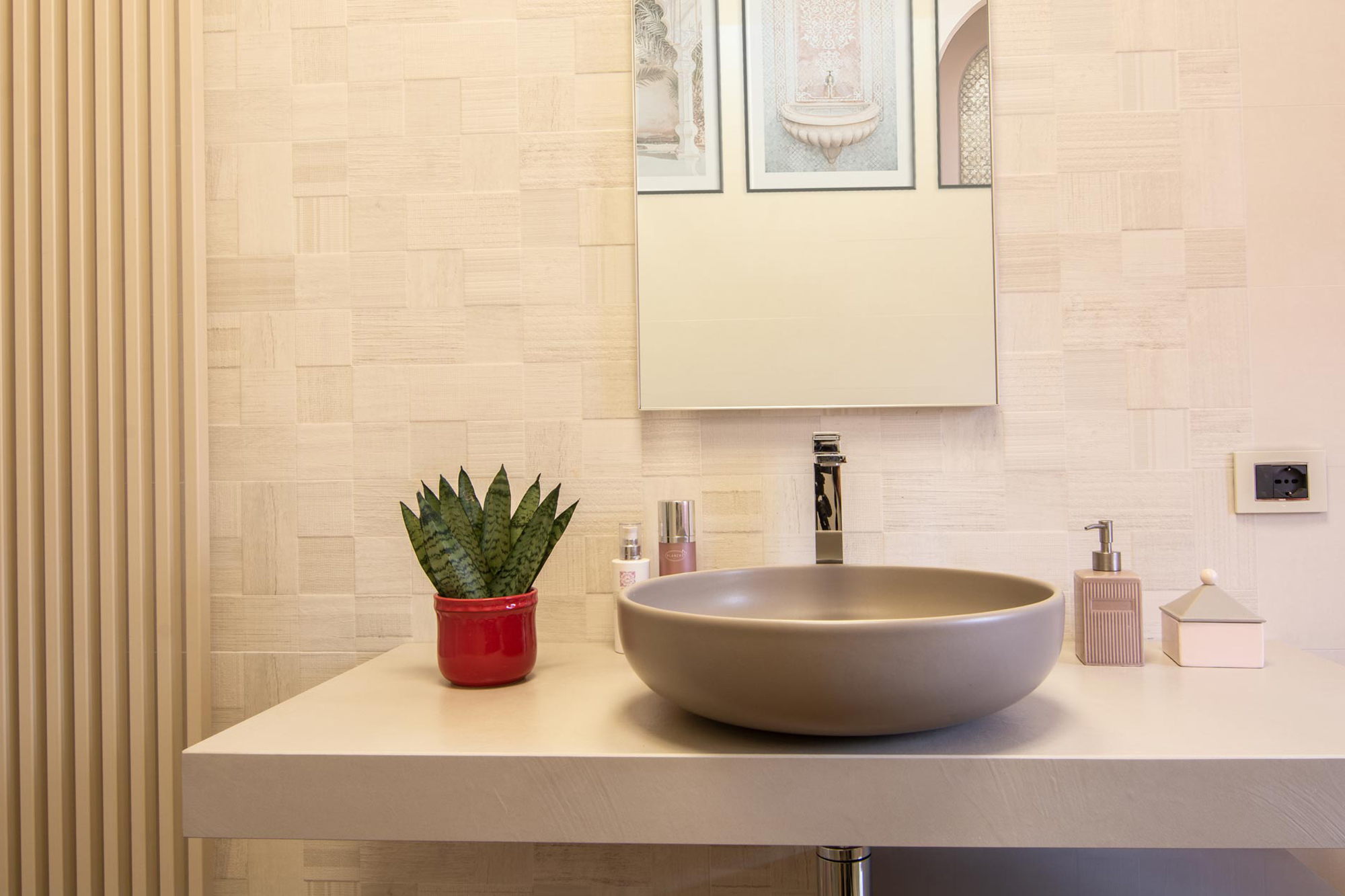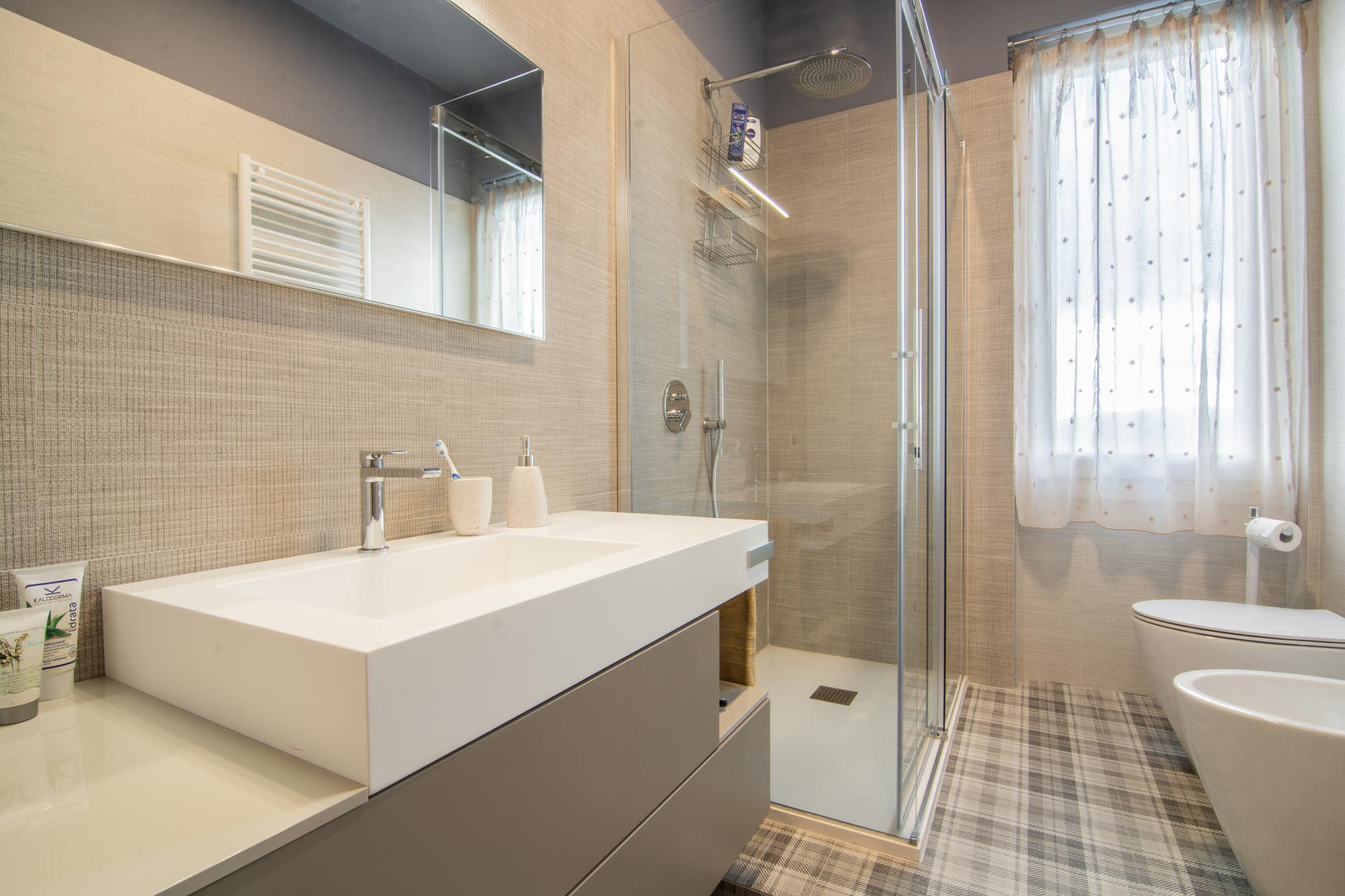 I due bagni dell’abitazione sono stati completamente rinnovati a partire dal tagli architettonico e dalla disposizione dei sanitari che non era molto funzionale. Nel bagno grande abbiamo posizionato una vasca freestanding in posizione centrale sotto la finestra, il bagno secondario è stato ampliato per inserirvi una doccia ampia (80x100) e un bel mobile lavabo. I sanitari sono dell’azienda Ceramica Cielo, modello Smile sospesi. Colorati per il bagno grande, bianchi per quello con doccia. Tutti i piatti doccia sono in resina e la vasca è in Live Tech. Pavimenti e rivestimenti in grès sono di Ceramica Sant’Agostino, serie Tailorart che ha la caratteristica di avere texture materiche che imitano il tessuto. I colori utilizzati per i soffitti dei bagni sono più scuri dei colori che utilizziamo di solito per rendere più accoglienti gli ambienti.