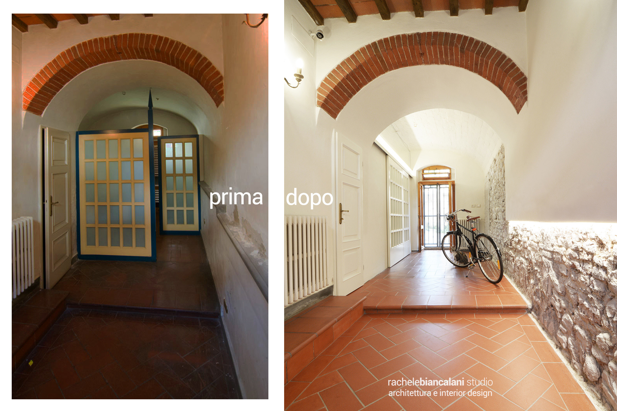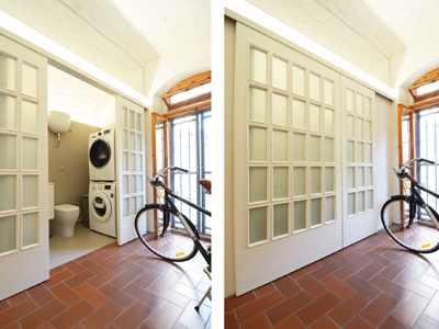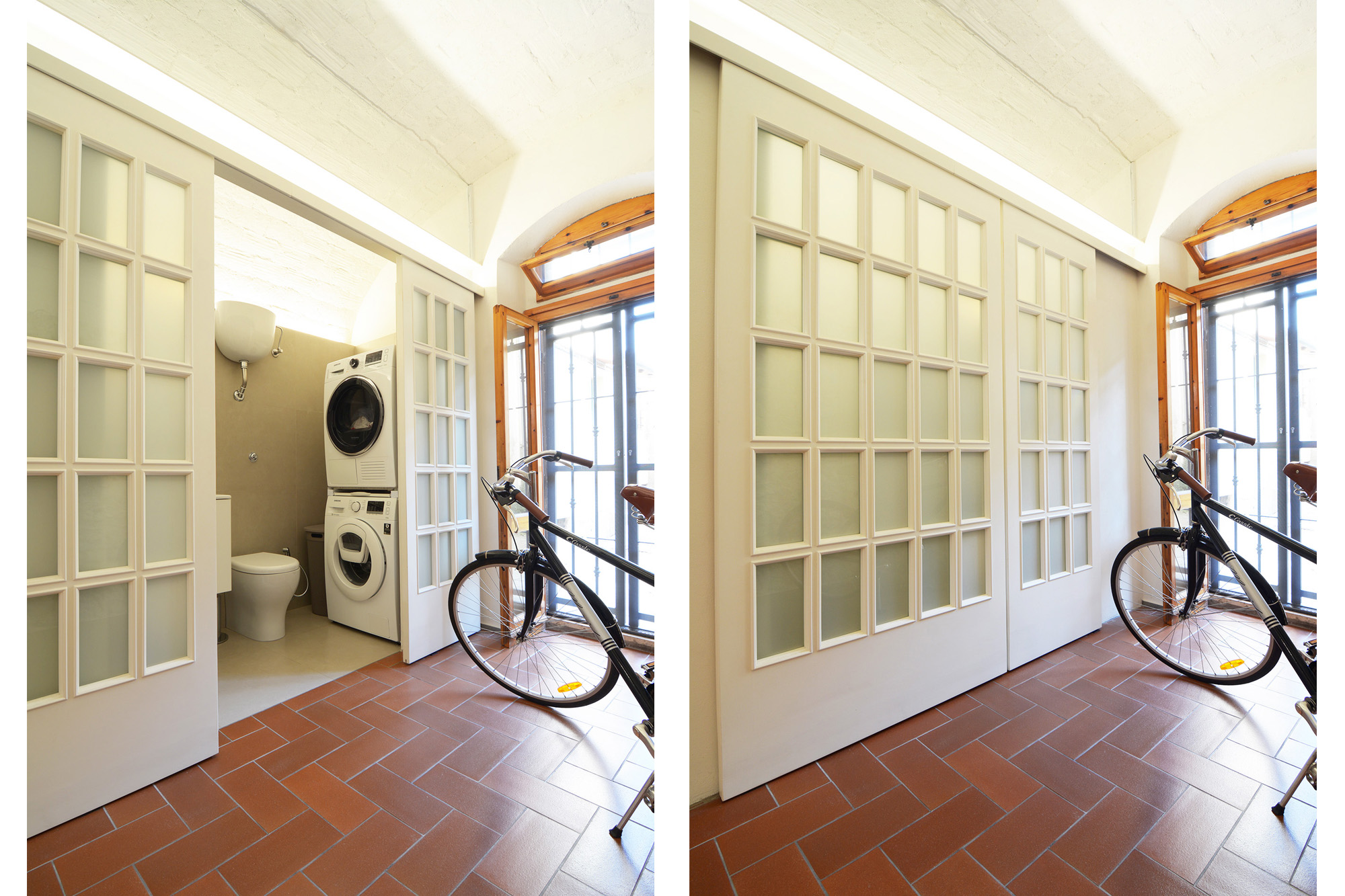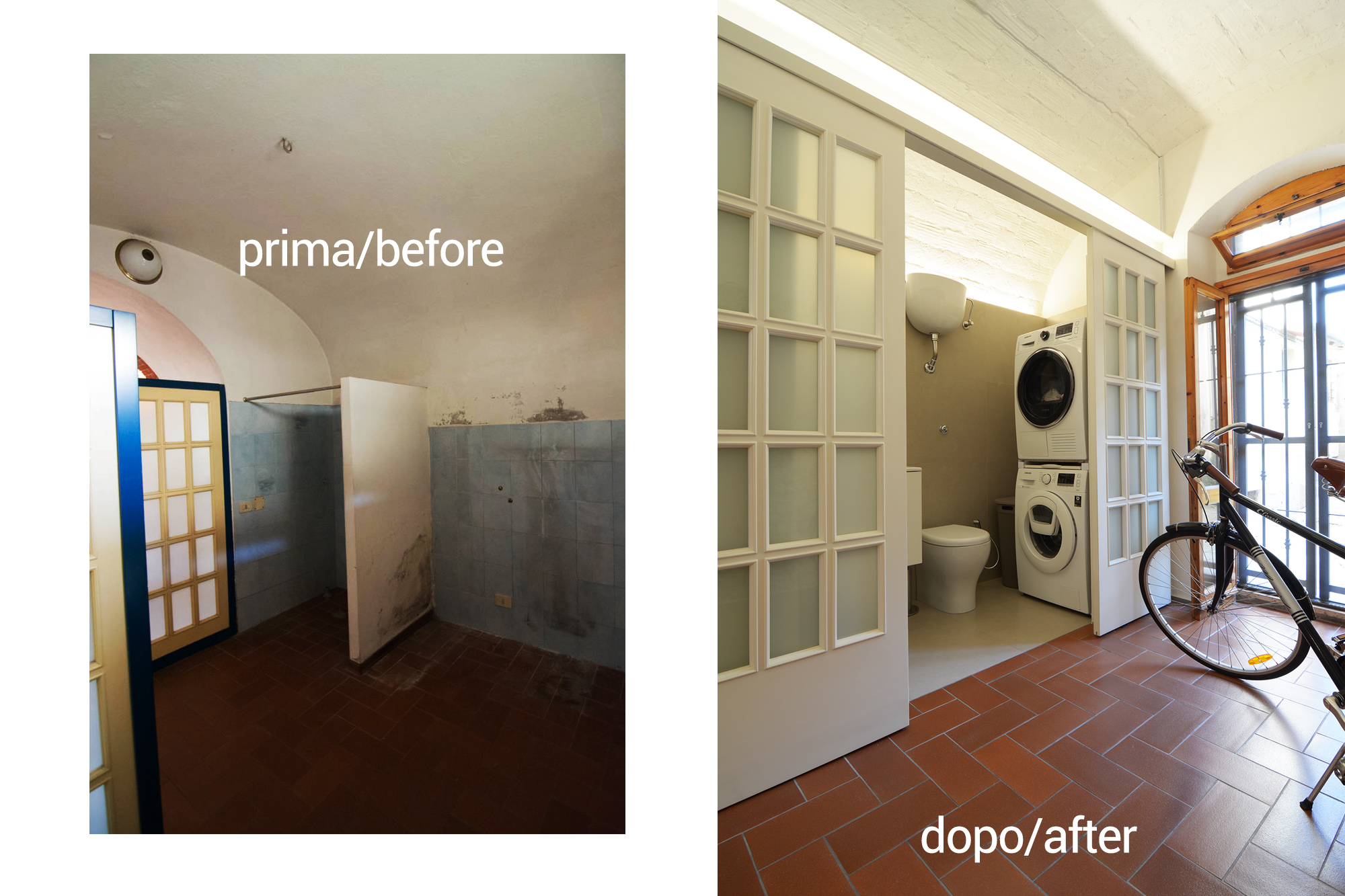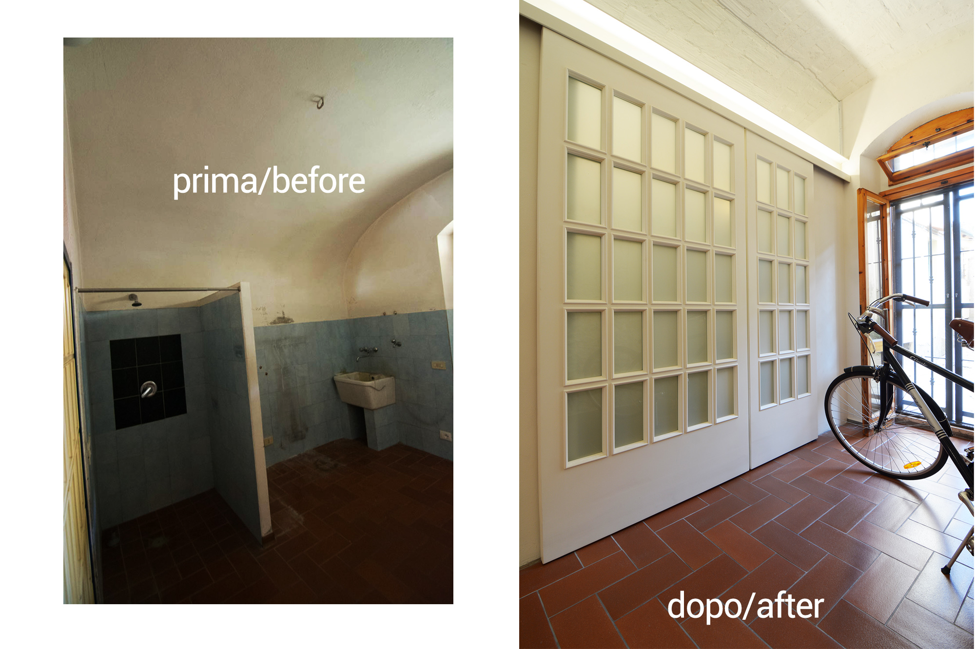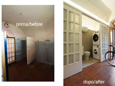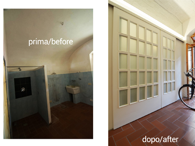 Il piano terra in particolar modo aveva un aspetto molto triste: due porte in legno e vetro all’inglese erano state dipinte di giallo e adattate tipo separé da dei telai in legno tinto di un improponibile blu che accostato al giallo era davvero spiacevole alla vista. Poiché le porte erano di buona fattura ho subito pensato di farle ridipingere di bianco e di utilizzarle: ecco che trovano posto sempre al piano terra come pannelli scorrevoli che separano l’ambiente bagno/lavanderia dal resto del piano terra. Per non spezzare la bellezza della volta a botte la parte soprastante il binario e la longarina è stata chiusa con un vetro trasparente. Al piano terra oltre alle brutture estetiche era presente tantissima umidità di risalita che aveva portato al distacco di porzioni di velo. Questo perché era stata costruita durante la ristrutturazione precedente una controparete in muratura all’interno della quale era stata inserita carta di giornale ed una guaina bituminosa; la parete aveva una “cimasa” in pietra serena... tutta questa struttura altro non faceva che far salire più su l’umidità proveniente dal sottosuolo.