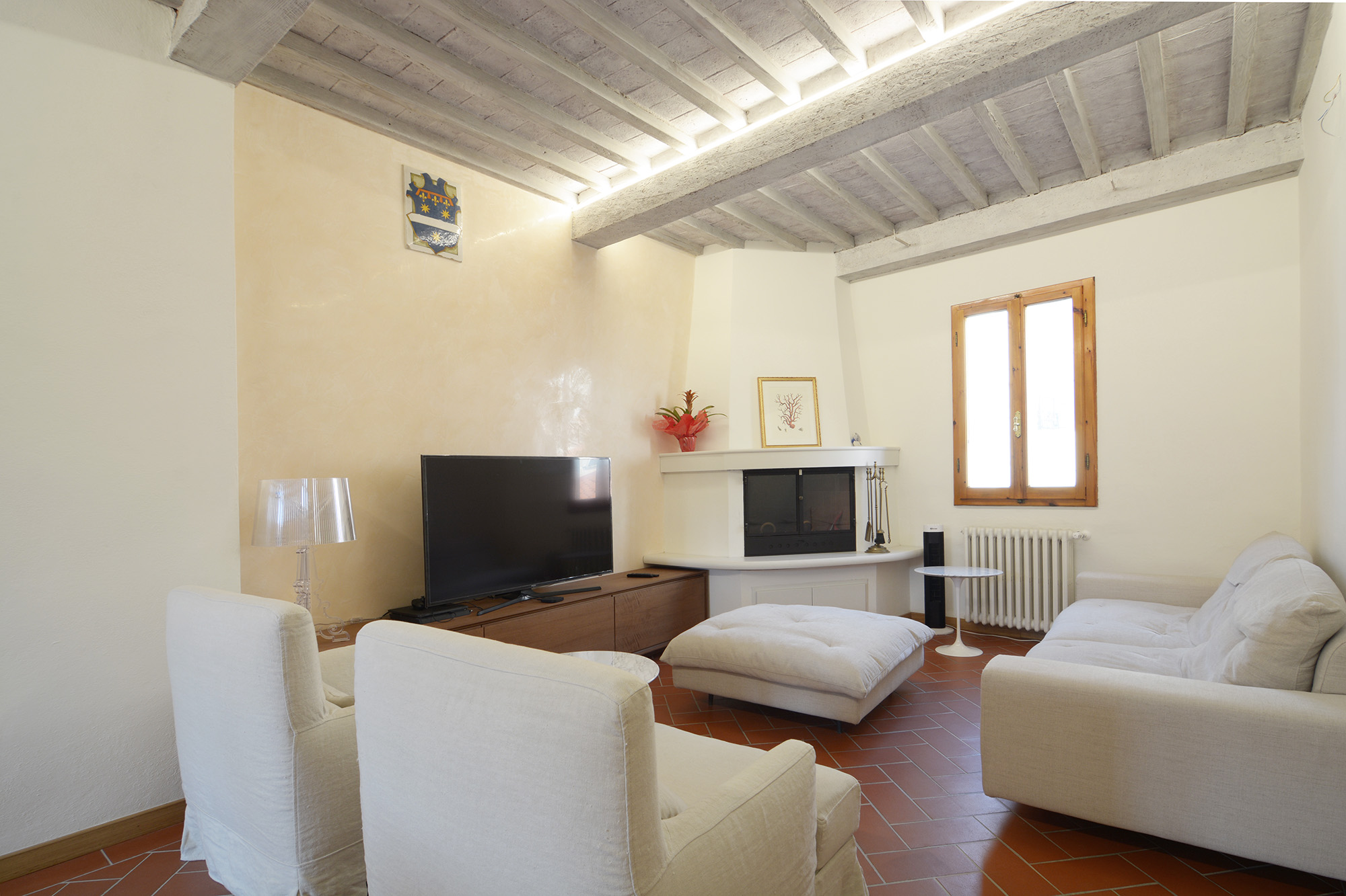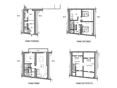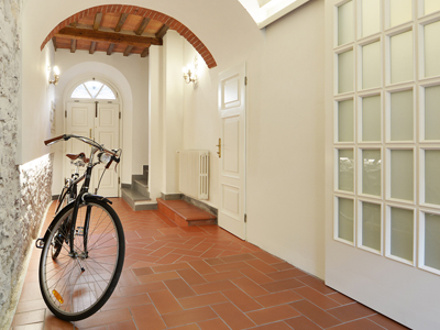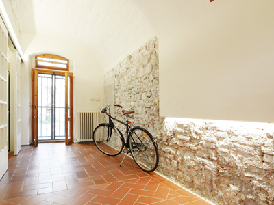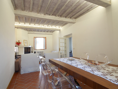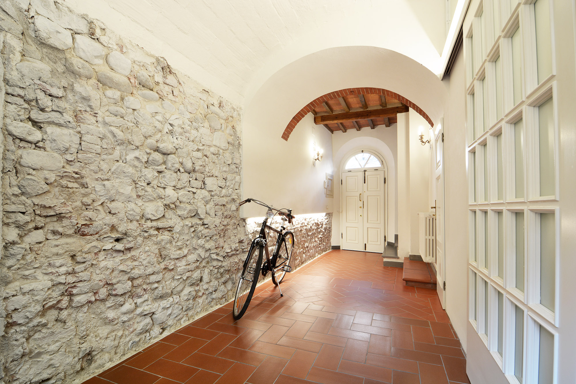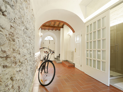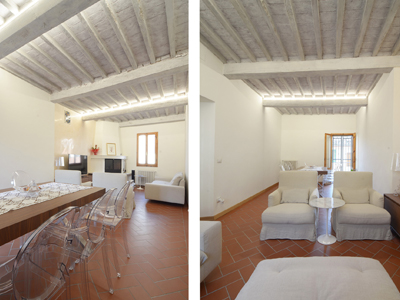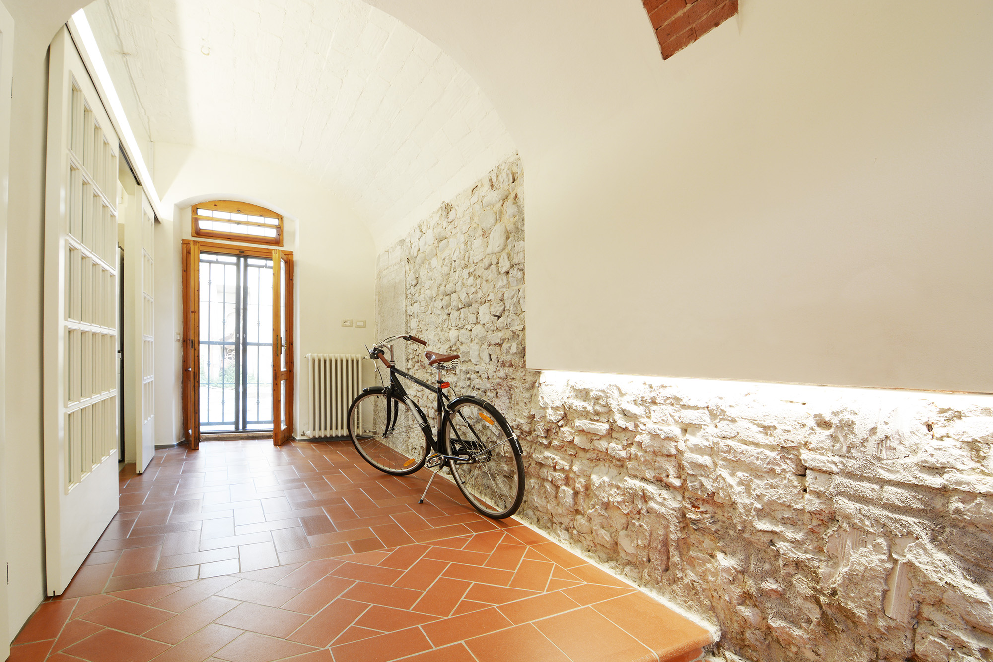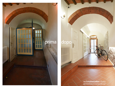 Il piano terra in particolar modo aveva un aspetto molto triste: due porte in legno e vetro all’inglese erano state dipinte di giallo e adattate tipo separé da dei telai in legno tinto di un improponibile blu che accostato al giallo era davvero spiacevole alla vista. Poiché le porte erano di buona fattura ho subito pensato di farle ridipingere di bianco e di utilizzarle: ecco che trovano posto sempre al piano terra come pannelli scorrevoli che separano l’ambiente bagno/lavanderia dal resto del piano terra. Per non spezzare la bellezza della volta a botte la parte soprastante il binario e la longarina è stata chiusa con un vetro trasparente. Al piano terra oltre alle brutture estetiche era presente tantissima umidità di risalita che aveva portato al distacco di porzioni di velo. Questo perché era stata costruita durante la ristrutturazione precedente una controparete in muratura all’interno della quale era stata inserita carta di giornale ed una guaina bituminosa; la parete aveva una “cimasa” in pietra serena... tutta questa struttura altro non faceva che far salire più su l’umidità proveniente dal sottosuolo.