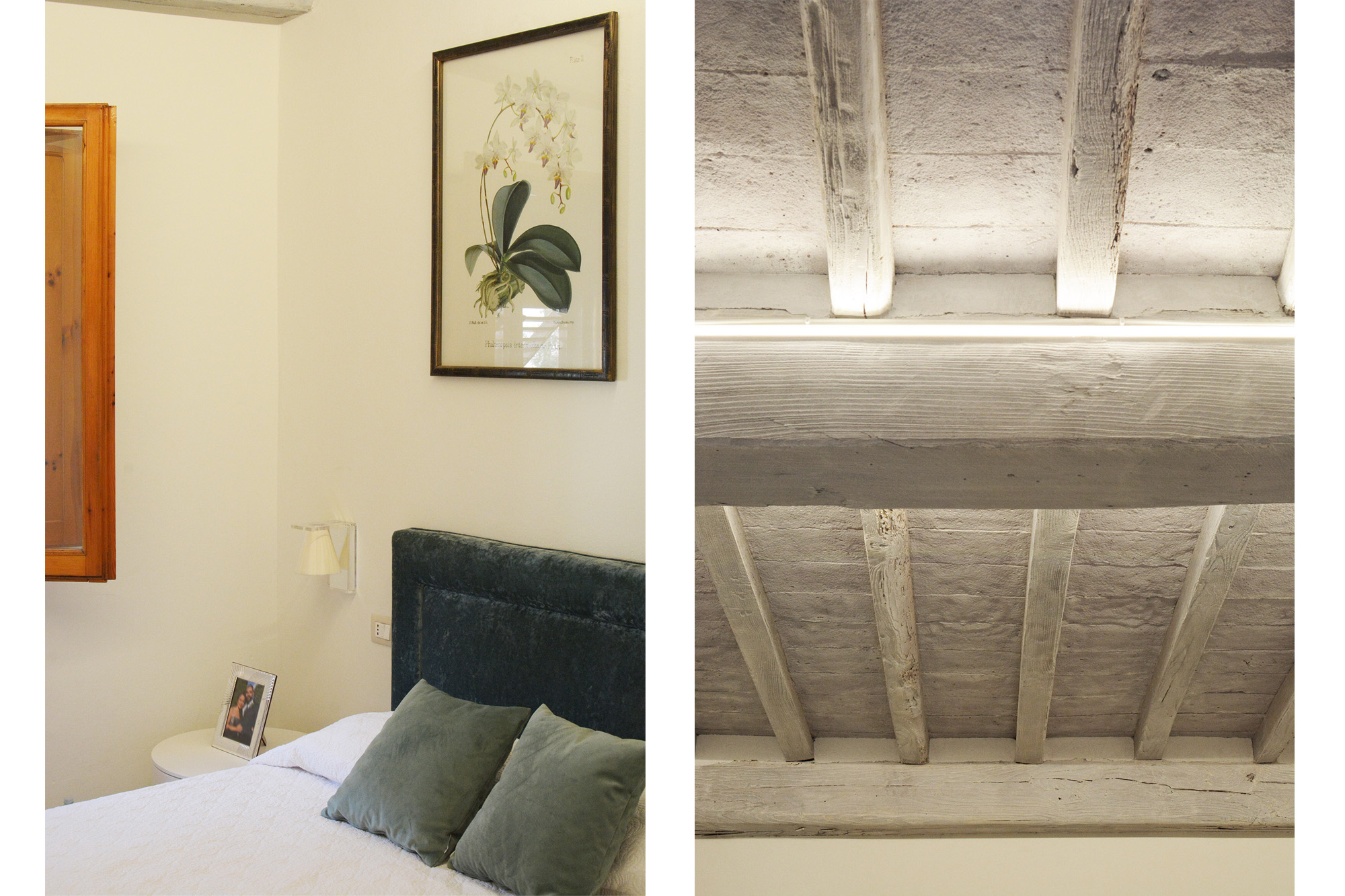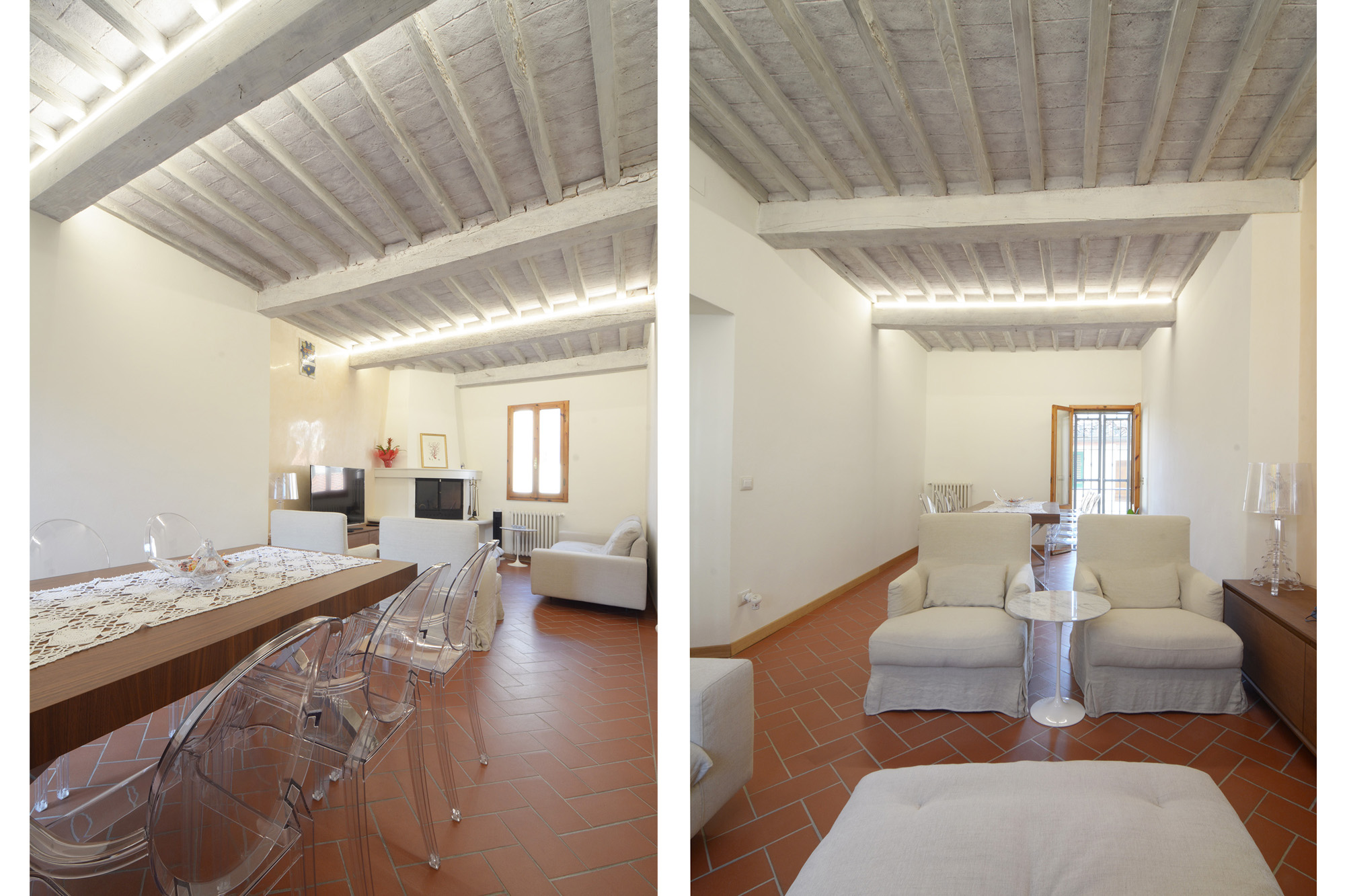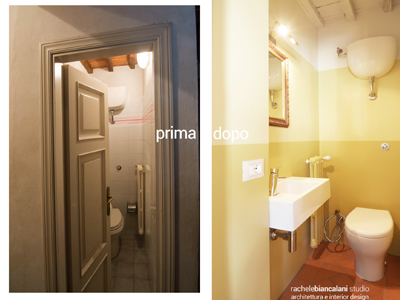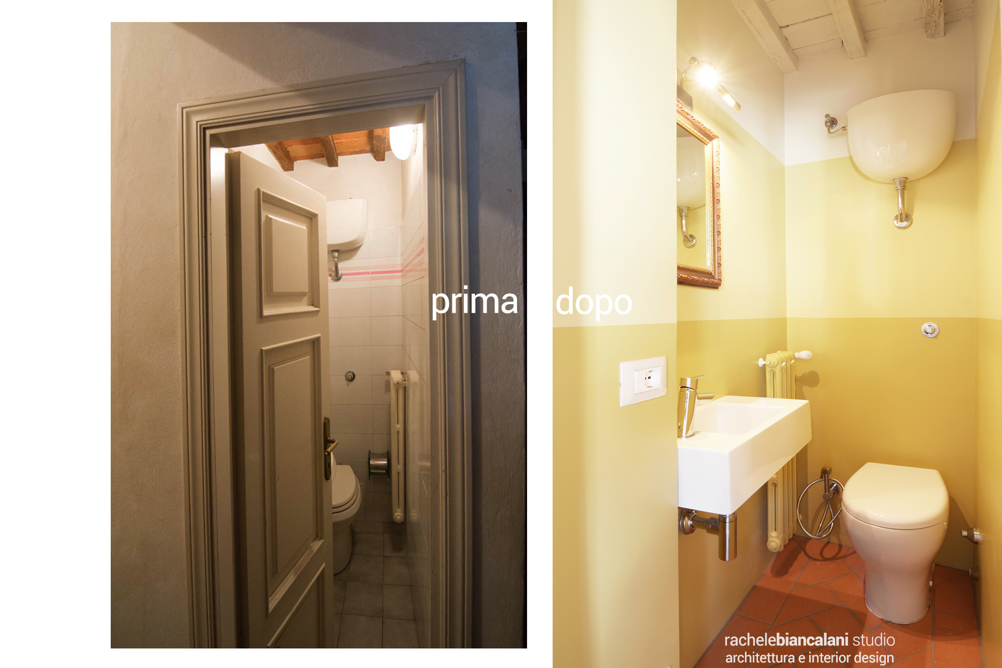 Al piano primo il piccolissimo bagno che si trovava nel vano scale è stato reso molto più funzionale utilizzando un piccolo lavabo ben posizionato, spostando wc e radiatore e invertendo la porta. Raramente in un bagno così piccolo avevo trovato tanti errori tutti in una volta! Il risultato era un ambiente non solo esteticamente sgradevole ma dal difficile utilizzo. Il rivestimento è stato demolito e sostituito con wallpaper di Kerakoll nei colori della nuova collezione firmata da Lissoni usata in esclusiva (non era in commercio nella grande distribuzione soprattutto in toscana). Anche in cucina abbiamo utilizzato resine e imbiancature Kerakoll Design nel colore WR03. In generale I soffitti con le travi a vista sono stati sbiancati tramite una velatura e vi sono state applicate delle strip led per potenziare l’illuminazione generale delle stanze che era piuttosto scarsa.
