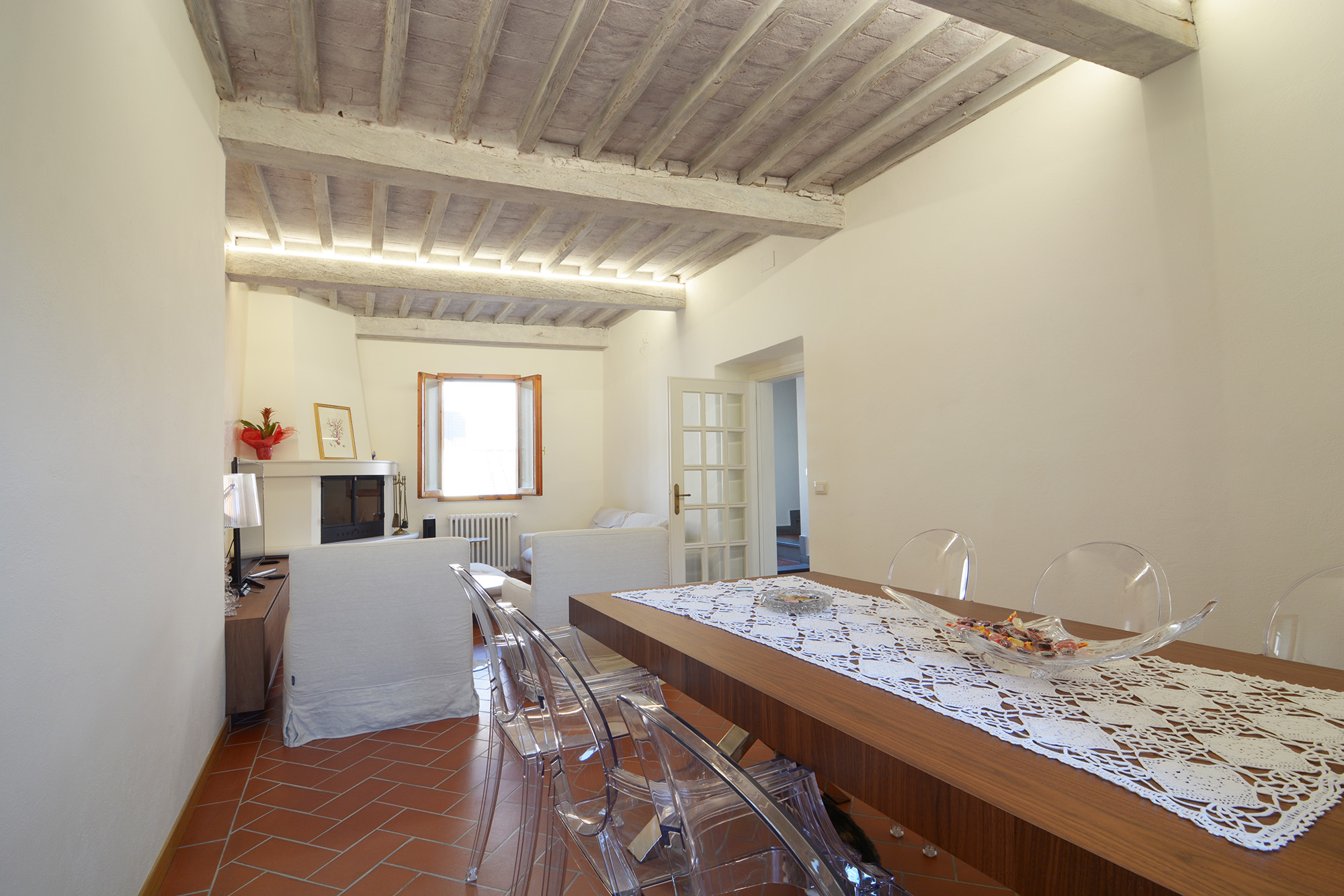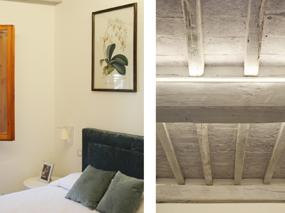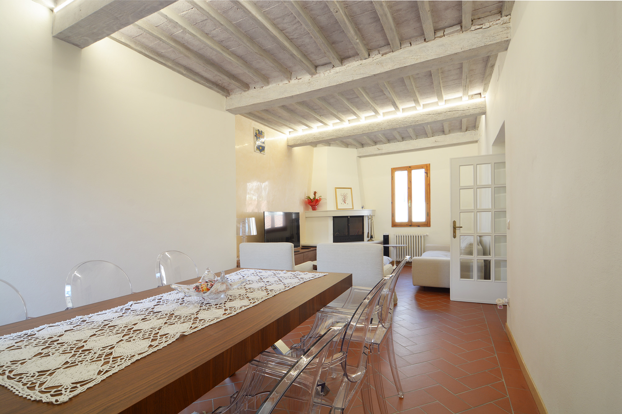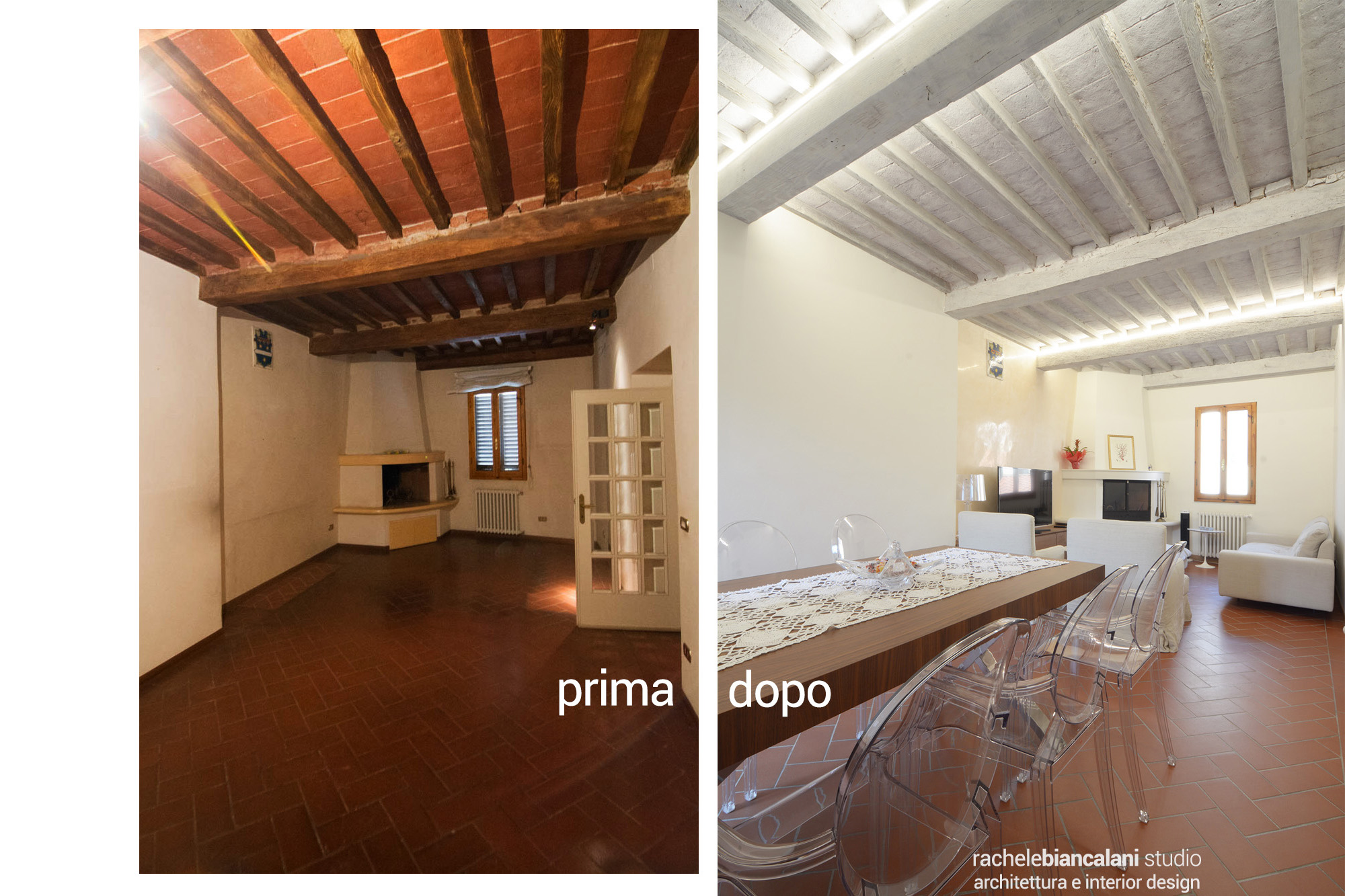Al piano primo il piccolissimo bagno che si trovava nel vano scale è stato reso molto più funzionale utilizzando un piccolo lavabo ben posizionato, spostando wc e radiatore e invertendo la porta. Raramente in un bagno così piccolo avevo trovato tanti errori tutti in una volta! Il risultato era un ambiente non solo esteticamente sgradevole ma dal difficile utilizzo. Il rivestimento è stato demolito e sostituito con wallpaper di Kerakoll nei colori della nuova collezione firmata da Lissoni usata in esclusiva (non era in commercio nella grande distribuzione soprattutto in toscana). Anche in cucina abbiamo utilizzato resine e imbiancature Kerakoll Design nel colore WR03. In generale I soffitti con le travi a vista sono stati sbiancati tramite una velatura e vi sono state applicate delle strip led per potenziare l’illuminazione generale delle stanze che era piuttosto scarsa.