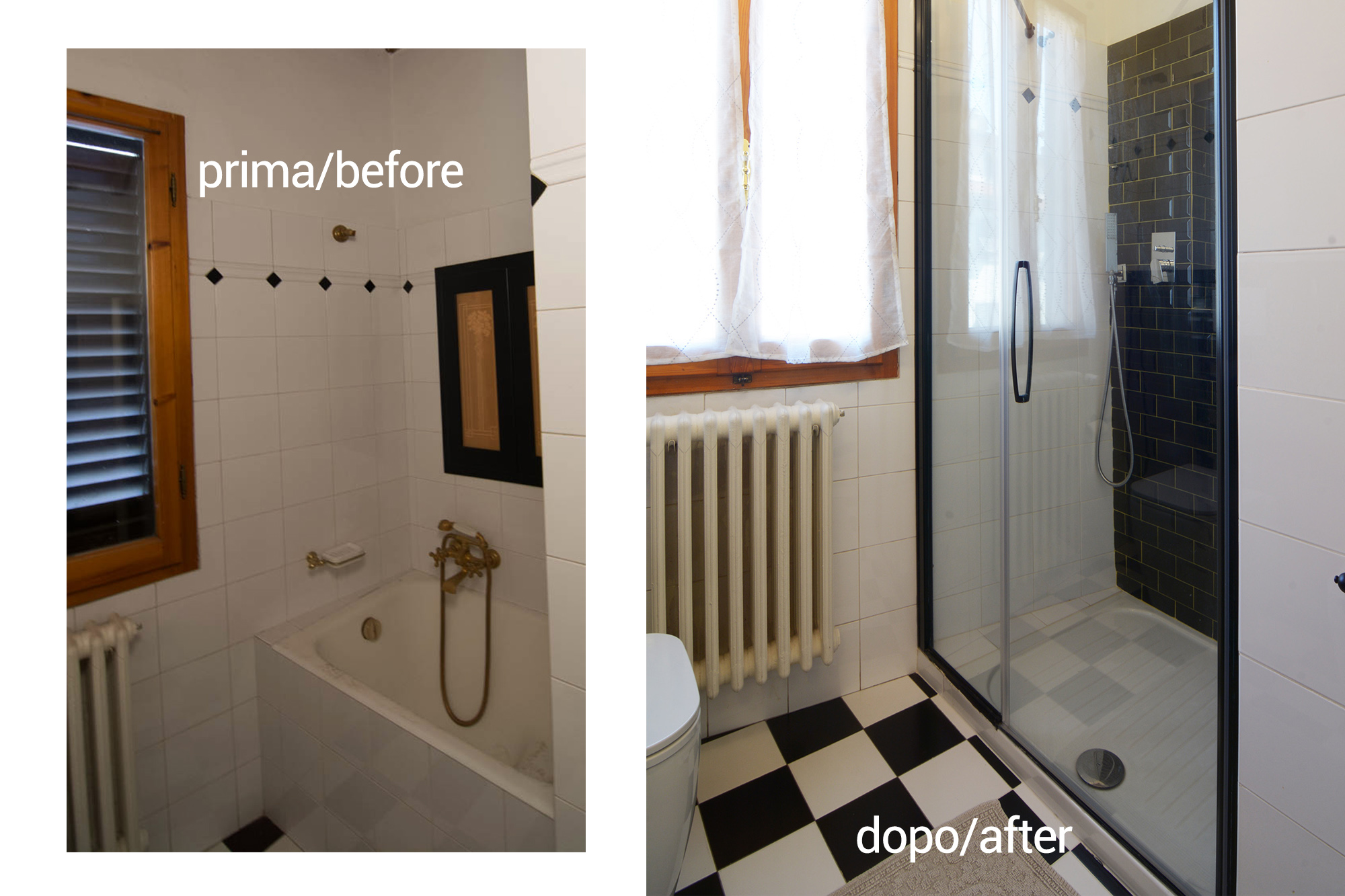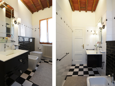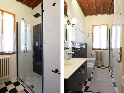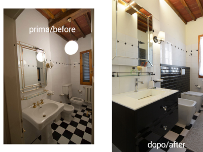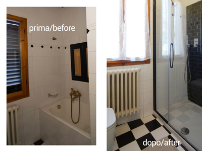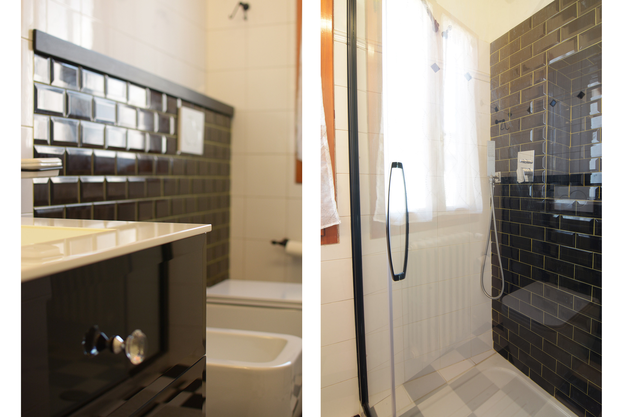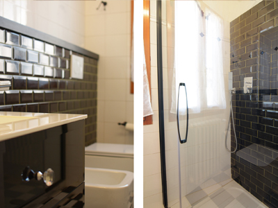 Uno dei lavori più difficili è stato quello fatto nel bagno bianco e nero del secondo piano: per non far salire il budget e per mantenere quanto di bello questo bagno aveva, abbiamo fatto dei piccoli interventi mirati, il che vuol dire da parte di muratore ed idraulico, lavorare con estrema cura e attenzione. Tutte le piastrelle sono state mantenute anche se si sono sostituiti tutti I sanitari e soprattutto la terribile vaschetta di 120 cm è stata sostituita da una grande doccia spaziosa e funzionale. Le nuove piastrelle utilizzate nere diamantate Ce-Sa sono state posate tipo muretto e abbiamo utilizzato uno stucco giallo limone per le fughe: un tocco di graziosa ironia voluto dalla padrona di casa!