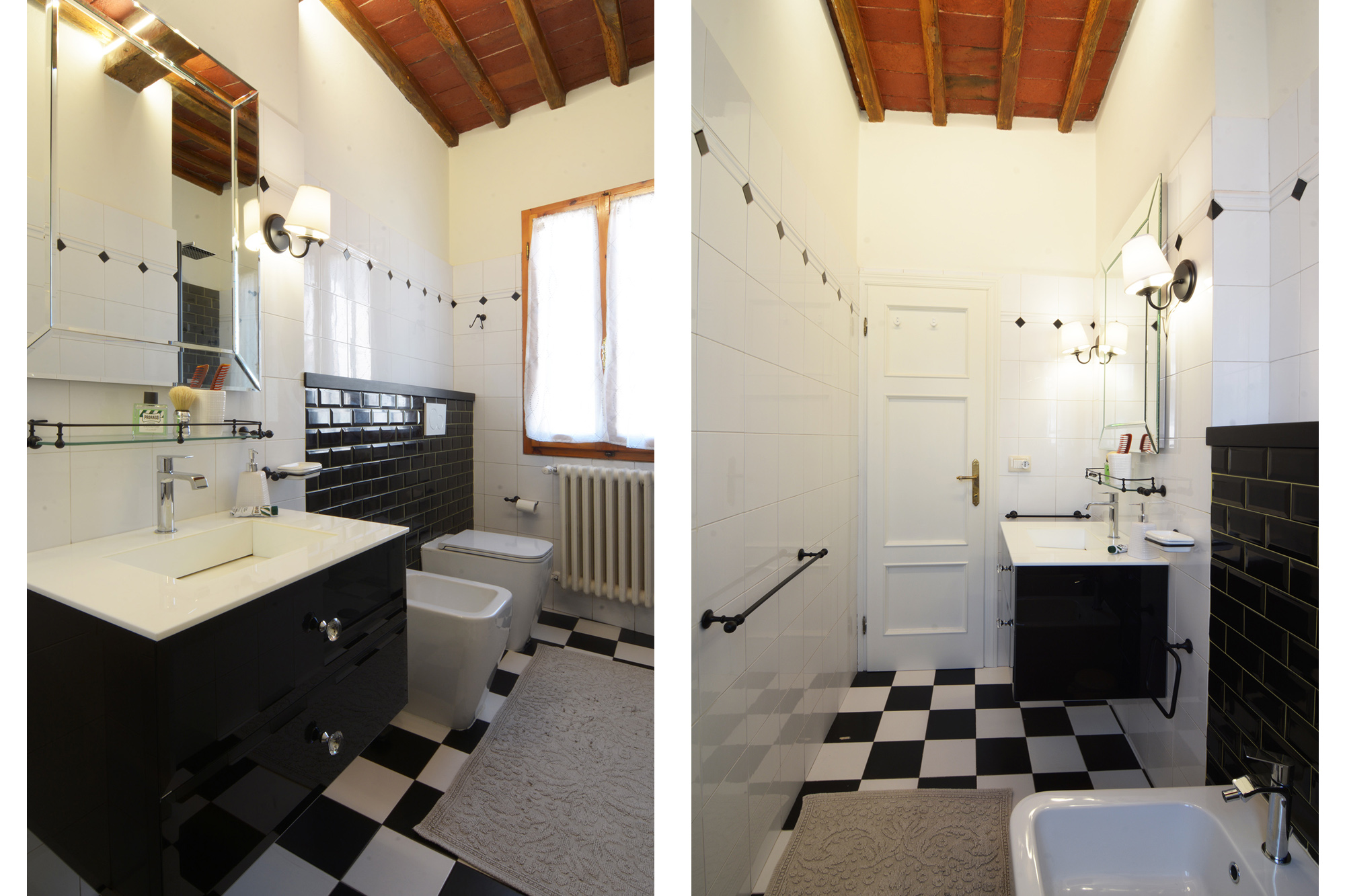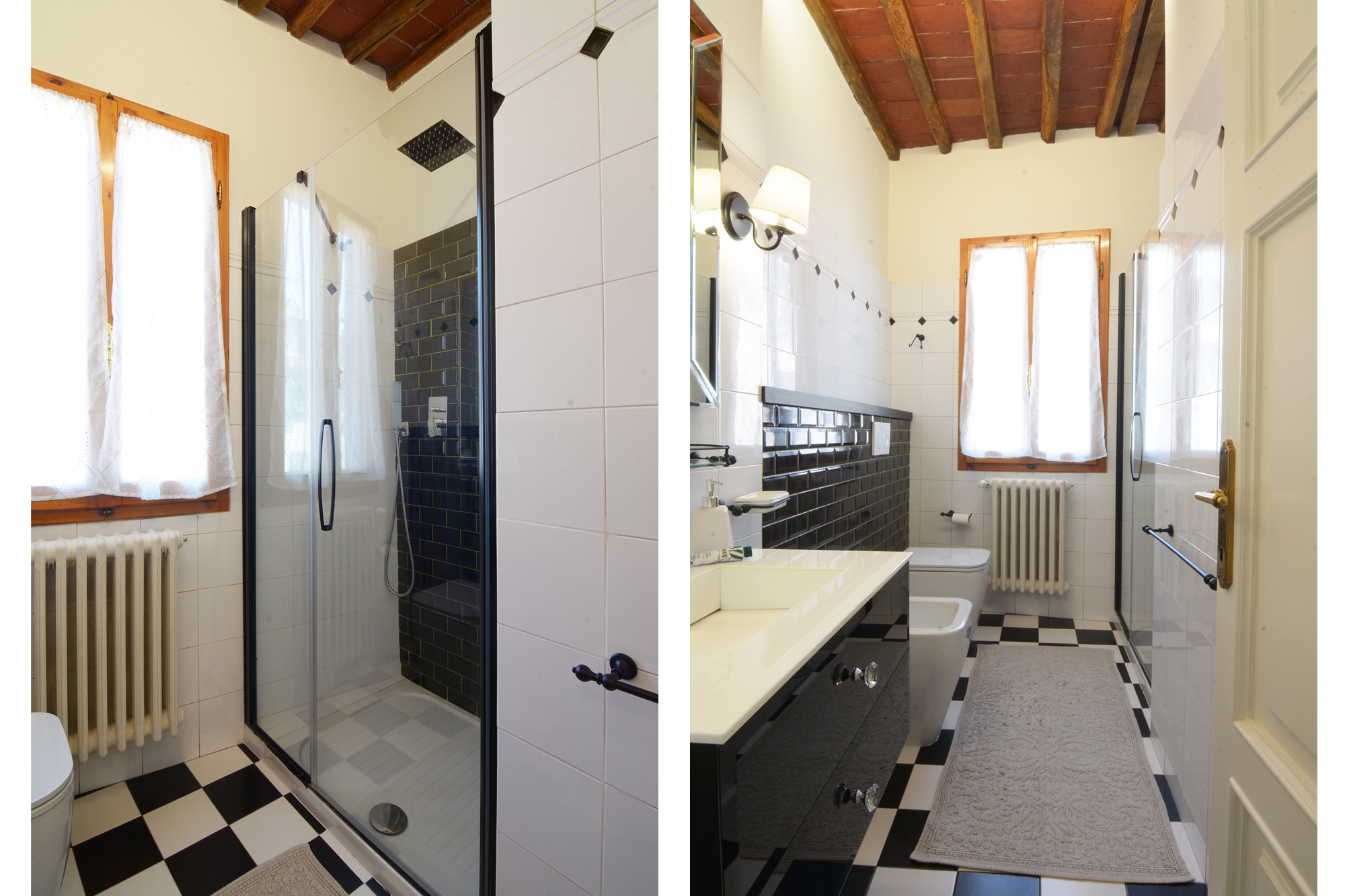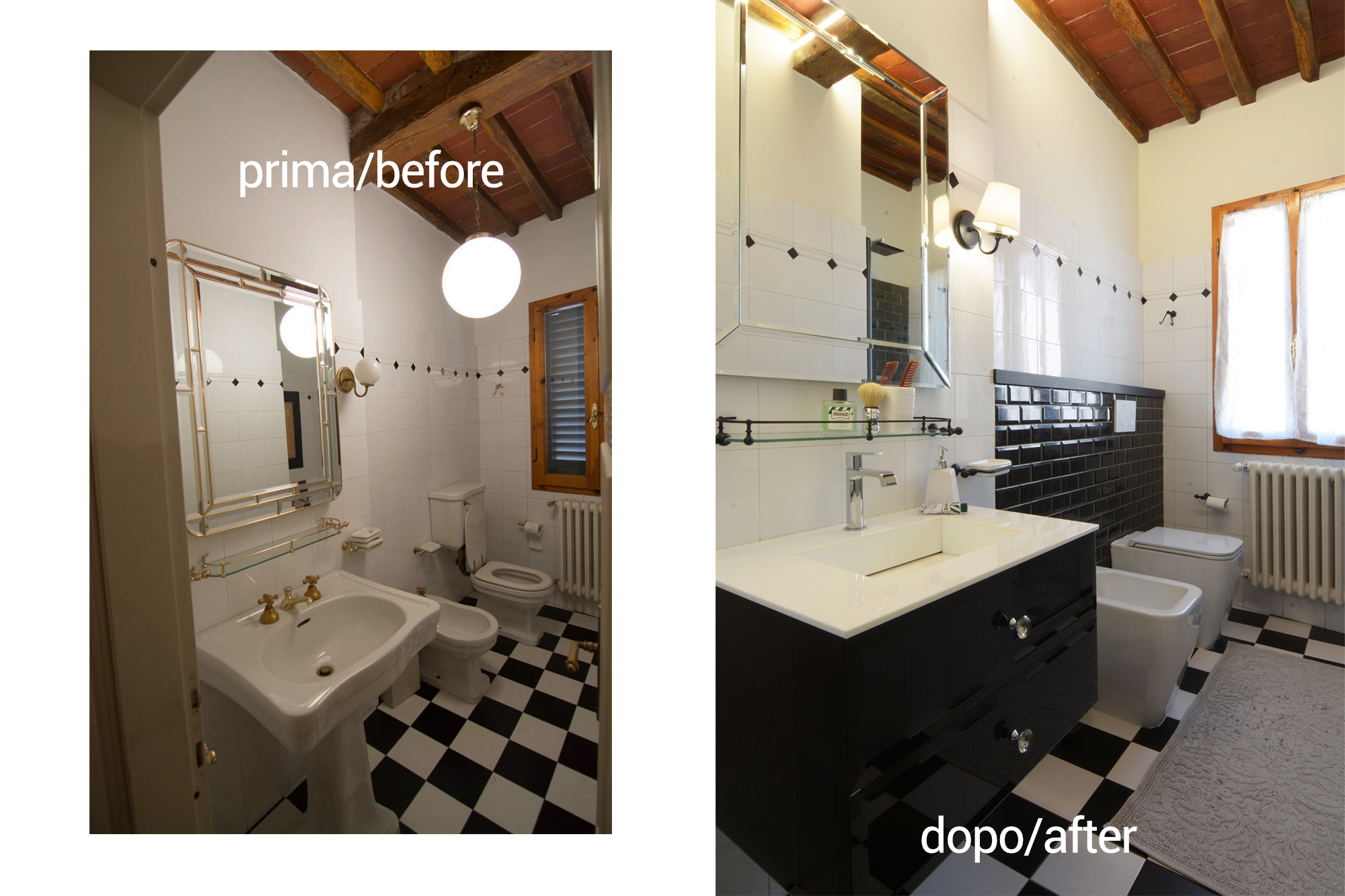 Uno dei lavori più difficili è stato quello fatto nel bagno bianco e nero del secondo piano: per non far salire il budget e per mantenere quanto di bello questo bagno aveva, abbiamo fatto dei piccoli interventi mirati, il che vuol dire da parte di muratore ed idraulico, lavorare con estrema cura e attenzione. Tutte le piastrelle sono state mantenute anche se si sono sostituiti tutti I sanitari e soprattutto la terribile vaschetta di 120 cm è stata sostituita da una grande doccia spaziosa e funzionale. Le nuove piastrelle utilizzate nere diamantate Ce-Sa sono state posate tipo muretto e abbiamo utilizzato uno stucco giallo limone per le fughe: un tocco di graziosa ironia voluto dalla padrona di casa!