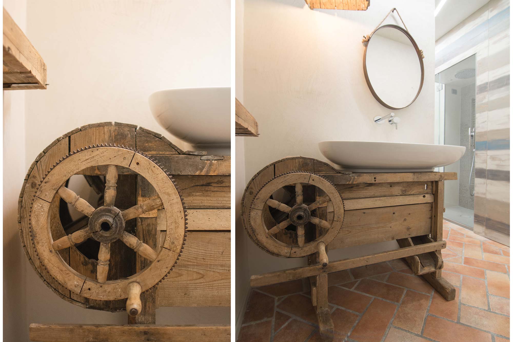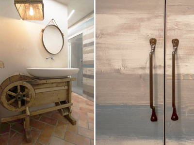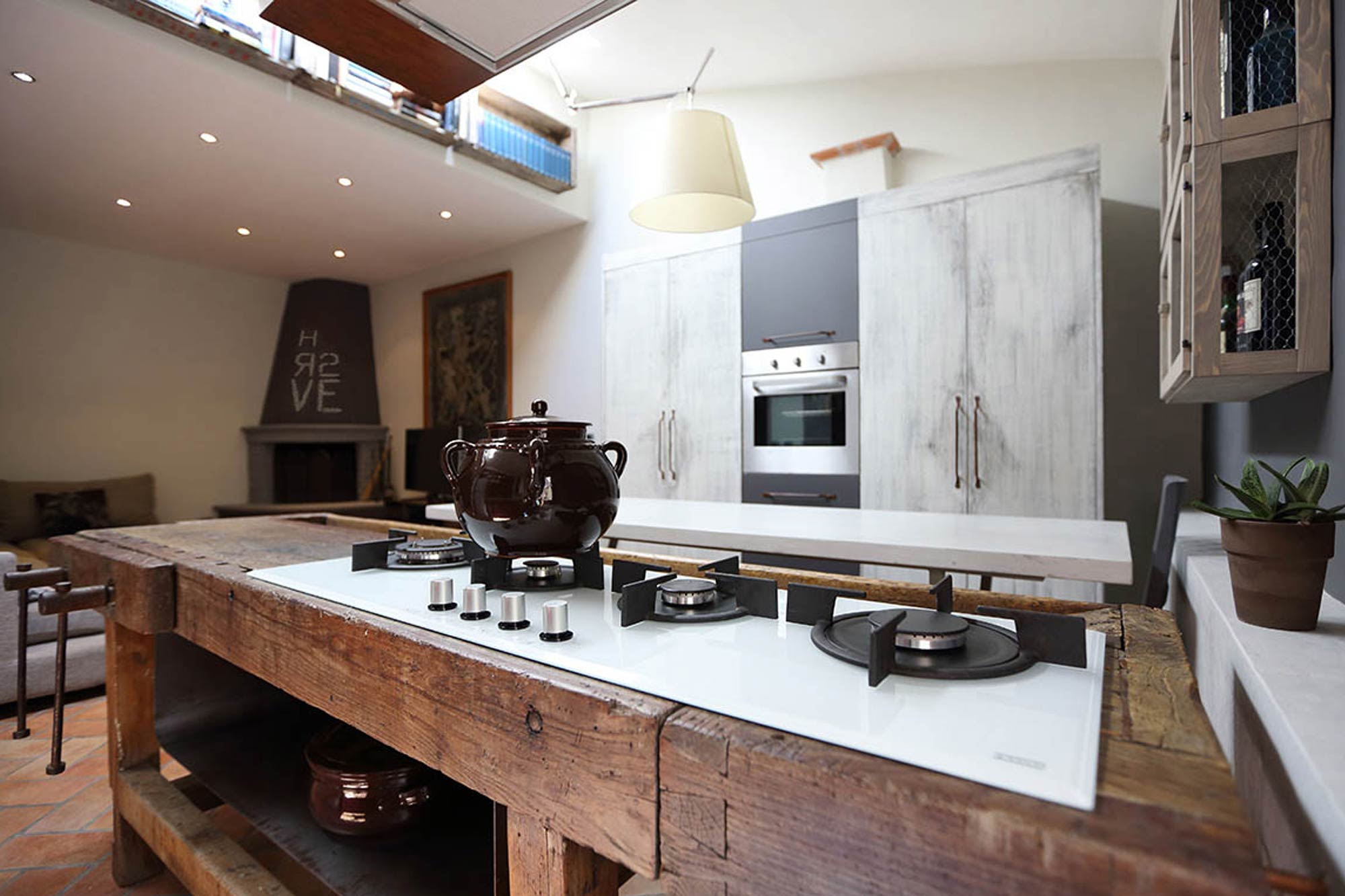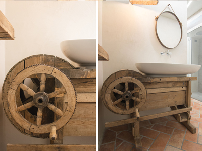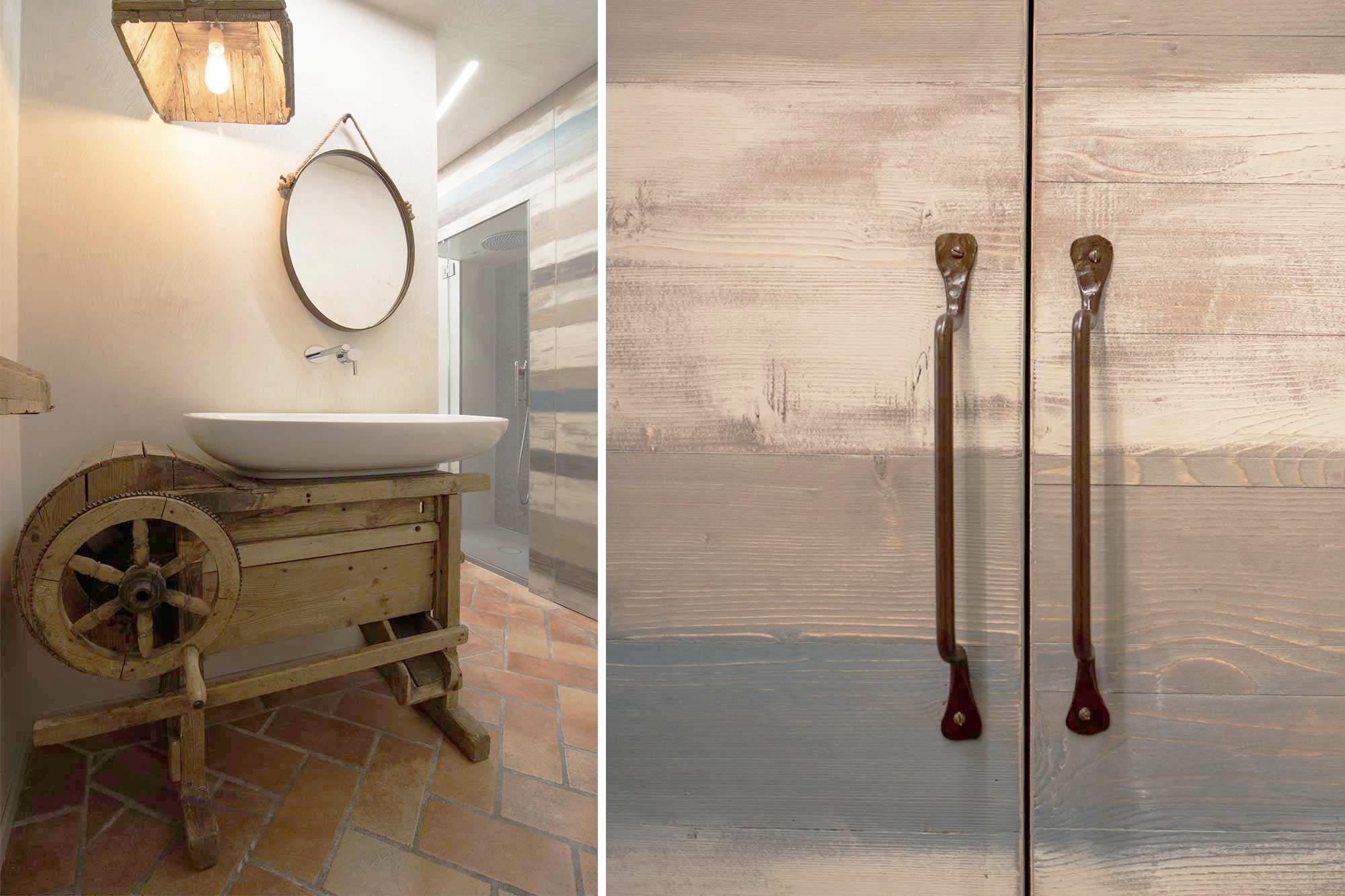 Legno, ferro e materiali di recupero sono stati il punto di partenza per il mood progettuale. Il piano dei fuichi è un vecchio tavolo da falegname riadattato, il mobile del bagno invece è stato realizzato modificando un vecchio attrezzo agricolo. Lo stesso dicasi per l'originale lampada del bagno. Progetto architettonico, interior design, lighting design, concept, home shopping e direzione del cantiere e direzione artistica dei lavori a cura di Rachele Biancalani Studio - Progetti e immagini coperti da Copyright All Rights reserved copyright 2013 © Rachele Biancalani - Foto Thomas Harris Photographer